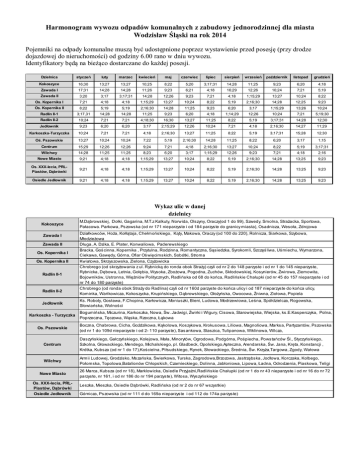 Harmonogram wywozu odpadów komunalnych z zabudowy jednorodzinnej dla miasta Wodzisław Śląski na rok 2014 Pojemniki na odpady komunalne muszą być udostępnione poprzez wystawienie przed posesję (przy drodze dojazdowej do nieruchomości) od godziny 6.00 rano w dniu wywozu. Identyfikatory będą na bieżąco dostarczane do każdej posesji. Dzielnica styczeń luty marzec kwiecień maj czerwiec lipiec sierpień wrzesień październik listopad grudzień Kokoszyce 16;30 13;27 13;27 10;25 8;22 5;20 3;17;31 14;28 11;25 9;23 6;20 4;18 Zawada I 17;31 14;28 14;28 11;26 9;23 6;21 4;18 16;29 12;26 10;24 7;21 5;19 Zawada II 3;20 3;17 3;17;31 14;28 12;26 9;23 7;21 4;18 1;15;29 13;27 10;24 8;22 Os. Kopernika I 7;21 4;18 4;18 1;15;29 13;27 10;24 8;22 5;19 2;16;30 14;28 12;25 9;23 Os. Kopernika II 8;22 5;19 5;19 2;16;30 14;28 11;25 9;23 6;20 3;17 1;15;29 13;26 10;24 Radlin II-1 3;17,31 14;28 14;28 11;25 9;23 6;20 4;18 1;14;29 12;26 10;24 7;21 5;19;30 Radlin II-2 10;24 7;21 7;21 4;18;30 16;30 13;27 11;25 8;22 5;19 3;17;31 14;28 12;30 Jedłownik 9;23 6;20 6;20 3;17 2;15;29 12;26 10;24 7;21 4;18 2;16;30 14;27 11;29 Karkoszka-Turzyczka 10;24 7;21 7;21 4;18 2;16;30 13;27 11;25 8;22 5;19 3;17;31 15;28 12;30 Oś. Pszowskie 13;27 10;24 10;24 7;22 5;19 2;16;30 14;28 11;25 8;22 6;20 3;17 1;15 Centrum 15;29 12;26 12;26 9;24 7;21 4;18 2;16;30 13;27 10;24 8;22 5;19 3;17;31 Wilchwy 14;28 11;25 11;25 8;23 6;20 3;17 1;15;29 12;26 9;23 7;21 4;18 2;16 Nowe Miasto 9;21 4;18 4;18 1;15;29 13;27 10;24 8;22 5;19 2;16;30 14;28 13;25 9;23 Os. XXX-lecia, PRLPiastów, Dąbrówki 9;21 4;18 4;18 1;15;29 13;27 10;24 8;22 5;19 2;16;30 14;28 13;25 9;23 Osiedle Jedłownik 9;21 4;18 4;18 1;15;29 13;27 10;24 8;22 5;19 2;16;30 14;28 13;25 9;23 Wykaz ulic w danej dzielnicy Kokoszyce Zawada I Zawada II Os. Kopernika I Os. Kopernika II Radlin II-1 M.Dąbrowskiej, Dołki, Gagarina, M.T.z Kalkuty, Norwida, Olszyny, Oraczy(od 1 do 99), Szwedy, Smolna, Strażacka, Sportowa, Pałacowa. Parkowa, Ps zows ka (od nr 171 nieparzyste i od 184 parzys te do granicy miasta), Osadnicza, Wesoła, Zdrojowa Działkowców, Hoża, Kołłątaja, Chełmońs kiego, Kąty, Makowa, Oraczy (od 100 do 220), Rolnicza, Siarkowa, Szybowa, Młodzieżowa Długa, A. Dzika, E. Plater, Konwaliowa, Paderews kiego Bracka, Goś cinna, Kopernika , Przytulna, Rodzinna, Romantyczna, Sąsiedzka, Syrokomli, Szczęś liwa, Uśmiechu, Wymarzona, Ciekawa, Gawędy, Górna, Ofiar Oś więcimskich, Sobótki, Stroma Kwiatowa, Skrzyszowska, Zielona, Czyżowicka Chrobrego (od skrzyżowania z ul. Rybnicką do ronda obok Straży) czyli od nr 2 do 148 parzyste i od nr 1 do 145 nieparzyste, Rybnicka, Dębowa, Letnia, Gołębia, Wysoka, Zbożowa, Pogodna, Zuchów, Skłodowskiej, Kosynierów, Żwirowa, Ziemowita, Bojowników, Ustronna, Więźniów Politycznych, Radlińs ka od 68 do końca, Radlińskie Chałupki (od nr 45 do 157 nieparzyste i od nr 74 do 180 parzyste) Radlin II-2 Chrobrego (od ronda obok Straży do Radlina) czyli od nr 160d parzyste do końca ulicy i od 187 nieparzyste do końca ulicy, Kominka, Wańkowicza, Kokoszycka, Krupińskiego, Dąbrows kiego, Głożyńs ka, Owocowa, Żniwna, Ziołowa, Popiela Jedłownik Ks. Roboty, Gosława, F.Chopina, Karłowicza, Moniuszki, Bieni, Ludowa, Modrzewiowa, Leśna, Spółdzielcza, Rogowska, Słowiańska, Wolnoś ci Karkoszka - Turzyczka Bogumińska, Miczurina, Karkos zka, Nowa, Św. Jadwigi, Żwirki i Wigury, Cisowa, Starowiejska, Wiejska, ks.E.Kasperczyka, Polna, Poprzeczna, Tęczowa, Wąska, Rzeczna, Łąkowa Os. Pszowskie Boczna, Chabrowa, Cicha, Goździkowa, Kąkolowa, Kos zykowa, Krokusowa, Liliowa, Magnoliowa, Marks a, Partyzantów, Pszowska (od nr 1 do 109d nieparzyste i od 2- 110 parzyste), Sas ankowa, Staszica, Tulipanowa, Wiklinowa, Wilcza, Centrum Daszyńskiego, Gałczyńskiego, Kolejowa, Mała, Minorytów, Ogrodowa, Podgórna, Pośpiecha, Powstańców Śl., Styczyńs kiego, Szkolna, Głowackiego, Mendego, Michals kiego, pl. Gladbeck, Opolskiego,Apteczna, Arendarska, Św. Jana, Kręta, Konstancji , Krótka, Kubsza (od nr 1 do 17),Kościelna, Piłsudskiego, Rynek, Słowackiego, Średnia, Św. Krzyża,Targowa, Zgody, Wałowa Wilchwy Arm ii Ludowej, Grodzisko, Ms zańs ka, Świerkowa, Turska, Zagrodowa,Brzozowa, Jastrzębska, Jodłowa, Korczaka, Kolbego, Połomska, Topolowa,Batalionów Chłops kich, Czarnieckiego, Dolinna, Jabłoniowa, Lipowa, Ładna, Odrodzenia, Piaskowa, Teligi Nowe Miasto 26 Marca, Kubsza (od nr 18), Marklowicka, Osiedle Przyjaźni,Radlińskie Chałupki (od nr 1 do nr 43 nieparzyste i od nr 16 do nr 72 parzys te, nr 161, i od nr 186 do nr 194 parzyste), Witosa, Wys zyńskiego Os. XXX-lecia, PRLPiastów, Dąbrówki Osiedle Jedłownik Leszka, Mieszka, Osiedle Dąbrówki, Radlińska (od nr 2 do nr 67 wszystkie) Górnicza, Ps zows ka (od nr 111 d do 169a nieparzyste i od 112 do 174a parzys te) Harmonogram wywozu odpadów budowlanych i rozbiórkowych na terenie Miasta Wodzisławia Śląskiego w 2014 r. Odpady budowlane i rozbiórkowe wytworzone poza terenami budowy, właściciele nieruchomości mogą umieszczać w kontenerach ustawionych na terenie Miasta w poniżej wskazanych terminach oraz lokalizacjach. DZIELNICA DATA WYSTAWIENIA KONTENERA LOKALIZACJA WYSTAWIENIA KONTENERA MIESIĄC MIESIĄC STARE MIASTO 8 kw iecień 8 październik Parking pw . Podw yższenia Krzyża przy ul. Pszow skiej NOWE MIASTO 4 kw iecień 17 w rzesień Przy wjeździe na osiedle Przyjaźni od ul. Armii Krajowej KOKOSZYCE 9 kw iecień 9 październik Przy OSP Kokoszyce WILCHWY 10 kw iecień 10 październik Na obiekcie Klubu Sport owego „Wicher” RADLIN II 18 marzec 16 w rzesień Na parkingu przy Kościele pw. Św. Izydora ZAWADA 19 marzec 17 w rzesień Na parkingu przy ul. Młodzieżowej naprzeciw szkoły JEDŁOWNIK OSIEDLE 11 kw iecień 18 w rzesień 18 kw iecień 19 w rzesień 20 marzec 18 w rzesień OS. XXX-LECIA PRL, PIASTÓW, DĄBRÓWKI JEDŁOWNIKTURZYCZKAKARKOSZKA Parking przy ul. Górniczej (obok sklepu „Summercha”) Parking przy blok