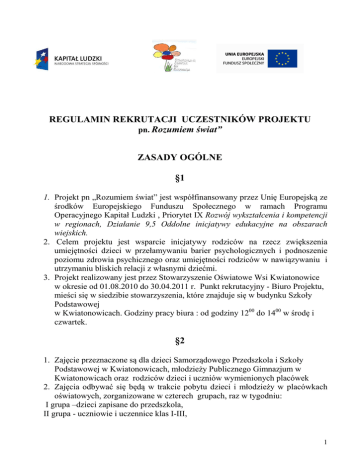 REGULAMIN REKRUTACJI UCZESTNIKÓW PROJEKTU pn. Rozumiem świat” ZASADY OGÓLNE §1 1. Projekt pn „Rozumiem świat” jest współfinansowany przez Unię Europejską ze środków Europejskiego Funduszu Społecznego w ramach Programu Operacyjnego Kapitał Ludzki , Priorytet IX Rozwój wykształcenia i kompetencji w regionach, Działanie 9,5 Oddolne inicjatywy edukacyjne na obszarach wiejskich. 2. Celem projektu jest wsparcie inicjatywy rodziców na rzecz zwiększenia umiejętności dzieci w przełamywaniu barier psychologicznych i podnoszenie poziomu zdrowia psychicznego oraz umiejętności rodziców w nawiązywaniu i utrzymaniu bliskich relacji z własnymi dziećmi. 3. Projekt realizowany jest przez Stowarzyszenie Oświatowe Wsi Kwiatonowice w okresie od 01.08.2010 do 30.04.2011 r. Punkt rekrutacyjny - Biuro Projektu, mieści się w siedzibie stowarzyszenia, które znajduje się w budynku Szkoły Podstawowej w Kwiatonowicach. Godziny pracy biura : od godziny 1200 do 1400 w środę i czwartek. §2 1. Zajęcie przeznaczone są dla dzieci Samorządowego Przedszkola i Szkoły Podstawowej w Kwiatonowicach, młodzieży Publicznego Gimnazjum w Kwiatonowicach oraz rodziców dzieci i uczniów wymienionych placówek 2. Zajęcia odbywać się będą w trakcie pobytu dzieci i młodzieży w placówkach oświatowych, zorganizowane w czterech grupach, raz w tygodniu: I grupa –dzieci zapisane do przedszkola, II grupa - uczniowie i uczennice klas I-III, 1 III grupa- uczniowie i uczennice klas VI-VI, IV grupa- uczniowie i uczennice klas I-III PG. 3. Zajęcia dla matek i ojców odbędą się w V grupie w trakcie 6 spotkań dla 3 zespołów rodziców, po 6 osób w każdym zespole. §3 1. Rekrutacja odbywać się będzie trzyetapowo, rozpocznie się 1 sierpnia i trwać będzie do 31 sierpnia 2010 r.; I etap-akcja informacyjno-promocyjna, II etap- wyłonienie uczestników, III etap- nabór uczestników. 2. Rekrutację przeprowadzi biuro projektu, we współpracy z przedszkolem i szkołą. 3. Przy rekrutacji będzie stosowana zasada zachowania równości szans i płci. 4. Regulamin rekrutacji dostępny będzie w biurze projektu. KRYTERIA UCZESTNICTWA W PROJEKCIE §4 1. W projekcie mogą wziąć udział dzieci, młodzież i ich rodzice, którzy spełniają następujące warunki: a) dzieci uczęszczają do Samorządowego Przedszkola i Szkoły Podstawowej w Kwiatonowicach. b) młodzież uczęszcza do Publicznego Gimnazjum w Kwiatonowicach. c) Rodzice, których dzieci i młodzież uczęszcza do Samorządowego Przedszkola, Szkoły Podstawowej, Publicznego Gimnazjum w Kwiatonowicach. WYŁONIENIE UCZESTNIKÓW §5 1. Rodzice wszystkich dzieci zapisanych do przedszkola oraz uczniów klas I-III wypełnią kwestionariusz ankiety. 2. Kwestionariusz ankiety będzie zawierał 14 pytań ukierunkowanych na określenie z jakimi emocjami i uczuciami dziecko sobie radzi lub nie. 3. Wyłonienie uczestników do udziału w zajęciach w grupie I i II nastąpi po analizie ankiet we współpracy z wychowawcami przedszkola i szkoły. 4. Wszyscy uczniowie klas IV-VI SP i I-III gimnazjum wypełnią kwestionariusz ankiety. 2 5. Kwestionariusz ankiety będzie zawierał 15 pytań o najistotniejsze problemy okresu rozwojowego dzieci i młodzieży. 6. Wyłonienie uczestników do udziału w zajęciach w grupie III i IV nastąpi po analizie ankiet. 7. Wyniki ankiet zostaną skonsultowane z wychowawcami celem potwierdzenia dokonanych przez ucznia wyborów, ewentualnie ich uzupełnienia. RKRUTACJA §6 1. Nabór uczestników odbywać się będzie spośród wyłonionych osób na podstawie formularza zgłoszeniowego. 2. Rodzice uczniów chętnych do udziału w zajęciach składają w Biurze Projektu wypełniony formularz zgłoszeniowy według wzoru dostępnego w Biurze Projektu. 3. Rodzice chętni do udziału w projekcie składają w Biurze Projektu wypełniony formularz zgłoszeniowy według wzoru dostępnego w Biurze Projektu. 4. Naboru dokona Komisja złożona z Kierownika projektu i dyrektora przedszkola i szkół. 5. Nabór zakończy się przekazaniem zwrotnej informacji o zakwalifikowaniu się dziecka i rodzica lub nie do udziału w zajęciach. 6. Warunkiem uczestnictwa dziecka i rodzica w projekcie jest wypełnienie deklaracji uczestnictwa w projekcie i podpisanie jej przez rodzica lub prawnego opiekuna, pisemne wyrażenie zgody na udział w proponowanej formie zajęć oraz zgody na przetwarzanie danych osobowych. 7. Spośród osób nie zakwalifikowanych do udziału w projekcie zostanie utworzona lista rezerwowa na wypadek nieprzewidzianych okoliczności rezygnacji dziecka bądź rodzica z udziału w zajęciach. 8. Dzieci i rodzice z listy rezerwowej będą miały pierwszeństwo uczestniczenia w projekcie w razie rezygnacji któregoś z beneficjentów. OBOWIĄZKI UCZESTNIKÓW §7 1. Uczestnicy lub jego rodzice zobowiązani są do wypełnienia ankiet oraz podpisywania list obecności dostarczonych przez organizatora i prowadzącego zajęcia w okresie trwania projektu. 2. Uczestnicy zobowiązani są do udziału w minimum 85% zajęciach. Przekroczenie 15% nieobecności bez podania stosownego uzasadnienia lub 3 zaświadczenia będzie podstawą do skreślenia z listy dzieci i dorosłych biorących udział w projekcie. POSTANOWIENIA KOŃCOWE §8 1. Regulamin wchodzi w życie z dniem podpisania. 2. Kierownik projektu zastrzega sobie prawo zmiany niniejszego regulaminu w przypadku zmiany wytycznych Programu Operacyjnego Kapitał Ludzki. 3. Dokumentację o której mowa w § 5 i 6 , listy uczestników projektu określające przynależność do odpowiednich grup ora inne informacje związane z rekrutacją gromadzi się w biurze projektu. Zatwierdził Kierownik projektu Olga Potyrało 4