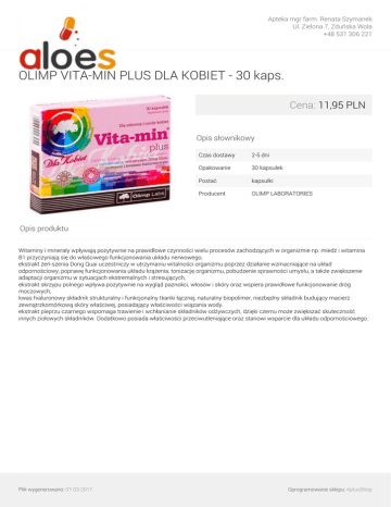 Apteka mgr farm. Renata Szymanek Ul. Zielona 7, Zduńska Wola +48 531 306 221 OLIMP VITA-MIN PLUS DLA KOBIET - 30 kaps. Cena: 11,95 PLN Opis słownikowy Czas dostawy 2-5 dni Opakowanie 30 kapsułek Postać kapsułki Producent OLIMP LABORATORIES Opis produktu Witaminy i minerały wpływają pozytywnie na prawidłowe czynności wielu procesów zachodzących w organizmie np. miedź i witamina B1 przyczyniają się do właściwego funkcjonowania układu nerwowego, ekstrakt żeń-szenia Dong Quai uczestniczy w utrzymaniu witalności organizmu poprzez działanie wzmacniające na układ odpornościowy, poprawę funkcjonowania układu krążenia, tonizację organizmu, pobudzenie sprawności umysłu, a także zwiększenie adaptacji organizmu w sytuacjach ekstremalnych i stresujących, ekstrakt skrzypu polnego wpływa pozytywnie na wygląd paznokci, włosów i skóry oraz wspiera prawidłowe funkcjonowanie dróg moczowych, kwas hialuronowy składnik strukturalny i funkcjonalny tkanki łącznej, naturalny biopolimer, niezbędny składnik budujący macierz zewnątrzkomórkową skóry właściwej, posiadający właściwości wiązania wody. ekstrakt pieprzu czarnego wspomaga trawienie i wchłanianie składników odżywczych, dzięki czemu może zwiększać skuteczność innych ziołowych składników. Dodatkowo posiada właściwości przeciwutleniające oraz stanowi wsparcie dla układu odpornościowego. Plik wygenerowano: 07-03-2017 Powered by TCPDF (www.tcpdf.org) Oprogramowanie sklepu: AptusShop