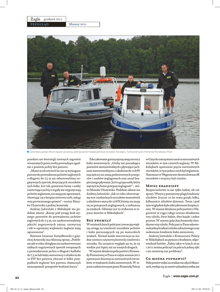 Żagle grudzień 2011 prz e g l ą d Mazury 2011 n Coraz lepszy sprzęt, którym dysponuje policja, podnosi poziom bezpieczeństwa na wodzie. Na zdjęciu funkcjonariusze z Komendy Powiatowej z Pisza przednio nie dostrzegli istotnych zagrożeń stwarzanych przez osoby prowadzące zgodnie z prawem jachty bez patentu. „Mimo iż od czterech lat nie są wymagane patenty do prowadzenia jachtów żaglowych o długości do 7,5 m nie odnotowaliśmy negatywnych zjawisk, dotyczących sterników tych łodzi. Jest tak, ponieważ firmy i osoby czarterujące jachty z reguły nie wypożyczają jachtów żeglarzom, nie mającym uprawnień, obawiając się o bezpieczeństwo osób, załogi oraz powierzonego sprzętu” – ocenia Monika Uliszewska z piskiej komendy. Andrzej Jaźwiński z Mikołajek ma podobne zdanie: „Biorąc pod uwagę brak wymogu patentów do prowadzenia jachtów żaglowych do 7,5 m, nie zaobserwowaliśmy jakichś negatywnych zmian, zazwyczaj i tak w ogromnej większości żeglarze mają uprawnienia”. Również Ireneusz Szmydkowski z giżyckiej komendy ma zbliżoną opinię: „Podobnie jak w roku ubiegłym nie zaobserwowano żadnych negatywnych zjawisk związanych z prowadzeniem jachtu o długości kadłuba do 7,5 m lub łodzi motorowej z silnikiem do 10 kW bez patentu, chociaż w kilku przypadkach żeglarze bez patentu tłumaczyli nieznajomość przepisów brakiem kursu”. 64 062_65_12_11_raport_Mazury.indd 64 Zdecydowanie gorszą opinię mają sternicy łodzi motorowych. „Osoby nie posiadające patentów motorowodnych i pływające jachtami motorowodnymi z silnikiem do 10 kW najczęściej nie znają podstawowych przepisów i znaków żeglugowych oraz zasad bezpiecznego pływania. Jest to grupa osób, która najczęściej łamie przepisy żeglugowe” – mówi Monika Uliszewska. Podobne zdanie ma Andrzej Jaźwiński: „Jak co roku obserwujemy tzw. niedzielnych sterników motorówek z silnikiem o mocy do 10 kW, którzy nie znają się na przepisach żeglugowych, a zwłaszcza na znakach. Głównie jest to widoczne w rejonie mostów w Mikołajkach”. Bez promili! W ostatnich latach policjanci zwracają większą uwagę na trzeźwość sterników jachtów i łodzi poruszających się po mazurskich wodach. Niemal każda interwencja na wodzie zawiera rutynową kontrolę trzeźwości sternika. Na szczęście wygląda na to, że na wodzie jest lepiej niż na naszych drogach. W rejonie działania policjantów z Komendy Powiatowej w Piszu w całym sezonie 2011 ujawniono dziewięciu nietrzeźwych sterników, w większości łodzi motorowych. W rejonie nadzorowanym przez Komendę Policji w Giżycku zatrzymano sześciu nietrzeźwych sterników, w tym czterech żeglarzy. W Mikołajkach ujawniono pięciu nietrzeźwych sterników, w tym jeden z nich był żeglarzem. Natomiast w Węgorzewie skontrolowano 68 sterników i wszyscy byli trzeźwi. Mniej kradzieży Bezpieczeństwo to nie tylko ludzie, ale też sprzęt. Wszyscy pamiętamy plagę kradzieży silników. Jeszcze 10 lat temu ginęło kilka, kilkanaście silników dziennie. Teraz i pod tym względem było zdecydowanie bezpieczniej. W rejonie działania policjantów z Węgorzewa w ciągu całego sezonu skradziono trzy silniki, dwie łodzie, dwa kajaki i jeden ponton. W rejonie giżyckiej komendy skradziono trzy silniki. Policjanci z Pisza odnotowali jedną kradzież silnika zaburtowego oraz usiłowanie kradzieży łodzi motorowej. Andrzej Jaźwiński z Komisariatu Policji w Mikołajkach na pytanie o kradzieże, odpowiedział krótko: „Fakty takie w latach 2010 i 2011 można policzyć na palcach jednej ręki i nie stanowią one problemu”. Co można poprawić? Policjantów widać na wodzie na całych Mazurach, wydaje się, że nawet są bardziej widoczni Żagle | www.zagle.com.pl 2011-11-08 09:40:34