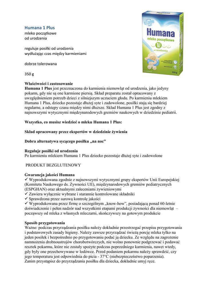 Humana 1 Plus mleko początkowe od urodzenia reguluje posiłki od urodzenia wydłużając czas między karmieniami dobrze tolerowana 350 g Właściwości i zastosowanie Humana 1 Plus jest przeznaczona do karmienia niemowląt od urodzenia, jako jedyny pokarm, gdy nie są one karmione piersią. Skład preparatu został opracowany z uwzględnieniem potrzeb dzieci z silniejszym uczuciem głodu. Po karmieniu mlekiem Humana 1 Plus, dziecko pozostaje dłużej syte i zadowolone, posiłki stają się bardziej regularne, a odstępy czasu między nimi dłuższe. Skład Humana 1 Plus jest zgodny z najnowszymi wytycznymi międzynarodowych gremiów naukowych w dziedzinie pediatrii. Wszystko, co musisz wiedzieć o mleku Humana 1 Plus: Skład opracowany przez ekspertów w dziedzinie żywienia Dobra alternatywa sycącego posiłku „na noc” Reguluje posiłki od urodzenia Po karmieniu mlekiem Humana 1 Plus dziecko pozostaje dłużej syte i zadowolone PRODUKT BEZGLUTENOWY Gwarancja jakości Humana Wyprodukowana zgodnie z najnowszymi wytycznymi grupy ekspertów Unii Europejskiej (Komitetu Naukowego ds. Żywności UE), międzynarodowych gremiów pediatrycznych (ESPGHAN) oraz aktualnymi zaleceniami żywieniowymi Zawiera wyłącznie wybrane i starannie kontrolowane składniki Sprawdzona przez surową kontrolę jakości Wyprodukowana przez firmę o szczególnym „know-how”, posiadającą ponad 60-letnie doświadczenie i pełen nadzór nad wszystkimi etapami produkcji żywności dla niemowląt – począwszy od mleka z własnych mleczarni, skończywszy na gotowym produkcie Sposób przygotowania Ważne: podczas przyrządzania posiłku należy dokładnie przestrzegać przepisu przygotowania i podstawowych zasady higieny. Należy zawsze przyrządzać świeżą porcję mleka tylko na jeden posiłek i bezpośrednio po przygotowaniu podać ją dziecku. Ze względu na zagrożenie namnożenia drobnoustrojów chorobotwórczych, nie wolno ponownie podgrzewać i podawać resztek pokarmu, które nie zostały spożyte podczas poprzedniego karmienia, nawet wtedy, gdy były one przechowywane w lodówce. Przed podaniem pokarmu należy sprawdzić, czy jego temperatura jest odpowiednia do picia - 37°C (niebezpieczeństwo poparzenia). Zanim przystąpisz do przyrządzania posiłku dla dziecka, dokładnie umyj ręce. Upewnij się, czy butelka, smoczek i zakrętka wraz z pokrywką są czyste. Nie podgrzewaj pokarmu w kuchence mikrofalowej (niebezpieczeństwo poparzenia). Otwartą torebkę, po pobraniu proszku, dobrze zamknij, przechowuj w chłodnym i suchym miejscu, jej zawartość zużyj w ciągu trzech tygodni. Zagotuj odpowiednią objętość wody i ostudź do temperatury 70oC (lub wodę Humana dla niemowląt i dzieci podgrzej do temperatury 70°C). Około połowę potrzebnej objętości wody wlej do czystej butelki. Załączoną miarkę luźno napełnij proszkiem (nie ubijając). Usuń nadmiar proszku równo z brzegiem miarki i wsyp do butelki z wodą. Zamknij butelkę i natychmiast wymieszaj silnie wstrząsając, aż do rozpuszczenia się proszku. Dodaj pozostałą objętość wody i ponownie silnie wymieszaj. Uwaga: chroń ręce przed gorącą butelką (użyj np. chusteczkę). Pokarm ostudź do temperatury odpowiedniej do picia: w naczyniu z wodą lub pod zimną bieżącą wodą (ok. 5-7 min.). Butelkę jeszcze raz krótko wstrząśnij, nałóż smoczek i ponownie sprawdź, czy temperatura pokarmu jest odpowiednia do picia - 37°C (niebezpieczeństwo poparzenia). Upewnij się, że w czasie przygotowywania pokarmu Twoje dziecko nie znajduje się w bezpośredniej bliskości (niebezpieczeństwo pryśnięcia i poparzenia). Objętości zalecane w karmieniu Proszę używać wyłącznie załączoną do tego opakowania miarkę (miarka mieści ok. 4,3 g proszku). Każde dziecko jest Na jeden posiłek inne, dlatego Wiek dziecka Woda (ml) Liczba miarek Objętość Liczba posiłków podane objętości gotowego do dziennie należy traktować spożycia mleka tylko jako (ml) wskazówki. 1. tydzień wg. zaleceń lekarza lub położnej 2. – 8. tydzień 90 3 100 7-8 3. miesiąc 120 4 130 6-7 4. miesiąc 150 5 170 5-6 po 4. miesiącu 180 6 200 4-5 Ważne wskazówki ... dla dobra dziecka Najlepszym sposobem żywienia niemowląt jest karmienie piersią. Przed podjęciem decyzji o rozpoczęciu karmienia mlekiem modyfikowanym, należy skonsultować się z lekarzem pediatrą. ... dla zdrowych ząbków Staranna i regularna pielęgnacja zębów dziecka, zwłaszcza przed snem, powinna być prowadzona od pierwszych ząbków. Po skończonym posiłku nie pozostawiaj smoczka w buzi dziecka do ssania, jako zastępstwo zwykłego smoczka lub pomoc w zasypianiu i możliwie wcześnie przyzwyczaj je do picia z kubeczka. Posiłek z butelki nie powinien trwać dłużej, aniżeli karmienie piersią. Przechowywać w chłodnym i suchym miejscu Należy spożyć do: Patrz stempel na spodzie kartonika Środek spożywczy specjalnego przeznaczenia żywieniowego Skład Średnia zawartość Wartość energetyczna Białko Węglowodany, w tym: laktoza maltoza dekstryny skrobia Tłuszcz, w tym: nasycone kwasy tłuszczowe jednonienasycone kwasy tłuszczowe wielonienasycone kwasy tłuszczowe kwas linolowy (Omega-6) kwas α-linolenowy (Omega3) Składniki mineralne Sód Potas Wapń Magnez Fosfor Chlorki Mikroelementy Żelazo Cynk Miedź Jod Mangan Selen Fluor Witaminy Witamina A 100 g proszku kJ kcal g g 2089 499 10,6 59,6 100 ml gotowego do spożycia mleka 272 65 1,4 7,7 g g g g g g g 41,6 0,9 8,4 8,7 24,2 8,7 10,6 5,4 0,1 1,1 1,1 3,1 1,1 1,4 g 4,9 0,6 mg mg 4380 557 569 72 mg mg mg mg mg mg 140 530 455 46 260 355 18 69 59 6,0 34 46 mg mg µg µg µg µg µg 4,9 5,3 325 92 73 14 < 20 0,6 0,7 42 12 9,5 1,8 < 3,0 µg 505 66 Witamina D 8,2 1,1 µg Witamina E mg 5,9 0,8 Witamina K 45 5,9 µg 550 72 Witamina B1 µg Witamina B2 1020 133 µg Witamina B6 520 68 µg 1,5 0,19 Witamina B12 µg Witamina C mg 81 11 4740 616 Niacyna µg Kwas pantotenowy 3100 403 µg Folacyna 91 12 µg 18