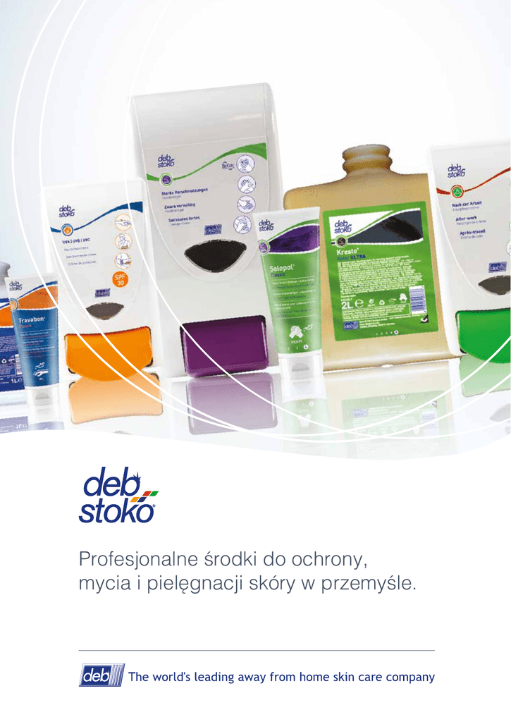 Profesjonalne środki do ochrony, mycia i pielęgnacji skóry w przemyśle. Więcej informacji na temat produktów oraz Karty Charakterystyki można znaleźć na stronie www.debgroup.com 1 Nasza wiedza Nauka I Doświadczenie I Innowacyjność I Ambicje Firmy Deb i Stoko połączyły swoje siły, żeby wyznaczać światowe trendy i być liderem w zakresie ochrony skóry w przemyśle. Składa się na to innowacyjność, doświadczenie naukowe oraz przeszło 80 lat praktyki w zakresie zwalczania i prewencji zawodowych chorób skóry. Razem stworzyliśmy największą na świecie linię produktów do ochrony i pielęgnacji skóry w przemyśle, dzięki czemu możemy poradzić sobie z wszelkimi zagrożeniami, na które narażona jest skóra pracowników. Nasze produkty są lubiane i łatwe w zastosowaniu dzięki czemu pracownicy są zmotywowani do używania ich na co dzień. Nowa linia kremów i past DebStoko® to poprawa zdrowia, bezpieczeństwo dla środowiska oraz wymierne korzyści ekonomiczne. Największy na świecie zespół specjalistów zajmujących się doradztwem i sprzedażą środków ochrony skóry dba o nasz główny cel, którym jest stworzenie zdrowego i bezpiecznego miejsca pracy oraz nowej kultury pracy, w której liczą się dłonie pracowników. Kluczowe fakty • Naszych produktów używa się 150 mln razy dziennie • 97% produktów wytwarzamy we własnych fabrykach • Posiadamy 23 lokalizacje na 5 kontynentach • Nasze 2 nowoczesne fabryki wytwarzają około 5 mln dozowników rocznie 2 Więcej informacji na temat produktów oraz Karty Charakterystyki można znaleźć na stronie www.debgroup.com POZYCJA LIDERA Zwalczamy zawodowe choroby skóry Jesteśmy wiodącą firmą, która zwalcza zawodowe choroby skóry GLOBALNA MARKA Działamy na pięciu kontynentach, dzięki czemu z łatwością obsługujemy klientów zarówno lokalnych jak i globalnych OCHRONA SKÓRY Zapewniamy najbardziej kompleksową ofertę produktów przeznaczonych dla każdego rodzaju skóry i dla każdego sektora przemysłu Więcej informacji na temat produktów oraz Karty Charakterystyki można znaleźć na stronie www.debgroup.com WIEDZA Wykorzystujemy najnowszą wiedzę naukową do tworzenia innowacyjnych produktów 3 Jedna linia produktów dla wszystkich sektorów przemysłu DebStoko® jest najbardziej kompleksową linią produktów wysokiej jakości, które są przeznaczone dla każdego rodzaju skóry i których można używać w każdym sektorze przemysłu, w tym w przemyśle spożywczym, instytucjach i placówkach służby zdrowia. Produkty stworzono tak, by być w zgodzie z obowiązującym prawem i wymaganiami klientów. Oferujemy ochronę przed wieloma zagrożeniami obecnymi na stanowisku pracy, mycie i czyszczenie dłoni dopasowane do stopnia zabrudzenia, dezynfekcję z wykorzystaniem unikatowej technologii spieniania produktów (Deb Foam Technology) oraz pielęgnację po pracy za pomocą znanych i uznanych kremów. 4 Przemysł Produkcja żywności i branża cateringowa Instytucje Służba zdrowia Więcej informacji na temat produktów oraz Karty Charakterystyki można znaleźć na stronie www.debgroup.com MYCIE LEKKICH ZABRUDZEŃ str. 19-25 MYCIE DŁONI W PRZEMYŚLE str. 26-34 PREPARATY DO MYCIA ANTYBAKTERYJNEGO str. 35 & 36 DEZYNFEKCJA DŁONI str. 35 & 37 PIELĘGNACJA SKÓRY str. 38-41 PureBAC • • • • • • • • Służba zdrowia i przychodnie weterynaryjne • • • • • • • • • • • • • • • • • • Biura, instytucje, obiekty użyteczności publicznej, szkoły. • • • • • • • Przemysł spożywczy i HoReCa • • • • • • • Przemysł farmaceutyczny Budownictwo i sektor wydobywczy • • • • • • • • • • • • Logistyka, montaż, magazynowanie i przemysł lekki • • • • • • • • • • • • • • Tworzywa sztuczne, chemia, elektronika i utrzymanie ruchu Stokoderm® Protect PURE Stokoderm® Active PURE Stokoderm® Advanced Stokoderm® Grip PURE Travabon® Classic Travabon® Special PURE Stokoderm® Aqua PURE Stokoderm® Frost Stokoderm® Sun Protect 30 PURE Stokoderm® Sun Protect 50+ Stokoderm® Foot Care Refresh™ Clear FOAM Refresh™ Azure FOAM Refresh™ Rose FOAM Refresh™ Energie FOAM Refresh™ Relax FOAM Refresh™ Original FOAM Refresh™ Hair & Body Refresh™ Luxury 3 in 1 Hair & Body Estesol® Lotion Estesol® Lotion PURE Estesol® Premium PURE Estesol® Hair & Body Solopol® Lime Solopol® GrittyFOAM® Solopol® Classic Solopol® Classic PURE Kresto® Universal WIPES Solopol® Classic EXTRA Kresto® Citrus Kresto® Classic Kresto® Kolor ULTRA Kresto® Special ULTRA Kresto® Special WIPES Przemysł ciężki, metalowy i stoczniowy OCHRONA SKÓRY str. 12-18 Prace na zewnątrz Skrócony przewodnik po produktach • • • • • • • • • • • • • • • • • • • • • • • • • • • • • • • • • • • • • • • • • • • • • • • • • • • • • • • • • • • • • • • • • • FOAM Wash • • AgroBACTM FOAM Wash • • TM Deb InstantFOAM Complete Stokosept® Protect Stokolan® Light PURE Stokolan® Light Gel Stokolan® Hand & Body Stokolan® Classic Stokolan® Sensitive PURE Stokolan® Intense ® • • • • • • • • • • • • • • • • • • • • • • • • • • • • • • • • • • • • • • Więcej informacji na temat produktów oraz Karty Charakterystyki można znaleźć na stronie www.debgroup.com • • • • • • • • • • • • • • • • 5 6 Istotnych Zalet Produktów 6 1 Najwyższa jakość 2 Szeroka gama 3 Ciągła innowacyjność 4 Gruntowna wiedza i wsparcie 5 Oszczędność kosztów i korzystne ceny 6 Nowoczesne opakowania Jesteśmy światową potęgą w produkcji specjalistycznych środków ochrony skóry dla przemysłu. Dlatego nasze produkty są bezkonkurencyjne pod względem wydajności, przyjaznośc