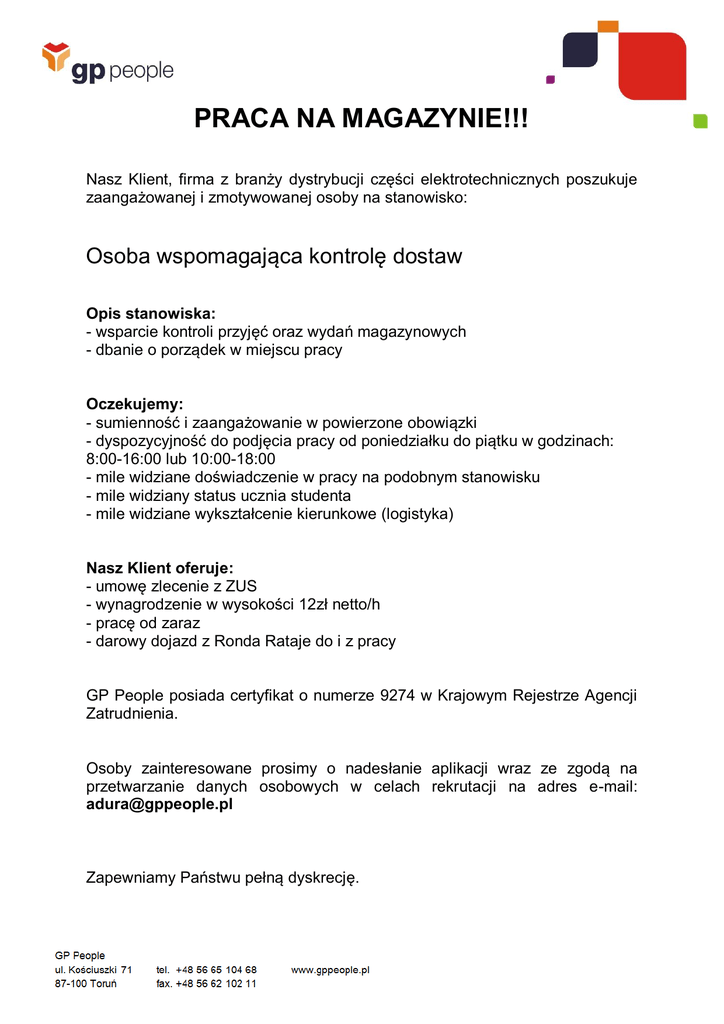 PRACA NA MAGAZYNIE!!! Nasz Klient, firma z branży dystrybucji części elektrotechnicznych poszukuje zaangażowanej i zmotywowanej osoby na stanowisko: Osoba wspomagająca kontrolę dostaw Opis stanowiska: - wsparcie kontroli przyjęć oraz wydań magazynowych - dbanie o porządek w miejscu pracy Oczekujemy: - sumienność i zaangażowanie w powierzone obowiązki - dyspozycyjność do podjęcia pracy od poniedziałku do piątku w godzinach: 8:00-16:00 lub 10:00-18:00 - mile widziane doświadczenie w pracy na podobnym stanowisku - mile widziany status ucznia studenta - mile widziane wykształcenie kierunkowe (logistyka) Nasz Klient oferuje: - umowę zlecenie z ZUS - wynagrodzenie w wysokości 12zł netto/h - pracę od zaraz - darowy dojazd z Ronda Rataje do i z pracy GP People posiada certyfikat o numerze 9274 w Krajowym Rejestrze Agencji Zatrudnienia. Osoby zainteresowane prosimy o nadesłanie aplikacji wraz ze zgodą na przetwarzanie danych osobowych w celach rekrutacji na adres e-mail: [email protected] Zapewniamy Państwu pełną dyskrecję.