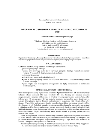Tendencje Rozwojowe w Zwalczaniu Pożarów Kraków, 30–31 maja 2017 INFORMACJE O SPOSOBIE REDAGOWANIA PRAC W FORMACIE DOC Mariusz Ziółko1, Komitet Organizacyjny2 1 Akademia Górniczo-Hutnicza im. S. Staszica w Krakowie al. Mickiewicza 30, 30-059 Kraków, 2 Szkoła Aspirantów PSP w Krakowie, oś. Zgody 18, 31-951 Kraków [email protected],[email protected] STRESZCZENIE Organizatorzy konferencji „Tendencje Rozwojowe w Zwalczaniu Pożarów” proszą Autorów o skrupulatne zapoznanie się z przedstawionymi niżej wskazówkami i wykorzystanie ich przy redagowaniu prac. UWAGI WSTĘPNE Całkowita objętość pracy nie może przekroczyć sześciu stron. Ogólne uwagi dotyczące redakcji: proszę zwrócić uwagę na to, że w pierwszym paragrafie każdego rozdziału nie robimy wcięcia. W pozostałych akapity mają wcięcia na 5 mm; nie numerujemy stron; nie kończymy strony tytułem kolejnej sekcji; jeżeli w tekście podajemy nazwę strony albo adres e-mailowy to używamy czcionki Courier New 10 pt; prace błędne lub nieestetycznie zredagowane nie będą zamieszczone w materiałach konferencyjnych. MARGINESY, ODSTĘPY I STOPIEŃ PISMA Prace należy pisać w jednej wyjustowanej kolumnie. Wydrukowana wersja pdf ma mieć wymiary kolumny tekstu: szerokość 130 mm, wysokość 205 mm. Prosimy nie zmieniać ustawień marginesowych! Marginesy zdefiniowane w Wordzie wynoszą odpowiednio: górny 3.8 cm, dolny 2.2 cm, lewy 3.7 cm oraz prawy 3.7 cm na Letter rozmiarze papieru. Pod nazwą konferencji po odstępie 24pt piszemy dużymi literami, wyśrodkowany i pogrubiony tytuł referatu (Time New Roman; 12 pt). Dalej umieszczamy, również pośrodku i pogrubione nazwisko/a autora/ów (Time New Roman; 10 pt). Odległość pomiędzy tytułem a nazwiskami autorów oraz między nazwiskami a afiliacjami, to 12pt. Dane o miejscu pracy autorów piszemy tak, by nie zajmowały więcej, niż dwie linijki dla każdego autora. Preferowana kolejność to: ewentualnie wydział, uczelnia, adres uczelni (Time New Roman; 10 pt). Jeżeli chcemy podać również e-mail, to piszemy go inną czcionką (Courier New; 10 pt). Po tak zredagowanych afiliacjach umieszczamy drukowane, pogrubione i wyśrodkowane słowo STRESZCZENIE (Time New Roman; 9 pt). Przed tekstem streszczenia dajemy 2 pt odległości, zaś po tekście streszczenia, czyli przed rozpoczęciem nowej sekcji – 10pt. Takie same zasady co do czcionki i odległości dotyczą słowa LITERATURA. Zasadniczy tekst pracy składamy 10-punktowym krojem (Times New Roman; 10 pt). Wyjątki to: 1. tekst streszczenia oraz podpisy rysunków i tabel (Times New Roman; 9 pt); 2. pozycje w spisie literatury oraz przypisy (Times New Roman; 8 pt). Nagłówki (kolejne sekcje) również piszemy pośrodku, pogrubioną, drukowaną czcionką (Standardowy; Time New Roman; 10 pt) . Dodatkowo definiujemy odległości: (1) po afiliacjach 22 pt; (2) zaś dla pozostałych sekcji: pomiędzy tytułem sekcji a tekstem 4 pt, przed kolejną sekcją 10pt.; (3) przed i za rysunkiem, przed i za tabelą, pomiędzy, definicjami oraz wzorami – ale te zasady opiszemy później. GRAFIKA I TABELE Rysunek wklejamy do tekstu tak, aby był pośrodku strony. Odległość pomiędzy tekstem a rysunkiem oraz pomiędzy podpisem a tekstem, jak również podpisem pod rysunkiem wynosi 6 pt, (np. przez Akapit/Przed 6 pt). Podpis pod rysunkiem umieszczamy w tabeli, tak jak jest pokazane na przykładzie. Jeżeli podpis pod rysunkiem mieści się w jednej linijce, to umieszczamy go pośrodku, jeżeli nie, to wszystkie linie justujemy. Rysunki podpisujemy pełnym słowem “Rysunek numer_kropka”. Do rysunków odwołujemy się w następujący sposób: a. do jednego rysunku “Rys. 1”; b. do dwóch rysunków “Rys. (2) i (5)”; c. do kilku następujących po sobie rysunków “Rys. (2)–(5)”. Rysunek 1. Podpis pod rysunkiem, wyśrodkowany (Time New Roman; 9 pt) Dla zamieszczanych w tekście tabel definiujemy identyczne odległości jak dla rysunków. Tabele podpisujemy “Tabela numer” i tak samo się do nich odwołujemy (nie stosujemy skrótu). Tabela 1. Stosowny podpis nad tabelą, tym razem wyjustowany. Wyrażenia w tabeli piszemy zwykłą czcionką (Time New Roman; 9 pt). A-B C D X 0.896 0.947 Y 0.8586 0.8655 Z 0.8358 0.9128 W 0.8950 0.4370 WZORY Format wzoru x (t ) AT (t ) x (t ) C T (t )u (t ), T t [0, T ]. y (t ) B (t ) y (t ), (2) Zasada jest taka, że najpierw definiujemy tabelę z trzema kolumnami i bez obramowania. Szerokości kolumn wynoszą odpowiednio: dla pierwszej i trzeciej 1.75 cm, dla środkowej 10 cm. W drugiej kolumnie pośrodku umieszczamy wzór, zaś w trzeciej numer wzoru, który wyrównujemy do prawej środkowej. Przed i za tabelą umieszczamy odstępy 2 pt. Wzór powinien również być napisany 10 punktowym krojem pisma. Do równań odwołujemy się w następujący sposób: a) do jednego wzoru “(1)”; b) do dwóch wzorów “(2) i (5)”; c) do kilku następujących po sobie wzorów “(2)–(5)”. We wzorach, tak jak i normalnym tekście stosujemy znaki interpunkcyjne. ODWOŁANIA Odwołanie do literatury: “[1]”, Ew. “[1], [2], [3]” lub “[1]–[3]”.1 Odwołanie do stron literatury: jednej strony: “str. 231”, kilku stron “str. 231–240”. PODZIĘKOWANIE Jeśli zechcą Państwo umieścić w artykule sekcję uwzględniającą podziękowania lub uwagi, prosimy sformatować ją jak zwykłą sekcję. BIBLIOGRAFIA I UWAGI KOŃCOWE Poniżej znajdują się przykładowe pozycje literatury dla: książek, książek oczekujących na druk, artykułu w czasopiśmie, artykułu oczekującego na druk, preprintów oraz referatu w materiałach konferencyjnych. Proszę zwrócić uwagę na interpunkcję itp. Życzymy udanej i owocnej pracy. LITERATURA [1] A. Ziółko and B. C. Ziółko: Tytuł książki 1, Wydawca, Miejsce, 2003. [2] D. Ziółko and E. Ziółko: Tytuł książki 2, Seria, Wydawca, 2004. [3] F. Ziółko and G. Ziółko: Tytuł książki 3, Seria, Wydawca, 2017 (w