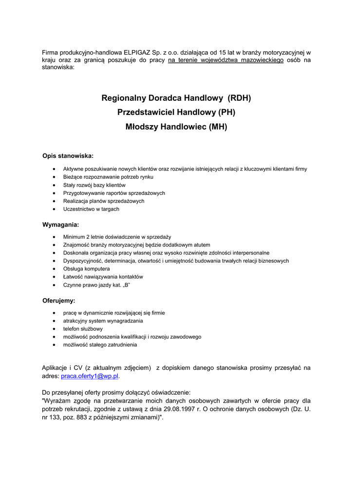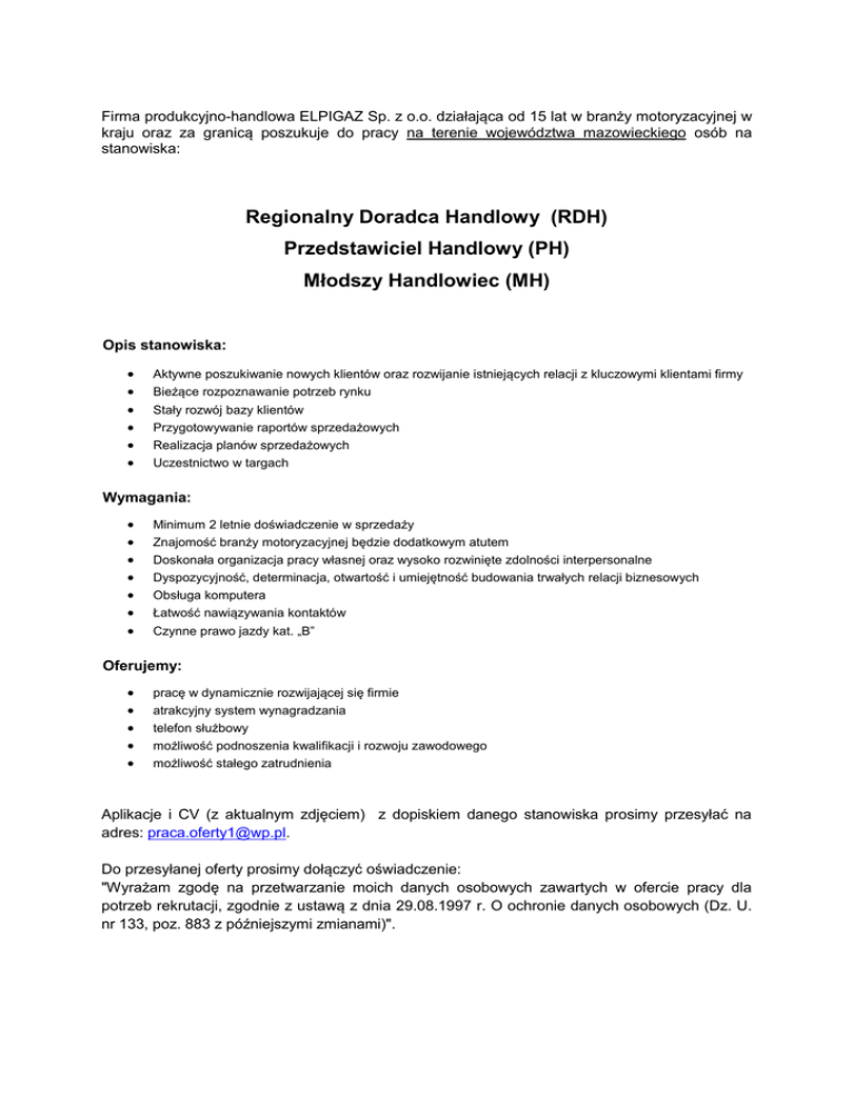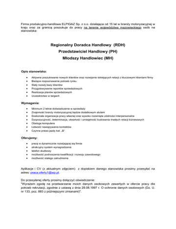 Firma produkcyjno-handlowa ELPIGAZ Sp. z o.o. działająca od 15 lat w branży motoryzacyjnej w kraju oraz za granicą poszukuje do pracy na terenie województwa mazowieckiego osób na stanowiska: Regionalny Doradca Handlowy (RDH) Przedstawiciel Handlowy (PH) Młodszy Handlowiec (MH) Opis stanowiska: Aktywne poszukiwanie nowych klientów oraz rozwijanie istniejących relacji z kluczowymi klientami firmy Bieżące rozpoznawanie potrzeb rynku Stały rozwój bazy klientów Przygotowywanie raportów sprzedażowych Realizacja planów sprzedażowych Uczestnictwo w targach Wymagania: Minimum 2 letnie doświadczenie w sprzedaży Znajomość branży motoryzacyjnej będzie dodatkowym atutem Doskonała organizacja pracy własnej oraz wysoko rozwinięte zdolności interpersonalne Dyspozycyjność, determinacja, otwartość i umiejętność budowania trwałych relacji biznesowych Obsługa komputera Łatwość nawiązywania kontaktów Czynne prawo jazdy kat. „B” Oferujemy: pracę w dynamicznie rozwijającej się firmie atrakcyjny system wynagradzania telefon służbowy możliwość podnoszenia kwalifikacji i rozwoju zawodowego możliwość stałego zatrudnienia Aplikacje i CV (z aktualnym zdjęciem) z dopiskiem danego stanowiska prosimy przesyłać na adres: [email protected]. Do przesyłanej oferty prosimy dołączyć oświadczenie: "Wyrażam zgodę na przetwarzanie moich danych osobowych zawartych w ofercie pracy dla potrzeb rekrutacji, zgodnie z ustawą z dnia 29.08.1997 r. O ochronie danych osobowych (Dz. U. nr 133, poz. 883 z późniejszymi zmianami)".