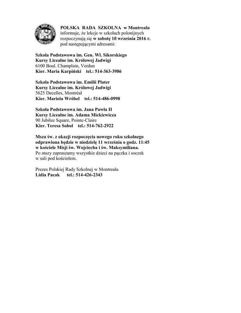 POLSKA RADA SZKOLNA w Montrealu informuje, że lekcje w szkołach polonijnych rozpoczynają się w sobotę 10 września 2016 r. pod następującymi adresami: Szkoła Podstawowa im. Gen. Wł. Sikorskiego Kursy Licealne im. Królowej Jadwigi 6100 Boul. Champlain, Verdun Kier. Maria Karpiński tel.: 514-363-3986 Szkoła Podstawowa im. Emilii Plater Kursy Licealne im. Królowej Jadwigi 5625 Decelles, Montréal Kier. Mariola Wróbel tel.: 514-486-0998 Szkoła Podstawowa im. Jana Pawła II Kursy Licealne im. Adama Mickiewicza 90 Jubilee Square, Pointe-Claire Kier. Teresa Sobol tel.: 514-762-2922 Msza św. z okazji rozpoczęcia nowego roku szkolnego odprawiona będzie w niedzielę 11 września o godz. 11:45 w kościele Misji św. Wojciecha i św. Maksymiliana. Po mszy zapraszamy wszystkie dzieci na pączka i soczek w sali pod kościołem. Prezes Polskiej Rady Szkolnej w Montrealu Lidia Pacak tel.: 514-426-2343
