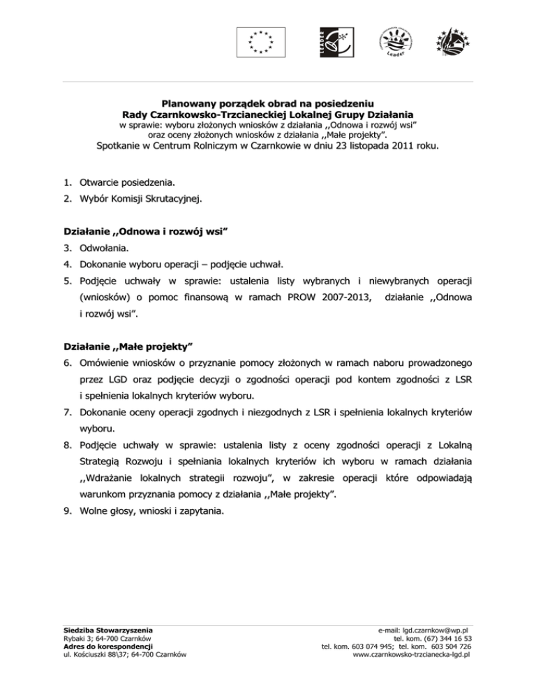 Planowany porządek obrad na posiedzeniu Rady Czarnkowsko-Trzcianeckiej Lokalnej Grupy Działania w sprawie: wyboru złożonych wniosków z działania ,,Odnowa i rozwój wsi” oraz oceny złożonych wniosków z działania ,,Małe projekty”. Spotkanie w Centrum Rolniczym w Czarnkowie w dniu 23 listopada 2011 roku. 1. Otwarcie posiedzenia. 2. Wybór Komisji Skrutacyjnej. Działanie ,,Odnowa i rozwój wsi” 3. Odwołania. 4. Dokonanie wyboru operacji – podjęcie uchwał. 5. Podjęcie uchwały w sprawie: ustalenia listy wybranych i niewybranych operacji (wniosków) o pomoc finansową w ramach PROW 2007-2013, działanie ,,Odnowa i rozwój wsi”. Działanie ,,Małe projekty” 6. Omówienie wniosków o przyznanie pomocy złożonych w ramach naboru prowadzonego przez LGD oraz podjęcie decyzji o zgodności operacji pod kontem zgodności z LSR i spełnienia lokalnych kryteriów wyboru. 7. Dokonanie oceny operacji zgodnych i niezgodnych z LSR i spełnienia lokalnych kryteriów wyboru. 8. Podjęcie uchwały w sprawie: ustalenia listy z oceny zgodności operacji z Lokalną Strategią Rozwoju i spełniania lokalnych kryteriów ich wyboru w ramach działania ,,Wdrażanie lokalnych strategii rozwoju”, w zakresie operacji które odpowiadają warunkom przyznania pomocy z działania ,,Małe projekty”. 9. Wolne głosy, wnioski i zapytania. Siedziba Stowarzyszenia Rybaki 3; 64-700 Czarnków Adres do korespondencji ul. Kościuszki 88\37; 64-700 Czarnków e-mail: [email protected] tel. kom. (67) 344 16 53 tel. kom. 603 074 945; tel. kom. 603 504 726 www.czarnkowsko-trzcianecka-lgd.pl