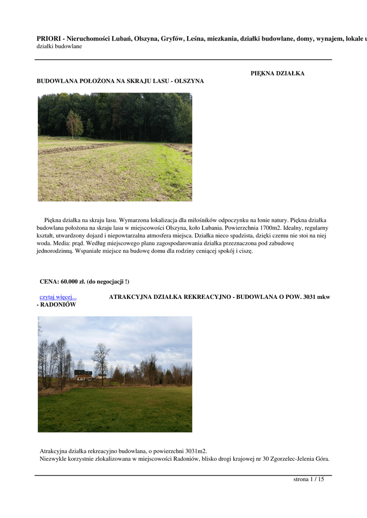 PRIORI - Nieruchomości Lubań, Olszyna, Gryfów, Leśna, miezkania, działki budowlane, domy, wynajem, lokale u działki budowlane BUDOWLANA POŁOŻONA NA SKRAJU LASU - OLSZYNA PIĘKNA DZIAŁKA Piękna działka na skraju lasu. Wymarzona lokalizacja dla miłośników odpoczynku na łonie natury. Piękna działka budowlana położona na skraju lasu w miejscowości Olszyna, koło Lubania. Powierzchnia 1700m2. Idealny, regularny kształt, utwardzony dojazd i niepowtarzalna atmosfera miejsca. Działka nieco spadzista, dzięki czemu nie stoi na niej woda. Media: prąd. Według miejscowego planu zagospodarowania działka przeznaczona pod zabudowę jednorodzinną. Wspaniałe miejsce na budowę domu dla rodziny ceniącej spokój i ciszę. CENA: 60.000 zł. (do negocjacji !) czytaj więcej... - RADONIÓW ATRAKCYJNA DZIAŁKA REKREACYJNO - BUDOWLANA O POW. 3031 mkw Atrakcyjna działka rekreacyjno budowlana, o powierzchni 3031m2. Niezwykle korzystnie zlokalizowana w miejscowości Radoniów, blisko drogi krajowej nr 30 Zgorzelec-Jelenia Góra. strona 1 / 15 PRIORI - Nieruchomości Lubań, Olszyna, Gryfów, Leśna, miezkania, działki budowlane, domy, wynajem, lokale u działki budowlane Widoczna z trasy, co pozwala na wykorzystanie jej do celów reklamowych. Bliski i szybki dojazd do Gryfowa Śląskiego, Lwówka Śl. i Jeleniej Góry. Media: woda, prąd. Olbżymi potencjał inwestycyjny ! CENA: 80.000 zł. czytaj więcej... PIĘKNY PONIEMIECKI BUDYNEK GOSPODARCZY WRAZ Z DZIAŁKĄ REKREACYJNĄ - BOŻKOWICE Piękny poniemiecki budynek gospodarczy. Oryginalny charakter starego budownictwa. Idealny do adaptacji na obiekt rekreacyjny. Powierzchnia działki 458m2. Zdrowa, ładna cegła, dach i więźba w dobrym stanie. Z uwagi na ciekawą turystycznie okolicę, obiekt nadaje się pod inwestycje np. przearanżowanie na obiekt agroturystyczny. Atrakcyjna okolica: blisko do zamków Rajsko i Czocha, w okolicy ośrodki wypoczynkowe i wypożyczalnie sprzętu wodnego. Idealny punkt wypadowy na wycieczki w góry i do Czech. Blisko do Świeradowa Zdroju, granicy z Czechami i Niemcami. CENA: 87.000 zł. (do negocjacji !) czytaj więcej... DZIAŁKA INWESTYCYJNA O POW. 1,7501 ha - NAWOJÓW ŁUŻYCKI strona 2 / 15 PRIORI - Nieruchomości Lubań, Olszyna, Gryfów, Leśna, miezkania, działki budowlane, domy, wynajem, lokale u działki budowlane Okazja! Do sprzedania działka inwestycyjna o powierzchni 1,7501 ha, położona w miejscowości Nawojów Łużycki, na trasie Lubań - Nowogrodziec.Według miejscowego planu zagospodarowania gminy Lubań, działka oznaczona symbolem 2U- usługi i działalność gospodarcza wraz z niezbędnym zakresem urządzeń towarzyszących. Z uwagi na dobrą lokalizację działka idealna pod zakład usługowo - produkcyjny lub siedzibę firmy. 15km od autostrady A4, 35 do granicy z Niemcami w Jędrzychowicach, 30 km do przejścia granicznego Zawidów - Habartice. Znakomite miejsce pod inwestycję. CENA: 160.000 zł. czytaj więcej... LEŚNIAŃSKIM DZIAŁKA REKREACYJNA Z DOMKIEM LETNISKOWYM NAD JEZIOREM Dla osób marzących o własnej odskoczni. Działka rekreacyjna z domkiem letniskowym w miejscowości Bożkowice, nad jeziorem Leśniańskim. Działka o powierzchni 144m2. Domek do odświeżenia, posiada łazienkę i aneks kuchenny. Media: prąd, woda, kanalizacja. Atrakcyjna okolica: blisko do zamków Rajsko i Czocha, w okolicy ośrodki wypoczynkowe i wypożyczalnie sprzętu wodnego. Idealny punkt wypadowy na wycieczki w góry i do Czech. Blisko do Świeradowa Zdroju, granicy z Czechami i Niemcami. CENA: 32.000 zł. (do negocjacji !) czytaj więcej... DZIAŁKA BUDOWLANA Z PROJEKTEM BUDOWLANYM - HENRYKÓW LUBAŃSKI strona 3 / 15 PRIORI - Nieruchomości Lubań, Olszyna, Gryfów, Leśna, miezkania, działki budowlane, domy, wynajem, lokale u działki budowlane Działka budowlana z projektem budowlanym w Henrykowie Lubańskim Atrakcyjna działka budowlana, regularnego kształtu o powierzchni 3000 m2. Usytuowana przy drodze asfaltowej. Media: prąd, woda, szambo. Projekt budowlany i pozwolenia do odświeżenia. Cicha i spokojna okolica. Wygodny i szybki dojazd do Lubania, autostrady A4 czy Kamiennogórskiej Strefy Ekonomicznej w Wykrotach. CENA: 65.000 zł. TYLKO 21 zł/mkw czytaj więcej... ATRAKCYJNA DZIAŁKA BUDOWLANA O POW. 1043 mkw - SIEKIERCZYN Do sprzedania atrakcyjna działka budowlana regularnego kształtu o powierzchni 1043 m2 położona w Siekierczynie blisko Lubania i Zgorzelca. Przeznaczenie w miejscowym planie: MN1 - zabudowa mieszkaniowa jednorodzinna i zagrodowa. Miejsce bardzo ciche i spokojne. Idealna alternatywa dla osób pragnących odpocząć od zgiełku miasta i ceniących kontakt z naturą. Teren płaski, nasłoneczniony, dojazd drogą asfaltową. Media w pobliżu działki, (prąd przy granicy, woda na działce, kanalizacja w pobliżu). Gorąco polecam i zapraszam na prezentację! DOBRA CENA: 28.900 zł. czytaj więcej... DZIAŁKA JAK MARZENIE - W KSZTAŁCIE KWADRATU O POW. 1500 mkw - WESOŁÓWKA strona 4 / 15 PRIORI - Nieruchomości Lubań, Olszyna, Gryfów, Leśna, miezkania, działki budowlane, domy, wynajem, lokale u działki budowlane Do sprzedania bardzo atrakcyjna działka budowlana,w kształcie kwadratu, o powierzchni 1500 m2 położona w bliskiej okolicy Lubania- w miejscowości Wesołówka. Działka, w której można się ZAKOCHAĆ z pięknymi sielankowymi widokami. Dojazd drogą asfaltową, prąd na działce, woda z wodociągu. W pobliżu nowe domy jednorodzinne. Idealne miejsce dla osób ceniących spokój i bliskość natury. GORĄCO POLECAM! We wsi położono nową nawierzchnię asfaltową oraz oświetlenie. ZAPRASZAM na prezentację już dziś! OKAZYJNA CENA: 40.000 zł. czytaj więcej... DZIAŁKA BUDOWLANA REGULARNEGO KSZTAŁTU O POW. 979 kmw Do sprzedania działka budowlana, regularnego kształtu o powierzchni 979 m2. Działka zgodnie z miejscowym planem zagospodarowania przestrzennego przeznaczona pod zabudowę mieszkaniową jednorodzinną. Położona przy d