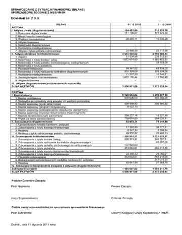 SPRAWOZDANIE Z SYTUACJI FINANSOWEJ (BILANS) SPORZĄDZONE ZGODNIE Z MSSF/MSR DOM-MAR SP. Z O.O. BILANS AKTYWA I. Aktywa trwałe (długoterminowe) 1. Rzeczowe aktywa trwałe 2. Nieruchomości inwestycyjne 3. Wartości niematerialne 4. Aktywa finansowe 5. Należności długoterminowe 6. Rozliczenia międzyokresowe 7. Aktywa z tytułu podatku odroczonego II. Aktywa obrotowe (krótkoterminowe) 1. Zapasy 2. Należności z tytułu dostaw i usług 3. Należności z tytułu podatku dochodowego od osób prawnych 4. Należności z tytułu podatków 5. Pozostałe należności 6. Należności z tytułu rozliczenia kontraktów długoterminowych 7. Rozliczenia międzyokresowe 8. Środki pieniężne i ich ekwiwalenty 9. Aktywa finansowe III. Aktywa długoterminowe przeznaczone do sprzedaży SUMA AKTYWÓW 01.12.2010 31.12.2009 164 461,64 111 199,07 28 294,11 24 968,46 3 672 510,02 61 504,46 1 672 674,90 59 347,02 232 326,00 21 507,20 1 625 150,44 3 836 971,66 216 129,50 177 375,32 16 036,28 22 717,90 2 355 909,34 238 712,83 1 865 455,83 31 929,00 61 136,02 129 539,00 16 546,21 12 590,45 2 572 038,84 PASYWA I. Kapitał własny 1. Kapitał podstawowy 2. Nadwyżka ze sprzedaży akcji powyżej ich wartości nominalnej 3. Kapitał zapasowy (zyski zatrzymane) 4. Kapitał zapasowy (program motywacyjny) 5. Kapitał zapasowy (zabezpieczenie przepływów pieniężnych) 6. Kapitał zapasowy (wycena nieruchomości inwestycyjnych) 7. Kapitały rezerwowe (zyski zatrzymane) 8. Wynik za okres sprawozdawczy II. Zobowiązania długoterminowe 1. Oprocentowane kredyty bankowe i pożyczki 2. Zobowiązania z tytułu leasingu finansowego 3. Rezerwy 4. Rezerwa z tytułu odroczonego podatku dochodowego III. Zobowiązania krótkoterminowe 1. Zobowiązania z tytułu dostaw i usług 2. Zobowiązania z tytułu rozliczenia kontraktów długoterminowych 3. Zobowiązania z tytułu podatku dochodowego od osób prawnych 4. Zobowiązania z tytułu podatków 5. Zobowiązania z tytułu wyceny instrumentów finansowych 6. Zobowiązania z tytułu leasingu finansowego 7. Pozostałe zobowiązania 8. Bieżąca część oprocentowanych kredytów bankowych i pożyczek 9. Rezerwy IV. Zobowiązania bezpośrednio związane z aktywami długoterminowymi Zobowiązania razem SUMA PASYWÓW 2 243 924,64 650 000,00 560 599,93 6 022,75 268 227,16 759 074,80 72 072,71 17 292,55 5 247,34 49 532,82 1 520 974,31 680 313,31 107 924,00 313 663,61 23 369,23 353 062,57 42 641,59 1 593 047,02 3 836 971,66 1 478 827,09 650 000,00 306 560,82 18 227,16 504 039,11 71 541,48 38 777,11 3 356,24 29 408,13 1 021 670,27 240 797,11 49 697,00 265 315,16 23 002,91 168 219,06 247 074,33 27 564,70 1 093 211,75 2 572 038,84 Podpisy Członków Zarządu: Piotr Napierała Prezes Zarządu Jerzy Szymankiewicz Członek Zarządu Podpis osoby odpowiedzialnej za sporządzenie sprawozdania finansowego: Piotr Schramma Złotniki, dnia 11 stycznia 2011 roku Główny Księgowy Grupy Kapitałowej ATREM