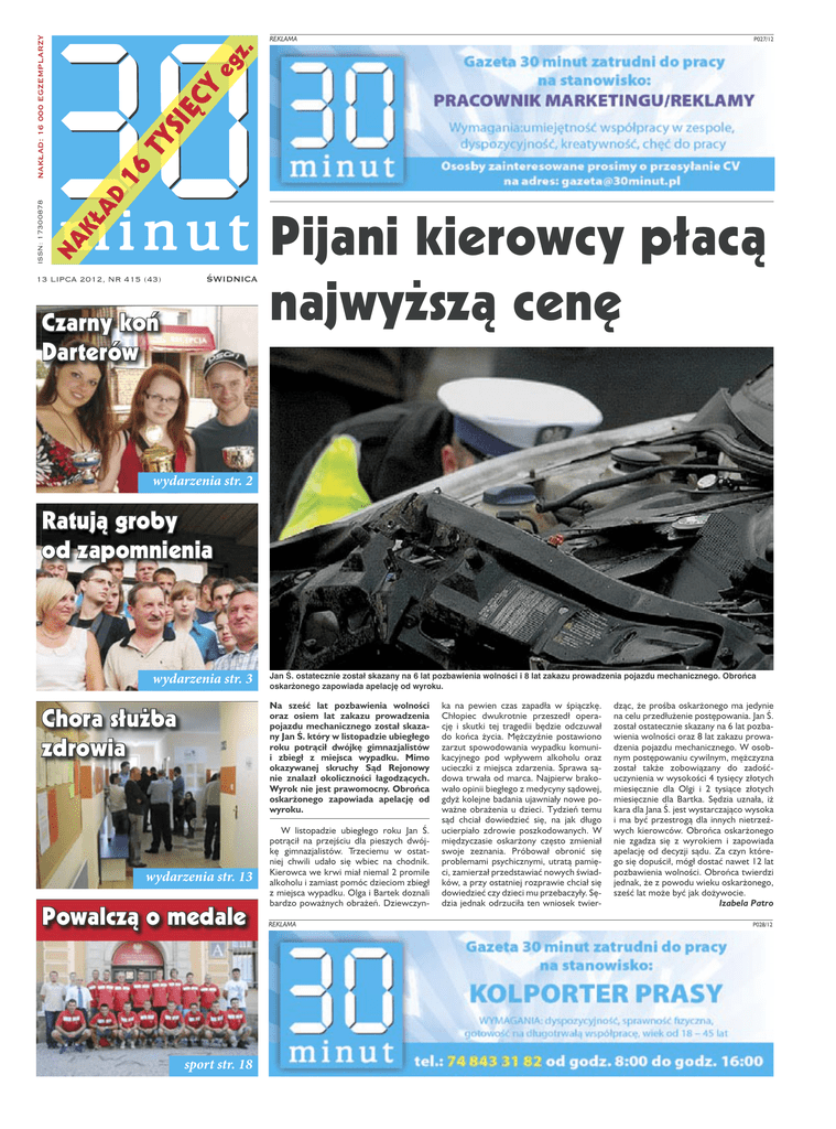 TY SIĘ CY eg z. P027/12 16 KŁ AD NA ISSN: 17300878 NAKŁAD: 16 000 EGZEMPLARZY REKLAMA 13 LIPCA 2012, NR 415 (43) ŚWIDNICA Czarny koń Darterów Pijani kierowcy płacą najwyższą cenę wydarzenia str. 2 Ratują groby od zapomnienia wydarzenia str. 3 Jan Ś. ostatecznie został skazany na 6 lat pozbawienia wolności i 8 lat zakazu prowadzenia pojazdu mechanicznego. Obrońca oskarżonego zapowiada apelację od wyroku. Na sześć lat pozbawienia wolności oraz osiem lat zakazu prowadzenia pojazdu mechanicznego został skazany Jan Ś. który w listopadzie ubiegłego roku potrącił dwójkę gimnazjalistów i zbiegł z miejsca wypadku. Mimo okazywanej skruchy Sąd Rejonowy nie znalazł okoliczności łagodzących. Wyrok nie jest prawomocny. Obrońca oskarżonego zapowiada apelację od wyroku. Chora służba zdrowia wydarzenia str. 13 Powalczą o medale sport str. 18 W listopadzie ubiegłego roku Jan Ś. potrącił na przejściu dla pieszych dwójkę gimnazjalistów. Trzeciemu w ostatniej chwili udało się wbiec na chodnik. Kierowca we krwi miał niemal 2 promile alkoholu i zamiast pomóc dzieciom zbiegł z miejsca wypadku. Olga i Bartek doznali bardzo poważnych obrażeń. DziewczynREKLAMA ka na pewien czas zapadła w śpiączkę. Chłopiec dwukrotnie przeszedł operację i skutki tej tragedii będzie odczuwał do końca życia. Mężczyźnie postawiono zarzut spowodowania wypadku komunikacyjnego pod wpływem alkoholu oraz ucieczki z miejsca zdarzenia. Sprawa sądowa trwała od marca. Najpierw brakowało opinii biegłego z medycyny sądowej, gdyż kolejne badania ujawniały nowe poważne obrażenia u dzieci. Tydzień temu sąd chciał dowiedzieć się, na jak długo ucierpiało zdrowie poszkodowanych. W międzyczasie oskarżony często zmieniał swoje zeznania. Próbował obronić się problemami psychicznymi, utratą pamięci, zamierzał przedstawiać nowych świadków, a przy ostatniej rozprawie chciał się dowiedzieć czy dzieci mu przebaczyły. Sędzia jednak odrzuciła ten wniosek twier- dząc, że prośba oskarżonego ma jedynie na celu przedłużenie postępowania. Jan Ś. został ostatecznie skazany na 6 lat pozbawienia wolności oraz 8 lat zakazu prowadzenia pojazdu mechanicznego. W osobnym postępowaniu cywilnym, mężczyzna został także zobowiązany do zadośćuczynienia w wysokości 4 tysięcy złotych miesięcznie dla Olgi i 2 tysiące złotych miesięcznie dla Bartka. Sędzia uznała, iż kara dla Jana Ś. jest wystarczająco wysoka i ma być przestrogą dla innych nietrzeźwych kierowców. Obrońca oskarżonego nie zgadza się z wyrokiem i zapowiada apelację od decyzji sądu. Za czyn którego się dopuścił, mógł dostać nawet 12 lat pozbawienia wolności. Obrońca twierdzi jednak, że z powodu wieku oskarżonego, sześć lat może być jak dożywocie. Izabela Patro P028/12 wydarzenia myśli/sek Piątek, 13 lipca 2012 www.30minut.pl Kto spełni wymagania? REKLAMA R0636/12 ����������������������������� ������������������� �������������������������������� ������������������������������������ �������������������������� ������������ Tour de grodzkość Około 200 zawodników. Aż 400 miast i miejscowości przez które przejadą uczestnicy. To już 69 edycja największego w Polsce wyścigu kolarskiego, który jedzie przez Polskę. Kandydatów do zwycięstwa jest kilku. W Tour de grodzkość było dwóch: prezydent i starosta. Wygrał ten pierwszy. Premier „klepnął” decyzję o zmianie granic powiatu. Mierząc siły na zamiary zmian dokonała również rada miejska. Konkretnie przeniosła od 1 września dzieci z PSP nr 31 do Zespołu Szkół nr 2. Ku rozpaczy rodziców i ich pociech, które po decyzji wojewody cieszyły się, że co najmniej jeszcze rok będą uczyły się w swojej placówce. Teraz będą chodzić do innej szkoły. Podobnie jak radny miejski Cezary Kuriata. On nie chce już uczestniczyć w „zajęciach” komisji edukacji. – Ta komisja to lipa – powiedział chwilę po głosowaniu w sprawie przeniesienia PSP nr 31 do ZS nr 2. Był wściekły jak dzik, którego uratowali strażacy, wyciągając zwierzę z głębokiego kanału przy ulicy Ogrodowej. Nie zwracając uwagi na to, że pracownicy PSP chcą mu uratować życie jeszcze kwiczał i próbował gryźć. Na szczęście nie zrobił tego w stosunku do Kuriaty radny Paweł Szpur. Nie gryzł, ale kąsał. – To niedopuszczalne, aby rezygnować z komisji z powodu tego, iż nie podoba się nam jakaś uchwała – mówił na sesji. – Podobać to mogą mi się kwiatki – ripostował mu członek PiS-u. Skoro już o kwiatkach. Bodajże Ładne Kwiatki – tak chyba nazywa się zespół muzyczny kolejnego radnego z Wałbrzycha. Piotra Kwatkowskiego z PO, który stał się w tym tygodniu „bohaterem” materiału TV Dami. Nie ratował dzika, nie śpiewał, ale jak wynika z relacji dziennikarzy, zachowywał się „niestosownie” wobec podopiecznych jednego z domów dziecka, gdzie był wychowawcą. Na sesję nie przyszedł dlatego nie można było poprosić go o komentarz. Może jest na urlopie? A może poszedł na spacer do lasu, aby przemyśleć tę sprawę? Gdyby był Pan w lesie proszę zaglądać do kanałów. Może znajdzie Pan tam dzika i uratuje mu życie. Wówczas zostanie pan bohaterem… Rafał Pawłowski Redaktor naczelny tygodnika 30 Minut i telewizji www.regionalnatv.pl ul. Ludowa 1C, p. 111 58-304 Wałbrzych tel.: 74 843 31 82 tel.: 535 771 144 fax: 74 848 32 08 e-mail: [email protected] www.30minut.pl ����������������� ��������������������� �����������������������