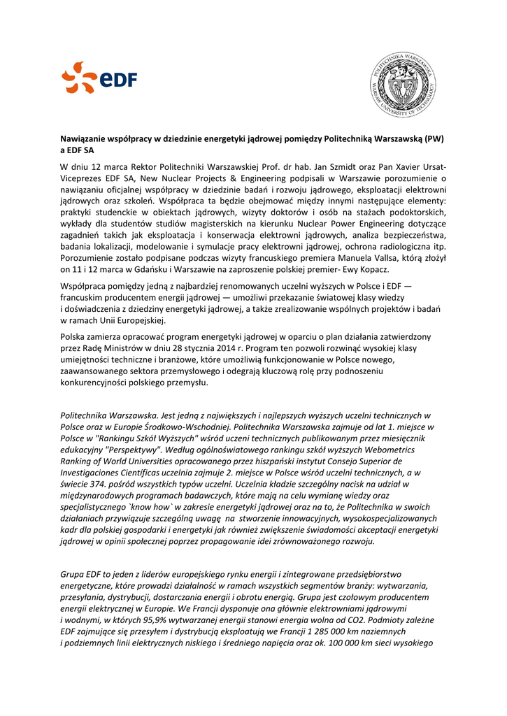 Nawiązanie współpracy w dziedzinie energetyki jądrowej pomiędzy Politechniką Warszawską (PW) a EDF SA W dniu 12 marca Rektor Politechniki Warszawskiej Prof. dr hab. Jan Szmidt oraz Pan Xavier UrsatViceprezes EDF SA, New Nuclear Projects & Engineering podpisali w Warszawie porozumienie o nawiązaniu oficjalnej współpracy w dziedzinie badao i rozwoju jądrowego, eksploatacji elektrowni jądrowych oraz szkoleo. Współpraca ta będzie obejmowad między innymi następujące elementy: praktyki studenckie w obiektach jądrowych, wizyty doktorów i osób na stażach podoktorskich, wykłady dla studentów studiów magisterskich na kierunku Nuclear Power Engineering dotyczące zagadnieo takich jak eksploatacja i konserwacja elektrowni jądrowych, analiza bezpieczeostwa, badania lokalizacji, modelowanie i symulacje pracy elektrowni jądrowej, ochrona radiologiczna itp. Porozumienie zostało podpisane podczas wizyty francuskiego premiera Manuela Vallsa, którą złożył on 11 i 12 marca w Gdaosku i Warszawie na zaproszenie polskiej premier- Ewy Kopacz. Współpraca pomiędzy jedną z najbardziej renomowanych uczelni wyższych w Polsce i EDF — francuskim producentem energii jądrowej — umożliwi przekazanie światowej klasy wiedzy i doświadczenia z dziedziny energetyki jądrowej, a także zrealizowanie wspólnych projektów i badao w ramach Unii Europejskiej. Polska zamierza opracowad program energetyki jądrowej w oparciu o plan działania zatwierdzony przez Radę Ministrów w dniu 28 stycznia 2014 r. Program ten pozwoli rozwinąd wysokiej klasy umiejętności techniczne i branżowe, które umożliwią funkcjonowanie w Polsce nowego, zaawansowanego sektora przemysłowego i odegrają kluczową rolę przy podnoszeniu konkurencyjności polskiego przemysłu. Politechnika Warszawska. Jest jedną z największych i najlepszych wyższych uczelni technicznych w Polsce oraz w Europie Środkowo-Wschodniej. Politechnika Warszawska zajmuje od lat 1. miejsce w Polsce w "Rankingu Szkół Wyższych" wśród uczeni technicznych publikowanym przez miesięcznik edukacyjny "Perspektywy". Według ogólnoświatowego rankingu szkół wyższych Webometrics Ranking of World Universities opracowanego przez hiszpaoski instytut Consejo Superior de Investigaciones Científicas uczelnia zajmuje 2. miejsce w Polsce wśród uczelni technicznych, a w świecie 374. pośród wszystkich typów uczelni. Uczelnia kładzie szczególny nacisk na udział w międzynarodowych programach badawczych, które mają na celu wymianę wiedzy oraz specjalistycznego `know how` w zakresie energetyki jądrowej oraz na to, że Politechnika w swoich działaniach przywiązuje szczególną uwagę na stworzenie innowacyjnych, wysokospecjalizowanych kadr dla polskiej gospodarki i energetyki jak również zwiększenie świadomości akceptacji energetyki jądrowej w opinii społecznej poprzez propagowanie idei zrównoważonego rozwoju. Grupa EDF to jeden z liderów europejskiego rynku energii i zintegrowane przedsiębiorstwo energetyczne, które prowadzi działalnośd w ramach wszystkich segmentów branży: wytwarzania, przesyłania, dystrybucji, dostarczania energii i obrotu energią. Grupa jest czołowym producentem energii elektrycznej w Europie. We Francji dysponuje ona głównie elektrowniami jądrowymi i wodnymi, w których 95,9% wytwarzanej energii stanowi energia wolna od CO2. Podmioty zależne EDF zajmujące się przesyłem i dystrybucją eksploatują we Francji 1 285 000 km naziemnych i podziemnych linii elektrycznych niskiego i średniego napięcia oraz ok. 100 000 km sieci wysokiego i bardzo wysokiego napięcia. Grupa dostarcza energię i usługi do ok. 28,5 mln klientów we Francji. Wartośd skonsolidowanej sprzedaży Grupy wyniosła w 2013 r. 75,6 mld euro, z czego 46,8% zrealizowano poza Francją. EDF jest notowana na paryskiej giełdzie papierów wartościowych i wchodzi w skład indeksu CAC 40. EDF Polska ma 10% udziału w polskim rynku wytwarzania energii elektrycznej.
