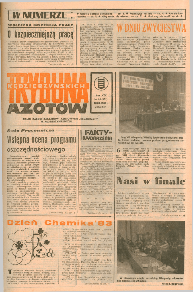 NUMERZE : # Ustawa została uchwalona — str. 3. # P^pozycje na lato — str. 4. # Ale do kierownika — str. 5. # Niby racja, ale wiecie... — str. 7. # Nasi czy nie nasi? — str. 8. SPOŁECZNA I N S P E K C J A PRACY 0 bezpieczniejszą pracę Warunki pracy, bezpieczeństwo pracowników podczas w y konywania czynności zawodowych, to n i e z w y k l e istotne sprawy, które muszą leżeć w interesie przedsiębiorstwa oraz działających w nim komórek organizacyjnych i organizacji - społeczno-politycznych. O bezpieczeństwie pracy i godziwych • jej warunkach decyduje w i e l e czynników. Część z nich zależy od w a r u n k ó w technicznych i innych elementów, za które odpowiada fabryka. Są jednak i takie, które bezpośrednio i pośrednio determinują zachowania pracowników, zależą od świadomości i znajomości przepisów bhp. (Dokończenie na str. 3) W dniu 8 maja br., w przeddzień Dnia Zwycięstwa i Dnia Kombatanta, na terenie hali sportowej w K ę d z i e r z y nie-Koźlu Zarząd Miejski Z B o W i D zorganizował festyn połączony z występami zespołów artystycznych miejscow y c h i zaproszonych na tę imprezę. N a estradzie hali sportowej koncertowali: zespół artystyczny Estrady Śląskiej z K a t o w i c , zespół a r t y styczny z P r a g i Czeskiej, chór kombatancki Z B o W i D działający przy M O U K w K ę d z i e rzynie-Koźlu oraz Kozielska Kapela P o d w ó r k o w a . P r z e d koncertem niżej w y - W DNIU ZWYCIESTWA mienieni kombatanci z Zakładów A z o t o w y c h ..Kędzierzyn" zostali udekorowani przez przewodniczącego Prezydium Miejskiej Rady Narodowej, Mieczysława Źurka medalamii „ Z a udział w wojnie obronnej 1939", przyznanymi i m przez Radę Państwa P R L : Franciszek Grześkowiak — b. żołnierz 29 Kaliskiego P.P. 25 D P A r m i i „Poznań", Franciszek Kisiclc- wicz — b. żołnierz 22 paL D y w . Piech. Górskiej A r m i i „ K r a k ó w " , Józef M i c h n i e w i c » — b. żołnierz 14 Dyonu A r t . Konnej Podlaskiej Brygady K a w a l e r i i , Kazimierz Ptak — b. żołnierz 12 pp. D y w . Piech. A r m i i „ K r a k ó w " , Józef T k a czyk — b. żołnierz 83 pp. 30 D y w . Piech. A r m i i „Łódź", T e o f i l Zuwała — b. żołnierz 74 Górnośląskiego Pułku P i e choty A r m i i „ Ł ó d ź " . (ził) Rok XXX Nr 14(901) 20.05.1983 r. Cena 2 zł PISMO ZAŁOGI ZAKŁADÓW AZOTOWYCH „KĘDZIERZYN" W KĘDZIERZYNIE-KOŹLU R a d a P r a c o w n i c z a Wstępna ocena programu FAKTYJury VIII Olimpiady Wiedzy Społeczno-Politycznej miało trudne zadanie, bowiem poziom przygotowania zawodników był wysoki. oszczędnościowego Przewodniczący komisji problemowych naszej Rady Pracowniczej na j e d n y m z o slatnich posiedzeń prezydium dyskutowali na temat projek tu „Zakładowego programu wzrostu produkcji i oszczędności". Jak w i e m y , program taki tworzony jest na p o szczególnych wydziałach, a także w szerszym zasięgu — dl;) całej fabryki. Projekt, zgodnie z założenia m; przesłany został do organizacji i stowarzyszeń, działa jących na terenie zakładu z prośbą o zaopiniowanie i wniesienie ewentualnych poprawek i sugestii. T a k się zló żyło, że właśnie Rada P r a c o w nicza będzie projekt zatwierdzać, toteż uwagi wniesione po wstępnej analizie programu mają swoją w a g ę i z p e w nością przyczynią się do o pracowama ostatecznej redak cji dokumentu. Dzień T W c z w a r t e k 12 m a j a w miejscu budowy największej przemysłow e j i n w e s t y c j i Opolszczyzny — intalacji O X O o b r a d o w a ł S e k r e tariat Komitetu Wojewódzkiego PZPH z udziałem wicemnistra P r z e m y s ł u Chemicznego i L e k k i e Projektowi trudno odmóg o Stanjsława Bajura i d y r e k t o wić intencji szukania oszczęd ra departamentu w Ministerstwie niści, jednakże, j a k się w y - Budownictwa Jerzego W ł o d a r c z y ka. Goście na początku w i z y t y daje, niektóre jego elementy zapoznali się z placami budów przygotowane są w sposób nie i zaawansowaniem prac. Sekreta dość rzetelny, a przez to stariat K W P Z P R w y r a z i ł zaniepo k o j e n i e opóźnieniem zakładanego ją się mało realne. Zacznijtempa robót, w y r a ż a j ą c przekona m y jednak od początku. Otóż nie, ż e opóźnienia zostaną nadw piśmie okólnym, które zob robione. B y cel ten osiągnąć potrzebna jest m o b i l i z a c j a sił ze ligowało poszczególne komórstrony generalnego wykonawcy ki zakładu do rozpoczęcia i wszystkich podwykonawców. prac nad projektem, dyrektor P o d j ę t e zostały konkretne ustalenia w s p r a w i e i n t e r w e n c y j n e g o kombinatu sugerował, żeby załatwienia niezbędnych, a braku poszczególne pozycje działań j ą c y c h m a t e r i a ł ó w (kable' e l e k oszczędnościowych zgrupować tryczne, e l e k t r o d y , f a r b y a n t y k o r o z y j n e . stal kwasoodporna). W w blokach tematycznych, np. p i e r w s z y m k w a r t a l e 84 r. S e k r e oszczędności surowców i matariat ponownie oceni postęp prac na t e j i n w e s t y c j i . teriałów, poprawa efekty wnoś ci gospodarowania itd. T y m czasem w projekcie zamierze nia oszczędnościowe ujęto w układzie poszczególnych zakładów. Realizacja takich zamierzeń musi być rozciągnięta w latach, co jest rzeczą (Dokończenie na str. 4) * Komisja wyborcza Rady P r a c o w n i c z e j skończy n i e b a w e m pra cę nad w y b o r a m i d e l e g a t ó w załogi. W ł a ś c i w e wybory zostały już zakończone, w y b r a n o ogółem (Dokończenie na str. 3) maja bieżącego roku w hotelu „ C e n t r a l n y m " od był się w o j e w ó d z k i f i nał V I I I edycji Olimpiady Wiedzy Społeczno-Politycznej Z S M P . Obecna edycja poświę eona była reformie gospodarczej, a j e j przewodnie hasło brzmiało „Młodzi w refor- 6 jednego zakładu — ta, która uzyskała największą ilość punktów. Można dyskutować nad słusznością taki