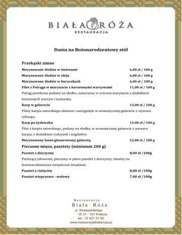 Dania na Bożonarodzeniowy stół Przekąski zimne Marynowane śledzie w śmietanie 6,00 zł / 100 g Marynowane śledzie w oleju 6,00 zł / 100 g Marynowane śledzie w buraczkach 6,00 zł / 100 g Filet z Pstrąga w marynacie z korzennymi warzywami 11,00 zł / 100 g Pstrąg potokowy podany na słodko, zanurzony w octowej marynacie z dodatkiem korzennych warzyw i tymianku. Karp w galarecie 13,00 zł / 100 g Filety karpia zatorskiego ułożone i zastygnięte w aromatycznej galarecie z wywaru rybnego. Karp po żydowsku 14,00 zł / 100 g Filet z karpia zatorskiego, podany na słodko, w aromatycznej galarecie z wywaru karpia, z dodatkiem rodzynek i migdałów. Marynowany łosoś glazurowany galaretą 22,00 zł / 100 g Pieczone mięsa, pasztety (minimum 200 g) Pasztet z dziczyzny 8,00 zł /100g Pachnący jałowcem, pieczony w piecu pasztet z dziczyzny. Idealny na bożonarodzeniowe świąteczne śniadanie. Pasztet z cielęciny 8,00 zł /100g Pasztet wieprzowo - wołowy 7,00 zł /100g Restauracja Biała Róża ul. Straszewskiego 16 31 - 101 Kraków tel.: 12 421 51 90 www.restauracjabialaroza.pl Karczek wieprzowy wolno pieczony 9,00 zł /100g Marynowany w ziołach lasu, soczysty i kruchy, wolno pieczony karczek wieprzowy. Idealny z sosem żurawinowym lub chrzanowym. Schab po staropolsku 11,00 zł /100g Delikatny, soczysty i kruchy schab wieprzowy marynowany w ziołach, pieczony w piecu. Można podawać na zimno jak wędlinę lub na ciepło. Najlepiej smakuje z dodatkiem chrzanu i żurawiny. Przekąski gorące Pierogi ręcznie lepione z cielęciną i kaszą 16,00 zł /300g z kapustą kiszoną i grzybami leśnymi 14 ,00 zł / 300g z suszonymi śliwkami i makiem 14 ,00 zł / 300g Uszka z kapustą i grzybami 6,50 zł /110g Sałatki Tradycyjna polska sałatka jarzynowa 4,00 zł /100g Buraki Marynowane w przyprawach korzennych 5,00 zł /100g Cząstki słodkich, małopolskich buraków aromatyzowanych przyprawami korzennymi Sałatka ziemniaczana z ogórkiem, boczkiem, jajkiem 5,00 zł /100g Klasyczna sałatka ziemniaczana z dodatkiem kiszonego ogórka, boczku oraz ugotowanych na twardo jajek. Restauracja Biała Róża ul. Straszewskiego 16 31 - 101 Kraków tel.: 12 421 51 90 www.restauracjabialaroza.pl Zupy Wigilijny barszcz czerwony z kiszonych buraków 5,50 zł /300ml Winny w smaku, o burgundowym kolorze Wigilijny żur na zakwasie Z GRZYBAMI 6,50 zł /300ml Wigilijna zupa grzybowa z łazankami 9,50 zł /300ml Kompot z suszonych owoców 5,50 zł /500ml Tradycyjny, pachnący cynamonem i goździkami, wigilijny kompot z suszonych owoców: jabłek, gruszek i śliwek. Dania gorące FILET z karpia zatorskiego 23,00 zł /1 porcja Karp zatorski smażony 23,00 zł /1 porcja Dzwonka karpia z Zatoru, moczone w mleku, obtoczone w mące pszennej i smażone na złoty kolor. Obowiązkowa, wigilijna potrawa na każdym polskim stole. Najlepiej podgrzewać w piekarniku pod przykryciem, w temperaturze 190*C przez 7-9 min. 1 porcja to ok. 200 gr. Karp królewski z sosem z leśnych grzybów 28,00 zł /1 porcja Smażony na złoty kolor karp królewski, podany z sosem z grzybów leśnych, który podkreśli delikatny smak i aromat ryby. Karpia najlepiej podgrzewać pod przykryciem, w piekarniku w temperaturze 190*C przez 7-9 min, natomiast sos podgrzewamy w oddzielnym garnuszku i polewamy nim wyjętą wcześniej z piekarnika rybę. 1 porcja to ok. 250 gr. WIGILIJNA kapusta z grzybami i grochem 5,00 zł /100g Łazanki z makiem i bakaliami 6,00 zł /100g Kaczka pieczona z jabłkami, z sosem żurawinowym 39, 00 zł / 1 porcja/POŁOWA Restauracja Biała Róża ul. Straszewskiego 16 31 - 101 Kraków tel.: 12 421 51 90 www.restauracjabialaroza.pl Smażony filet z sandacza 29,00 zł /1 porcja Boeuf Strogonow z polędwicy wołowej 36,00 zł / 300 g PIECZONY Indyk FASZEROWANY 95,00 zł /1 kg Pieczony w całości, kruchy i soczysty indyk z podkrakowskiego gospodarstwa, nadziewany aromatyczną wątróbką oraz soczystymi jabłkami. Może być podawany na zimno, jak również na gorąco - stanowiąc idealne ukoronowanie świątecznego obiadu. Waga indyka od 3 do 8 kg. Sosy na zimno Aromatyczne, wyraźne w smaku sosy, podane na zimno są idealnym dodatkiem do ryb, pieczonych mięs, pasztetów oraz wędlin. 1 porcja sosu to ok. 60 gr. Sos chrzanowy 3,50 zł /1 porcja Sos czosnkowy 2,50 zł /1 porcja Sos tatarski 3,50 zł /1 porcja Warunki zamówienia: - zamówienia przyjmujemy osobiście lub via e-mail: [email protected] - potwierdzeniem przyjęcia zamówienia jest wpłata zadatku – 50% jego wartości, - minimalne zamówienie: 3 porcje, 0,5 kg, 1 litr - zamówienia przyjmujemy do: 21 grudnia 2016 r do godz. 17:00 - odbiór osobisty 23 grudnia lub 24 grudnia do godz. 13:00 Restauracja Biała Róża ul. Straszewskiego 16 31 - 101 Kraków tel.: 12 421 51 90 www.restauracjabialaroza.pl Imię i nazwisko zamawiającego:…………………………………………….…………………………………….. E-mail i telefon: …………………………………………………………………………………………………………... Wartość zamówienia:………………………………………………………………………………………………………………… Zadatek – 50 %:…………………………………………………………………………………………………………… Dzień i godzina odbioru:……………………………………………………………………………………………… Uwagi:………………………………………………………………………………………………………………………… Restauracja Biała Róża ul. Straszewskiego 16 31 - 101 Kraków tel.: 12 421 51 90 www.restauracjabialaroza.pl