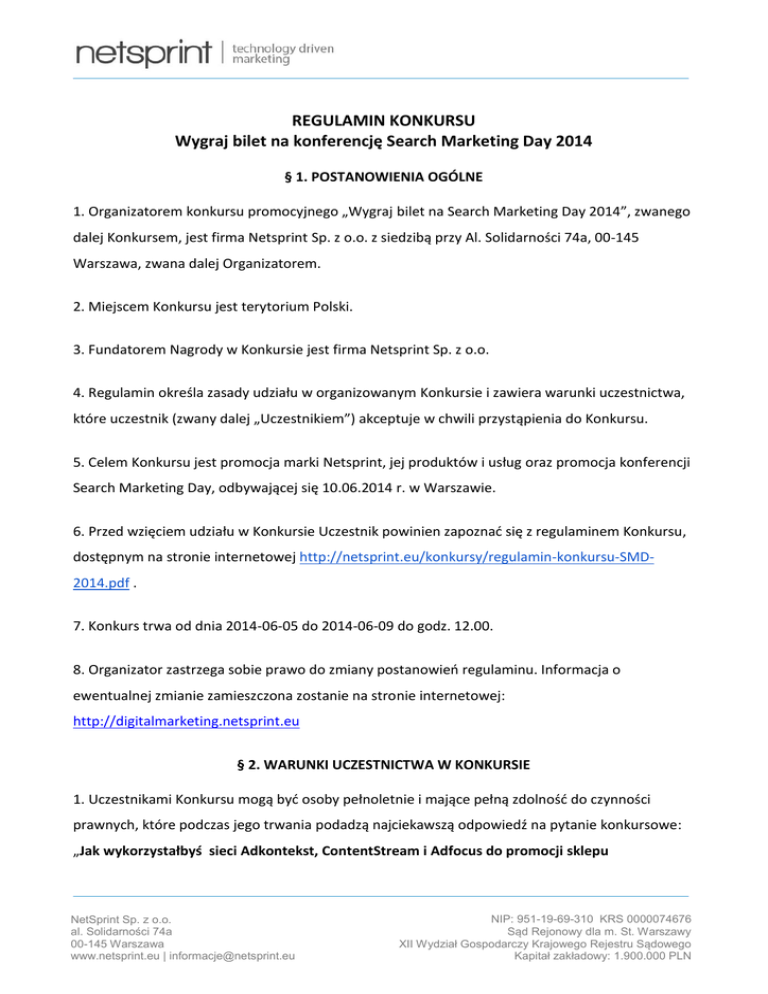 REGULAMIN KONKURSU Wygraj bilet na konferencję Search Marketing Day 2014 § 1. POSTANOWIENIA OGÓLNE 1. Organizatorem konkursu promocyjnego „Wygraj bilet na Search Marketing Day 2014”, zwanego dalej Konkursem, jest firma Netsprint Sp. z o.o. z siedzibą przy Al. Solidarności 74a, 00-145 Warszawa, zwana dalej Organizatorem. 2. Miejscem Konkursu jest terytorium Polski. 3. Fundatorem Nagrody w Konkursie jest firma Netsprint Sp. z o.o. 4. Regulamin określa zasady udziału w organizowanym Konkursie i zawiera warunki uczestnictwa, które uczestnik (zwany dalej „Uczestnikiem”) akceptuje w chwili przystąpienia do Konkursu. 5. Celem Konkursu jest promocja marki Netsprint, jej produktów i usług oraz promocja konferencji Search Marketing Day, odbywającej się 10.06.2014 r. w Warszawie. 6. Przed wzięciem udziału w Konkursie Uczestnik powinien zapoznać się z regulaminem Konkursu, dostępnym na stronie internetowej http://netsprint.eu/konkursy/regulamin-konkursu-SMD2014.pdf . 7. Konkurs trwa od dnia 2014-06-05 do 2014-06-09 do godz. 12.00. 8. Organizator zastrzega sobie prawo do zmiany postanowień regulaminu. Informacja o ewentualnej zmianie zamieszczona zostanie na stronie internetowej: http://digitalmarketing.netsprint.eu § 2. WARUNKI UCZESTNICTWA W KONKURSIE 1. Uczestnikami Konkursu mogą być osoby pełnoletnie i mające pełną zdolność do czynności prawnych, które podczas jego trwania podadzą najciekawszą odpowiedź na pytanie konkursowe: „Jak wykorzystałbyś sieci Adkontekst, ContentStream i Adfocus do promocji sklepu NetSprint Sp. z o.o. al. Solidarności 74a 00-145 Warszawa www.netsprint.eu | [email protected] NIP: 951-19-69-310 KRS 0000074676 Sąd Rejonowy dla m. St. Warszawy XII Wydział Gospodarczy Krajowego Rejestru Sądowego Kapitał zakładowy: 1.900.000 PLN internetowego z butami do biegania?” Odpowiedź nie powinna przekroczyć objętości 1000 znaków ze spacjami. 2. Warunkiem przyjęcia odpowiedzi przez Organizatora jest wysłanie przez Uczestnika wiadomości e-mail za pośrednictwem formularza na stronie internetowej: http://digitalmarketing.netsprint.eu/search-marketing-day-2014-konferencja-wygraj-bilet/. Wiadomość powinna zawierać: odpowiedź na pytanie konkursowe o którym mowa w ust. 1, adres e-mail oraz imię i nazwisko Uczestnika. 3. Warunkiem udziału w Konkursie jest wyrażenie przez Uczestnika zgody na podanie przez Organizatora do publicznej wiadomości imienia i nazwiska Uczestnika, w przypadku przyznania mu nagrody w konkursie. 4. Biorąc udział w Konkursie, Uczestnik zamawia subskrypcję newslettera bloga http://digitalmarketing.netsprint.eu/ i dobrowolnie oświadcza: "Wyrażam zgodę na przetwarzanie i wykorzystywanie moich danych osobowych, wprowadzonych do formularzy dostępnych na stronach http://netsprint.eu, http://adkontekst.pl, http://contentstream.pl, http://search.netsprint.eu, http://audience.netsprint.eu, http://adserver.netsprint.eu, http://digitalmarketing.netsprint.eu, http://optymalizuj.adkontekst.pl w celach marketingowych oraz umieszczenie ich w bazie danych spółki Netsprint Sp. z o.o.” oraz "Wyrażam zgodę na otrzymywanie informacji handlowych od Netsprint Sp. z o.o. w rozumieniu ustawy z dnia 18 lipca 2002 roku o świadczeniu usług drogą elektroniczną". Dane e-mailowe używane będą wyłącznie do wysyłania subskrybentom informacji o nowych usługach, promocjach, nowych partnerach i zmianach zachodzących w firmie Netsprint oraz w markach Adkontekst, Adfocus, ContentStream, Netsprint Search, Netsprint Audience i Netsprint Adserver. Subskrybenci list mailingowych mają w każdym momencie możliwość rezygnacji z NetSprint Sp. z o.o. al. Solidarności 74a 00-145 Warszawa www.netsprint.eu | [email protected] NIP: 951-19-69-310 KRS 0000074676 Sąd Rejonowy dla m. St. Warszawy XII Wydział Gospodarczy Krajowego Rejestru Sądowego Kapitał zakładowy: 1.900.000 PLN otrzymywania listów elektronicznych dystrybuowanych przez Netsprint Sp. z o.o. Dostęp do bazy danych adresowych subskrybentów mają tylko uprawnieni pracownicy firmy Netsprint Sp. z o.o. Jednocześnie mając na uwadze Państwa dobro zobowiązujemy się do nie udostępniania oraz nie odsprzedawania firmom i osobom trzecim danych adresowych pozostających pod naszą kontrolą. 5. Z udziału w Konkursie wyłączeni są pracownicy Organizatora oraz najbliżsi członkowie ich rodzin. Przez najbliższych członków rodziny rozumie się: wstępnych, zstępnych, rodzeństwo, małżonków, rodziców małżonków i osoby pozostające w stosunku przysposobienia. 6. W Konkursie nie mogą brać udziału osoby prawne i jednostki organizacyjne nieposiadające osobowości prawnej. 7. Wyrażenie zgody na wysyłanie wiadomości e-mail oznacza jednocześnie wyrażenie zgody na otrzymywanie korespondencji e-mail związanej z przebiegiem Konkursu. 8. Organizator nie ponosi odpowiedzialności za funkcjonowanie sieci za pośrednictwem których Uczestnicy przesyłają zgłoszenia. Organizator nie ponosi odpowiedzialności za nieprawidłowości powstałe w wyniku zakłóceń sieci teleinformatycznych, treści przesyłane w Zgłoszeniu, indywidualne ustawienia urządzeń, za pomocą których Uczestnik wysyła Zgłoszenie oraz sposoby ich konfiguracji, a także ustawienia występujące u operatorów sieci, za pośrednictwem których są wysyłane Zgłoszenia. § 3. NAGRODY 1. Nagrodą w konkursie jest jeden bilet (wejściówka) na konferencję Search Marketing Day 2014, odbywającą się 10.06.2014 r. w Warszawie. Nagroda obejmuje wyłącznie udział w konferencji. Nagroda nie daje prawa wstępu na after party, ani na warsztaty towarzyszące konferencji. 2. Organizator nie ponosi odpowiedzialności za jakość i użyteczność Nagród (w tym, jeżeli ma to zastosowanie, odpowiedzialności za wady rzeczy będących Nagrodami). Odpowiedzialność z tytułu gwarancji spoczywa na podmiocie wskazanym w treści gwarancji, o ile do nagrody dołączona jest karta gwarancyjna. Net