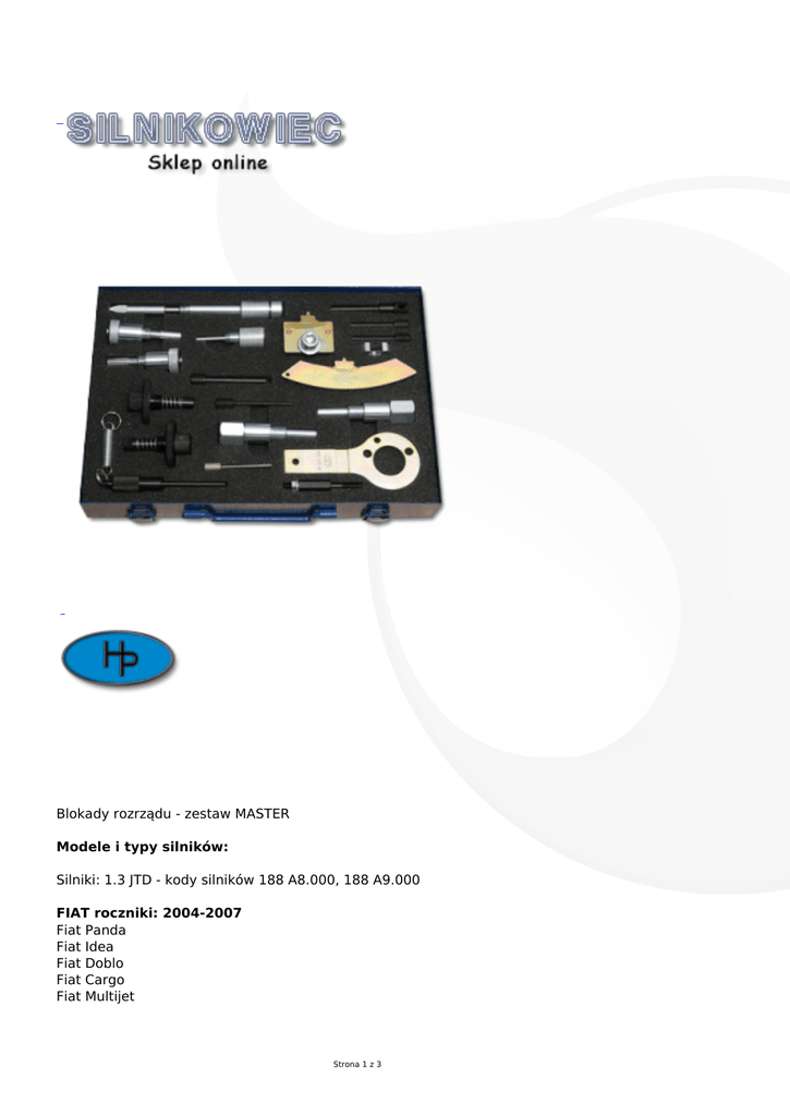 Blokady rozrządu - zestaw MASTER Modele i typy silników: Silniki: 1.3 JTD - kody silników 188 A8.000, 188 A9.000 FIAT roczniki: 2004-2007 Fiat Panda Fiat Idea Fiat Doblo Fiat Cargo Fiat Multijet Strona 1 z 3 Silniki: 1.3 CDTi - kody silników: Z13DT, Z13DTH OPEL roczniki: 2004-2007 Opel Agila Opel Corsa Opel Combo Opel Astra - H Opel Tigra - B, Opel Meriva Silniki: 1.6 JTD 16V - silniki o kodach 198A2.000, 198A3.000, 198A6.000, 350A2.000 Silniki: 1.9 D / TD / JTD po 1998r - wszystkie modele i typy silników grupy Fiat ; Alfa ; Lancia Silniki: 1.9 JTD16V / CDTi - wszystkie modele i typy silników grupy Fiat ; Alfa ; Lancia oraz Opel ; Saab Silniki: 2.0 JTD 16V - silnik o kodzie 198A5.000 (pasek rozrządu) Silniki: 2.3 JTD (2002-2009) - F1AE0481C, F1AE048ID, F1AE048IN (Ducato) Silniki: 2.4 JTD10V ; 2.4 JTD 20V - wszystkie modele i typy silników Fiat ; Alfa ; Lancia Silniki: 2.5 D / TD (1987-2005) - 8144.67, 8140.27, 8140.47R, 8144.21 - Ducato ; Daily ; Turbo Daily Silniki: 2.8 D / JTD (87-05) - 8140.43 ; 8140.63 ; 8140.43S - Ducato ; Daily ; Turbo Daily również dostawcze Citroen ; Opel ; Renault Silniki: 3.0 JTD łańcuch (2002-2009) - FICE0481A (Iveco, Ducato ) Zestaw zawiera zestawy i narzędzia o numerach : Art. 904 015 00 Art. 904 015 50 Art. 904 019 00 Art. 907 050 10 Art. 907 050 60 Art. 907 090 00 Art. 907 180 00 Strona 2 z 3 Numery fabryczne części w zestawie. CITROEN, PEUGEOT OEM Tools: FIAT OEM Tools: FORD OEM Tools: IVECO OEM Tools: SUZUKI OEM Tools: 01912.A , 0191.B 1860638000 303-1472 1860617000 09912-38300, 09912-46310 Strona 3 z 3