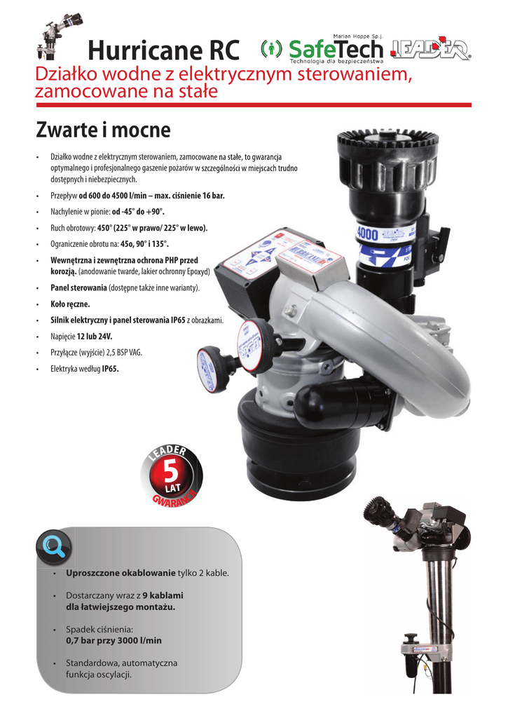 Hurricane RC Działko wodne z elektrycznym sterowaniem, zamocowane na stałe Zwarte i mocne • Działko wodne z elektrycznym sterowaniem, zamocowane na stałe, to gwarancja optymalnego i profesjonalnego gaszenie pożarów w szczególności w miejscach trudno dostępnych i niebezpiecznych. • Przepływ od 600 do 4500 l/min – max. ciśnienie 16 bar. • Nachylenie w pionie: od -45° do +90°. • Ruch obrotowy: 450° (225° w prawo/ 225° w lewo). • Ograniczenie obrotu na: 45o, 90° i 135°. • Wewnętrzna i zewnętrzna ochrona PHP przed korozją. (anodowanie twarde, lakier ochronny Epoxyd) • Panel sterowania (dostępne także inne warianty). • Koło ręczne. • Silnik elektryczny i panel sterowania IP65 z obrazkami. • Napięcie 12 lub 24V. • Przyłącze (wyjście) 2,5 BSP VAG. • Elektryka według IP65. • Uproszczone okablowanie tylko 2 kable. • Dostarczany wraz z 9 kablami dla łatwiejszego montażu. • Spadek ciśnienia: 0,7 bar przy 3000 l/min • Standardowa, automatyczna funkcja oscylacji. PARAMETRY Model Numer katalogowy HURRICANE RC I12.02.017 DN80/PN16 - ALU HURRICANE RC I12.02.018 DN100/PN16 - ALU HURRICANE RC I12.02.015 3" ASA150 - DN80/PN20 - ALU HURRICANE RC I12.02.016 4" ASA150 - DN100/PN20 - ALU HURRICANE RC I12.02.028 PRZYŁĄCZE (wejście) DLA TOP GUN RC4 4» HURRICANE RC I12.02.029 PRZYŁĄCZE (wejście) DLA TOP GUN RC3 3» AKCESORIA DODATKOWE DYSZA MAXMATIC ER – od 400 do 2000 l/min - przyłącze 2.5» BSP IG I12.42.034 DYSZA MAXFORCE ER – od 400 do 2000 l/min - przyłącze 2.5» BSP IG I12.42.036 DYSZA MASTERMATIC 4500 ER – od 600 do 4500 l/min - przyłącze 2.5»BSP IG I12.42.006 MASTERFIX 2500 ER – 500-1000-1500-2000-2500 l/min - przyłącze 2.5»BSP IG I12.42.043 ZAMONTOWANY NA STAŁE PANEL STEROWANIA do zabudowy I12.48.151 PRZENOŚNY PRZYRZĄD STEROWNICZY z kablem 9m I12.48.153 PRZENOŚNY PRZYRZĄD STEROWNICZY z kablem 30m I12.48.154 PILOT - zasięg do 150m - 2.4 GHZ I12.48.164 JOYSTICK I12.48.160 PRZEŁĄCZNIK I12.48.161 WSKAŹNIK ORIENTACJI I12.48.159 ELEKTRYCZNY MASZT TELESKOPOWY TOP GUN 3” I12.48.156 Zalety elektrycznego działka wodnego z możliwością sterowania z odległości Kompatybilne z technologi CANBUS Nawet do 65 zaprogramowanych pozycji 225°w lewo 90°w gór 450o obrotu 45°w dół 225°w prawo KONSERWACJA Uproszczona konserwacja dzi ki wysokiej jako ci produktu (trwały produkt). 5 lat gwarancji HURRICAINE RC V01.de Zastrzegamy sobie prawo do wprowadzania zmian konstrukcyjnych słu cych post powi.