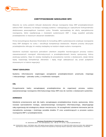 CERTYFIKOWANE SZKOLENIE BPC Obecnie na rynku polskim kilkuset dostawców oferuje rozwiązania klasy ERP przedsiębiorstwom sektora MSP. Dostawcy na bieżąco rozwijają systemy i wzbogacają je o specyficzne funkcjonalności dedykowane poszczególnym branżom rynku. Ponadto wprowadzają do oferty specjalistyczne rozwiązania, które współpracują z modułami systemowymi ERP i mogą wypełnić potrzeby przedsiębiorstw w niszowych obszarach działalności. Firma konsultingowa Business Penetration & Consulting (BPC) systematycznie analizuje rozwiązania klasy ERP dostępne na rynku i weryfikuje kompetencje dostawców. Wspiera procesy decyzyjne przedsiębiorstw oferując im wiedzę niezbędną na każdym etapie wyboru rozwiązania. Szkolenie wychodzi naprzeciw potrzebom członkom zespołów koordynujących procesy wyboru zaawansowanych rozwiązań informatycznych w przedsiębiorstwach branży spożywczej, którzy analizują systemy. Daje im wiedzę niezbędną do prowadzenia rozmów z dostawcami, dzięki której lepiej rozpoznają kompetencje oferentów i będą mogli zabezpieczyć się przed pułapkami stosowanymi w trakcie negocjacji. TEMAT SZKOLENIA Systemy informatyczne wspierające zarządzanie przedsiębiorstwem przemysłu mięsnego i mleczarskiego – potrzeby rynku, a możliwości rozwiązań. CEL Przygotowanie kadry zarządzającej przedsiębiorstwa do organizacji procesu wyboru zaawansowanego rozwiązania informatycznego klasy ERP oraz do rozmów z dostawcami systemów. ADRESACI Szkolenie przeznaczone jest dla kadry zarządzającej przedsiębiorstwa branży spożywczej, która rozważa wprowadzenie nowego, zaawansowanego rozwiązania informatycznego, obejmującego całą organizację lub strategiczny obszar merytoryczny. W szczególności szkolenie kierowane jest do menadżerów wyższego i średniego szczebla działów IT oraz uczestniczących w procesie wyboru rozwiązania ERP w przedsiębiorstwie. Business Penetration & Consulting Sp. z o.o. Ul. Jesionowa 22/27, 40-158 Katowice | tel. +48 32 777 15 01 | www.it-penetration.pl NIP: 9542610254, Regon: 240738263, Bank: BPH Spółka Akcyjna Oddział w Mysłowicach 18 1060 0076 0000 3200 0124 9256, KRS: 0000292152 Sąd Rejonowy Katowice-Wschód w Katowicach Wydział VIII Gospodarczy Krajowego Rejestru Sądowego, Kapitał Zakładowy: 56 000,00zł PROGRAM Przemysł mięsny i wędliniarski jest wzorem dla innych gałęzi przetwórstwa produktów zwierzęcych i roślinnych, w obszarze organizacji i automatyki. Przedsiębiorstwa tej gałęzi przemysłu stosują nowoczesne rozwiązania informatyczne, które ułatwiają im spełnienie restrykcyjnych wymagań ekonomicznych i prawnych. Zgodnie z rozporządzeniem Unii Europejskiej od 2005 roku przedsiębiorstwa muszą w sposób właściwy identyfikować materiały surowcowe. Ponadto powinny kontrolować procesy produkcyjne na wszystkich etapach od przyjęcia żywca, rozliczenia z uwzględnieniem WBC (waga bita ciepła), poprzez klasyfikację poubojową z pomiarem mięsności, rozbiór, dobranie odpowiedniej ilości przypraw, obróbkę termiczną, konfekcjonowanie, aż po kompletację wysyłki z obsługą kodów kreskowych i wydrukiem wszelkich dokumentów sprzedażowych. Równie wymagająca pod względem informatycznym jest branża mleczarska. Konieczność dostosowania się do wymogów unijnych wymusiła na przedsiębiorstwach tej gałęzi przemysłu spożywczego wprowadzenie rozwiązań wspierających zarządzanie w całej organizacji jak i w jej strategicznych obszarach. Przedsiębiorstwa przemysłu mleczarskiego muszą na bieżąco usprawniać zarządzanie partiami i certyfikatami oraz kontrolować terminy przydatności. Powinny również przestrzegać wymogów przechowywania surowców i produktów. Część I: 1. Wymogi prawne i ekonomiczne w branży spożywczej, a rozwiązania informatyczne. 2. Wykorzystywane obecnie przez przedsiębiorstwa branży spożywczej rozwiązania informatyczne wspierające zarządzanie przedsiębiorstwem w obszarze: całej organizacji (ERP), produkcji (MES), magazynu (WMS), zarządzania dokumentami (DMS). 3. Prezentacja funkcji systemów ERP oraz innych rozwiązań informatycznych, które optymalizują działalność gospodarczą przedsiębiorstwa przemysłu przetwórstwa produktów zwierzęcych m.in. w obszarze: receptur i technologii produkcji wyrobów; realizacji założeń systemu jakości HACCP; rejestracji przepływu materiałowego ze ścisłą ewidencją partii produktowych (traceability) z uwzględnieniem rejestracji zdarzeń podczas procesu produkcyjnego (w tym parametry krytyczne CCP); rozliczenia według wagi bitej ciepłej (WBC); obsługi koproduktów i produktów ubocznych. Business Penetration & Consulting Sp. z o.o. Ul. Jesionowa 22/27, 40-158 Katowice | tel. +48 32 777 15 01 | www.it-penetration.pl NIP: 9542610254, Regon: 240738263, Bank: BPH Spółka Akcyjna Oddział w Mysłowicach 18 1060 0076 0000 3200 0124 9256, KRS: 0000292152 Sąd Rejonowy Katowice-Wschód w Katowicach Wydział VIII Gospodarczy Krajowego Rejestru Sądowego, Kapitał Zakładowy: 56 000,00zł 4. Analiza porównawcza rozwiązań ERP dostępnych na rynku polskim w kontekście wymaganych funkcjonalności dla branży spożywczej. 5. Sposoby selekcji rozwiązań w oparciu o kryteria technologiczne, ceny oraz referencyjne. 6. Pułapki negocjacyjne stosowane przez dostawców systemów ERP w rozmowach z przedsiębiorcami. 7. Pozyskanie funduszy na inwestycje informatyczne w nowym okresie programowym 20142020 r. Część II: Prezentacja przykładów (case study) wdrożeń systemów ERP w przedsiębiorstwach branży spożywczej. Zostanie omówiony proces informatyzacji przedsiębiorstw produkcyjnych o zatrudnieniu powyżej 300 pracowników. Reprezentanci analizowanych przedsiębiorstw wskażą na kluczowe problemy pojawiające w zarządzaniu organizacją przed wdrożeniem systemu, a w szczególności występujące w obszarach takich jak: Przetwórstwo mięsa zamówienie żywca, kont