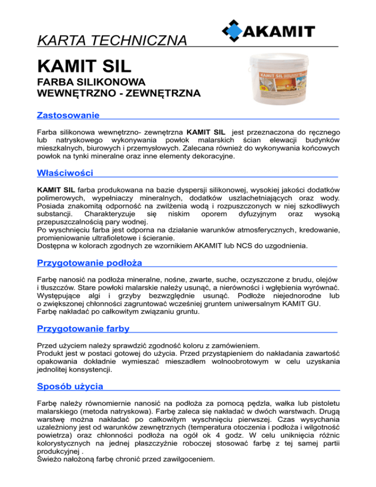 KARTA TECHNICZNA KAMIT SIL FARBA SILIKONOWA WEWNĘTRZNO - ZEWNĘTRZNA Zastosowanie Farba silikonowa wewnętrzno- zewnętrzna KAMIT SIL jest przeznaczona do ręcznego lub natryskowego wykonywania powłok malarskich ścian elewacji budynków mieszkalnych, biurowych i przemysłowych. Zalecana również do wykonywania końcowych powłok na tynki mineralne oraz inne elementy dekoracyjne. Właściwości KAMIT SIL farba produkowana na bazie dyspersji silikonowej, wysokiej jakości dodatków polimerowych, wypełniaczy mineralnych, dodatków uszlachetniających oraz wody. Posiada znakomitą odporność na zwilżenia wodą i rozpuszczonych w niej szkodliwych substancji. Charakteryzuje się niskim oporem dyfuzyjnym oraz wysoką przepuszczalnością pary wodnej. Po wyschnięciu farba jest odporna na działanie warunków atmosferycznych, kredowanie, promieniowanie ultrafioletowe i ścieranie. Dostępna w kolorach zgodnych ze wzornikiem AKAMIT lub NCS do uzgodnienia. Przygotowanie podłoża Farbę nanosić na podłoża mineralne, nośne, zwarte, suche, oczyszczone z brudu, olejów i tłuszczów. Stare powłoki malarskie należy usunąć, a nierówności i wgłębienia wyrównać. Występujące algi i grzyby bezwzględnie usunąć. Podłoże niejednorodne lub o zwiększonej chłonności zagruntować wcześniej gruntem uniwersalnym KAMIT GU. Farbę nakładać po całkowitym związaniu gruntu. Przygotowanie farby Przed użyciem należy sprawdzić zgodność koloru z zamówieniem. Produkt jest w postaci gotowej do użycia. Przed przystąpieniem do nakładania zawartość opakowania dokładnie wymieszać mieszadłem wolnoobrotowym w celu uzyskania jednolitej konsystencji. Sposób użycia Farbę należy równomiernie nanosić na podłoża za pomocą pędzla, wałka lub pistoletu malarskiego (metoda natryskowa). Farbę zaleca się nakładać w dwóch warstwach. Drugą warstwę można nakładać po całkowitym wyschnięciu pierwszej. Czas wysychania uzależniony jest od warunków zewnętrznych (temperatura otoczenia i podłoża i wilgotność powietrza) oraz chłonności podłoża na ogół ok 4 godz. W celu uniknięcia różnic kolorystycznych na jednej płaszczyźnie roboczej stosować farbę z tej samej partii produkcyjnej . Świeżo nałożoną farbę chronić przed zawilgoceniem. KARTA TECHNICZNA KAMIT SIL FARBA SILIKONOWA WEWNĘTRZNO - ZEWNĘTRZNA Zużycie Średnie zużycie przy dwukrotnej aplikacji wynosi ok 0,25 do 0,30 l/m2 W praktyce zużycie uzależnione jest od odpowiedniego i starannego przygotowania podłoża. Dane techniczne Czas wysychania (temp.20º C / wilg. 50%) ok 4 h w cienkiej warstwie Rozcieńczanie farby wodą Max. 5% Przepuszczalność pary wodnej 117g/(m2x24h)m Współczynnik oporu dyfuzyjnego 1528 temperatura podłoża i otoczenia w czasie wykonywania prac od + 10º C do + 25º C. Dokumenty odniesienia Aprobata Techniczna ITB AT-15-8627/2011 Zestaw wyrobów do wykonywania ociepleń ścian zewnętrznych budynków systemem KAMIT W Aprobata Techniczna ITB AT-15-7070/2011 Zestaw wyrobów do wykonywania ociepleń ścian zewnętrznych budynków systemem KAMIT PN-C-81913:1998 Farby dyspersyjne do malowania elewacji budynków Deklaracja zgodności nr SIL/001/DZ 2011 Atest Higieniczny PZH Narzędzia Wiertarka wolnoobrotowa, mieszadło koszyczkowe, pędzel, wałek, pistolet malarski, wiadro. Narzędzia należy czyścić wodą bezpośrednio po ich użyciu. Przechowywanie Przechowywać w oryginalnych, nieuszkodzonych opakowaniach do 12 miesięcy od daty produkcji, w pomieszczeniach suchych i przewiewnych. Chronić przed mrozem oraz przegrzaniem w czasie transportu i składowania. Pakowanie Opakowanie jednostkowe: wiadro 5 l.; wiadro 10 l. Opakowanie zbiorcze: paleta KARTA TECHNICZNA KAMIT SIL FARBA SILIKONOWA WEWNĘTRZNO - ZEWNĘTRZNA Warunki gwarancji Podczas prowadzenia prac budowlanych należy stosować ścisłe zalecenia producenta oraz kierować się zasadami sztuki budowlanej. W przypadku reklamacji wymaga się oryginalnego opakowania oraz dowodu zakupu. Bezpieczeństwo S2 Chronić przed dziećmi S24 Unikać zanieczyszczenia skóry S26 Zanieczyszczone oczy przemyć natychmiast dużą ilością wody i zasięgnąć porady lekarza. S35 Usuwać produkt i jego opakowanie w sposób bezpieczny S46 W razie połknięcia niezwłocznie zasięgnij porady lekarza – pokazać opakowanie lub etykietę Uwaga !!! Producent nie odpowiada za błędy wynikające z wykonawstwa i niewłaściwego przechowywania produktu. W przypadku połączenia naszego produktu z wyrobami innych producentów nie ponosimy żadnej odpowiedzialności. Nie składować palet jedna na drugą. Producent AKAMIT Sp.z o.o. 26-010 Bodzentyn ul. Wolności 3 tel/fax (41)311 54 64 [email protected] Aktualizacja: 04.11.2013r. Niniejsza karta techniczna produktu jest obowiązująca i zastępuje wszystkie poprzednie.