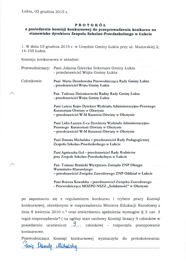 Ł ukta, 03 g ru d n ia 2015 r. PROTOKÓŁ z p o sied zen ia kom isji konkursow ej do przeprow adzenia kon ku rsu na stan ow isk o dyrektora Zespołu S zk oln o-P rzed szk oln ego w Łukcie 1. W d n iu 03 g ru d n ia 2015 r. w Urzędzie Gm iny Ł u k ta przy ul. M azurskiej 2; 14-105 Ł ukta Komisja konkursow a w składzie: Przewodniczący: Pani J o la n ta G órecka S ek retarz G m iny Ł ukta - przedstaw iciel W ójta G m iny Ł ukta C złonkow ie: Pani Marta Drozdowska Przewodnicząca Rady Gminy Łukta - przedstawiciel Wójta Gminy Łukta Pan Tadeusz Dzieniszewski Radny Rady Gminy Łukta - przedstawiciel Wójta Gminy Łukta Pani Larysa Kojro Dyrektor Wydziału Administracyjno-Prawnego Kuratorium Oświaty w Olsztynie - przedstawiciel W-M Kuratora Oświaty w Olsztynie Pani Lidia Łaszyn Z-ca Dyrektora Wydziału AdministracyjnoPrawnego Kuratorium Oświaty w Olsztynie - przedstawiciel W-M Kuratora Oświaty w Olsztynie Pani Danuta Michalska - przedstawiciel Rady Pedagogicznej Zespołu Szkolno-Przedszkolnego w Łukcie Pani Agnieszka Gol - przedstawiciel Rady Rodziców przy Zespole Szkolno-Przedszkolnym w Łukcie Pan Tomasz Branicki Wiceprezes Zarządu ZNP Okręgu Warmińsko-Mazurskiego - przedstawiciel Związku Zawodowego ZNP Oddział w Łukcie Pani Bożena Kowalska - przedstawiciel Związku Zawodowego - Przewodnicząca MOZPO NSZZ „Solidarność” w Olsztynie po zapoznaniu się z regulam inem k o n k u rsu i trybem pracy Komisji konkursow ej, określonym i w rozporządzeniu M inistra E dukacji Narodowej z d n ia 8 kw ietnia 2010 r.*) oraz stw ierdzeniu sp ełn ien ia wymogów § 3 u st. 3 tegoż rozporządzenia*) ( n a ogólny sta n osobowy Komisji liczący 9 członków w posiedzeniu uczestniczy ..S ..... członków) - rozpoczęła postępow anie konkursow e. Przew odnicząca Komisji konkursow ej w yznaczyła do protokołow ania: 2. Przew odnicząca Komisji przedstaw iła doku m en ty złożone przez k a n d y d a ta przystępującego do k o n k u rsu . Ofertę do k o n k u rsu złożył n a stęp u jąc y kandydat: 1) Pan Ryszard K owalski zam . ul. G enerała S ik orsk iego 14; 1 4 -1 0 0 Ostróda. Stw ierdzono nieobecność/ obecność k a n d y d ata zgłoszonego do k o n k u rsu . ..dlćk. ^ .... v .......... Aeo do wMuAlu.. jię soT^auIi 3. Po stw ierdzeniu praw idłowości zaw iadom ienia o term inie i m iejscu k o n k u rsu , kom isja postanow iła kontynuow ać posiedzenie. r \ 4. Komisja przystąpiła do oceny form alnej złożonej oferty, której przebieg przedstaw ia załącznik n r 1 do niniejszego protokółu i podjęła uchw ałę o d o p u szczen iu / —odm ow ie dopus U czenia kandydata do p ostęp ow an ia konkursow ego, z uw zględnieniem postanow ień § 4, u s t. 1 i 2 rozporządzenia*) Uchwała Nr 1 /2 0 1 5 K om isji konkursow ej pow ołanej Z arządzeniem Nr 5 2 /2 0 1 5 Wójta G m iny Łukta z dnia 18 listop ad a 2015 r. do przeprow adzenia konkursu na stan ow isk o dyrektora Z espołu S zkoln oP rzed szkolnego w Łukcie, z dnia 0 3 odm ow y/ d op u szczen ia kandydata: grudnia 2 0 1 5 Pana R yszarda r. w spraw ie K ow alskiego do p ostęp ow an ia konkursow ego, zapadła jed n o g ło śn ie / zw ykłą w ię k sz o ścią ■głosów przy liczb ie „w strzym ujących s ię ” głosów : ...Q... , w „za” ... 9... , „przeciw ” ... 0... , głosow an iu jaw nym . U chw ała stanow i załącznik n r 2 do niniejszego protokółu. 5. Przew odnicząca Komisji konkursow ej u stn ie poinform ow ała k a n d y d a ta o d opuszczeniu ■ / - odm owie-d op^ z egeftła do p ostępow ania konkursowego^ -ora*p r zedstaw iła treść zapis u § 1 -uot. 4 rozpor ządzenia*)1. 6. N astępnie Komisja przeprow adziła rozmowę z k an d y d atem dopuszczonym do postępow ania konkursow ego, dokonując jego m erytorycznej oceny. Przebieg rozmów z kandydatem przedstaw ia załącznik n r 1 do protokółu. 7. Po zakończeniu rozmowy z k a n d y d atem Przew odnicząca Komisji rozdała w szystkim członkom Komisji po jednej karcie do głosow ania, której wzór stanow i załącznik n r 3 do protokółu i kom isja przy stąp iła do głosow ania tajnego. Po obliczeniu głosów, na podstaw ie zebranych k a rt do głosow ania stw ierdzono, że k an d y d at Pan R yszard K ow alski uzyskał n a s tę p u ją c ą liczbę głosów: „za” , „przeciw ” ...6 ... , „w strzym ujących s ię ” . . 3 . . . . Karty z głosow ania stanow ią załącznik n r k do protokółu. 8. Komisja stwierdziła, że w w yniku u**' przeprow adzonego p ostępow ania konkursow ego, w głosow aniu tajnym - w y ło m te/n ie w yłoniła k a n d y d a ta n a dyrektora /'“N Zespołu Szkolno-Przedszkolnego Ryszarda—Kow alsk ie g o, któ iy w Łukcie, w —oso b ie:—Pana nieduży skał bezwzględną(ej większośś(ci) głosów obecnych członków Komisji. 9. Uwagi: ................................................................................................................... J S M L ............... (Podpis Przewodniczącego) Podpisy Członków Komisji: 1. ■)\J? .- . n f e . Ł •. / 1 .... Legenda: *) Rozporządzenie Ministra Edukacji Narodowej z dnia 8 kwietnia 201 Or w sprawie regulaminu konkursu na stanowisko dyrektora publicznej szkoły lub publicznej placówki oraz trybu pracy komisji konkursowej (Dz. U. Nr 60, poz. 373 ze zm. Dz. U. z 2011 r. Nr 254, poz. 1525). Załącznik nr 3 do protokółu z posiedzenia Komisji konkursowej w dniu 03 grudnia 2015 r. U R Z Ą D GMINY 14-105 Łukta, ul. Mazurska 2 tel./fax 089 647 50 70 KARTA DO GŁOSOWANIA W konkursie na stanowisko dyrektora Zespołu Szkolno-Przedszkolnego w Łukcie, przeprowadzonym w dniu 03 grudnia 2015 r. Kandydat: 1. Ryszard Kowalski (im ię i n azw isk o) Głosy: I I „za” □ I „przeciw” 1 „wstrzymuję się od głosowania” . [Informacja o sposobie głosowania należy postaw ić z n a k X w kratce obok w ybranego głosu. Konkurs wyłania kandydata na dyrektora, je że li uczestnik otrzym a bezw zględną w iększ