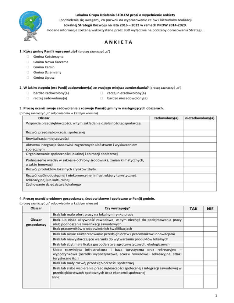 Lokalna Grupa Działania STOLEM prosi o wypełnienie ankiety i podzielenia się uwagami, co pozwoli na wypracowanie celów i kierunków realizacji Lokalnej Strategii Rozwoju na lata 2016 – 2022 w ramach PROW 2014-2020. Podane informacje zostaną wykorzystane przez LGD wyłącznie na potrzeby opracowania Strategii. ANKIETA 1. Którą gminę Pan(i) reprezentuje? (proszę zaznaczyć „x”) Gmina Kościerzyna Gmina Nowa Karczma Gmina Karsin Gmina Dziemiany Gmina Lipusz 2. W jakim stopniu jest Pan(i) zadowolony(a) ze swojego miejsca zamieszkania? (proszę zaznaczyć „x”) bardzo zadowolony(a) raczej niezadowolony(a) raczej zadowolony(a) bardzo niezadowolony(a) 3. Proszę ocenić swoje zadowolenie z rozwoju Pana(i) gminy w następujących obszarach. (proszę zaznaczyć „x” odpowiednio w każdym wierszu) Obszar Wsparcie przedsiębiorczości, w tym zakładania działalności gospodarczej zadowolony(a) niezadowolony(a) Rozwój przedsiębiorczości społecznej Rewitalizacja miejscowości Aktywna integracja środowisk zagrożonych ubóstwem i wykluczeniem społecznym Organizowanie społeczności lokalnej i animacji społecznej Podnoszenie wiedzy w zakresie ochrony środowiska, zmian klimatycznych, a także innowacji Rozwój produktów lokalnych i rynków zbytu Rozwój ogólnodostępnej i niekomercyjnej infrastruktury turystycznej, rekreacyjnej lub kulturalnej Zachowanie dziedzictwa lokalnego 4. Proszę ocenić problemy gospodarcze, środowiskowe i społeczne w Pan(i) gminie. (proszę zaznaczyć „x” odpowiednio w każdym wierszu) Obszar Obszar gospodarczy Czy występują? TAK NIE Brak lub mało ofert pracy na lokalnym rynku pracy Brak lub niska aktywność zawodowa, w tym niechęć do podejmowania pracy i/lub podnoszenia kwalifikacji zawodowych Brak pracowników o odpowiednich kwalifikacjach Brak lub niskie zainteresowanie przedsiębiorstw i pracowników innowacjami Brak lub niewystarczające warunki do wytwarzania produktów lokalnych Brak lub zbyt mała liczba gospodarstwa agroturystycznych, ekologicznych Słabo rozwinięta infrastruktura i baza turystyczna oraz rekreacyjno – wypoczynkowa (ośrodki wypoczynkowe, ścieżki rowerowe i rekreacyjne, szlaki turystyczne itp.) Brak lub mały rozwój przedsiębiorczości społecznej Brak lub słabe wspieranie przedsiębiorczości społecznej i integracji zawodowej w przedsiębiorstwach społecznych oraz ekonomii społecznej Inne: 1 Obszar środowiskowy Obszar społeczny Zanieczyszczone środowisko naturalne Brak dostępu do nowoczesnej technologii w zakresie ochrony środowiska, pozyskiwania energii ze źródeł odnawialnych Nie w pełni rozwinięta infrastruktura techniczna, np. związana z siecią kanalizacji, wodociągów, gazociągów, wytwarzaniem energii ze źródeł odnawialnych, stacje uzdatniania wody itp. Brak lub niska aktywność mieszkańców w zakresie pozyskiwania informacji i/lub wsparcia w zakresie wytwarzania energii ze źródeł odnawialnych Niewystarczający stopień stosowania przez mieszkańców selektywnej zbiórki odpadów oraz powstawanie dzikich wysypisk śmieci Niewystarczające wykorzystanie zasobów przyrodniczych Brak lub słabe działania w zakresie urządzania i porządkowania terenów rekreacyjnych, zielonych, parków itp. Brak lub słabo rozwinięta infrastruktura przy drogach – parkingi, chodniki, oświetlenie itp. Słabo rozwinięta gospodarka niskoemisyjna Inne: Słaby dostęp do opieki społecznej Brak lub niska aktywność społeczna Brak wsparcia dla inicjatyw społecznych mieszkańców Zanikanie tradycji, dziedzictwa kulturowego i zawodów Brak lub niewystarczający rozwój infrastruktury kulturalnej i sportowej (domy kultury, muzea, boiska sportowe itp.) Brak lub niewystarczający rozwój infrastruktury społecznej (np. świetlice, place zabaw itp.) Niewystarczające wykorzystanie istniejącej infrastruktury społecznej Słaba integracja osób zagrożonych ubóstwem i wykluczeniem społecznym ze środowiskiem Brak lub niewystarczające wsparcie integracji społeczno - gospodarczej osób niepełnosprawnych Brak lub niski poziom usług opiekuńczych dla osób starszych Brak lub niewystarczający rozwój infrastruktury wspierającej aktywizację społeczno-gospodarczą osób starszych (np. domy pomocy społecznej, ośrodki opiekuńcze itp.) Brak lub mało form aktywizacji dla osób wykluczonych społecznie (np. kursy, szkolenia doradztwo zawodowe, psychologiczne, działania środowiskowe) Niewystarczający poziom pomocy dla osób ubogich Inne: 5. Jakie grupy społeczne na obszarze Pana(i) gminy mają najbardziej utrudniony dostęp do rynku pracy? (proszę zaznaczyć „x” maksymalnie 5 odpowiedzi) Młodzież w wieku 18 – 29 lat Osoby w wieku 30 – 49 lat Osoby starsze powyżej 50 r.ż. Osoby niepełnosprawne Osoby opuszczające m.in. więzienie, wychowawcze Osoby i rodziny dotknięte patologiami (np. alkoholizmem, narkomanią) ośrodki Osoby długotrwale bezrobotne Absolwenci szkół Osoby nie posiadające kwalifikacji zawodowych Samotne matki Osoby powracające na rynek pracy po urlopach macierzyńskich/wychowawczych Inne; jakie …………………………………………………… 2 6. Proszę wskazać, które z czynników stanowią mocne, a które słabe strony obszaru Pana(i) gminy. (proszę zaznaczyć „x” odpowiednio w każdym wierszu) Czynnik Położenie komunikacyjne Dostępność komunikacyjna Zasoby przyrodnicze, np. lasy, jeziora, rzeki, parki krajobrazowe, pomniki przyrody itp. Zasoby historyczne, np. zabytki, muzea, obiekty sakralne itp. Zasoby kulturowe, np. domy kultury, kino, tradycje, artyści lokalni itp. Zasoby sportowe, np. boiska, kluby sportowe itp. Rekreacja, np. ścieżki rowerowe, place zabaw, ośrodki wypoczynkowe itp. Turystyka, dostępność atrakcji dla turystów Agroturystyka Aktywność w zakresie przedsiębiorczości Zakłady pracy Aktywność społeczna Infrastruktura techniczna, np. sieć wodociągowa, telekomunikacyjna, wytwarzanie energii ze źród