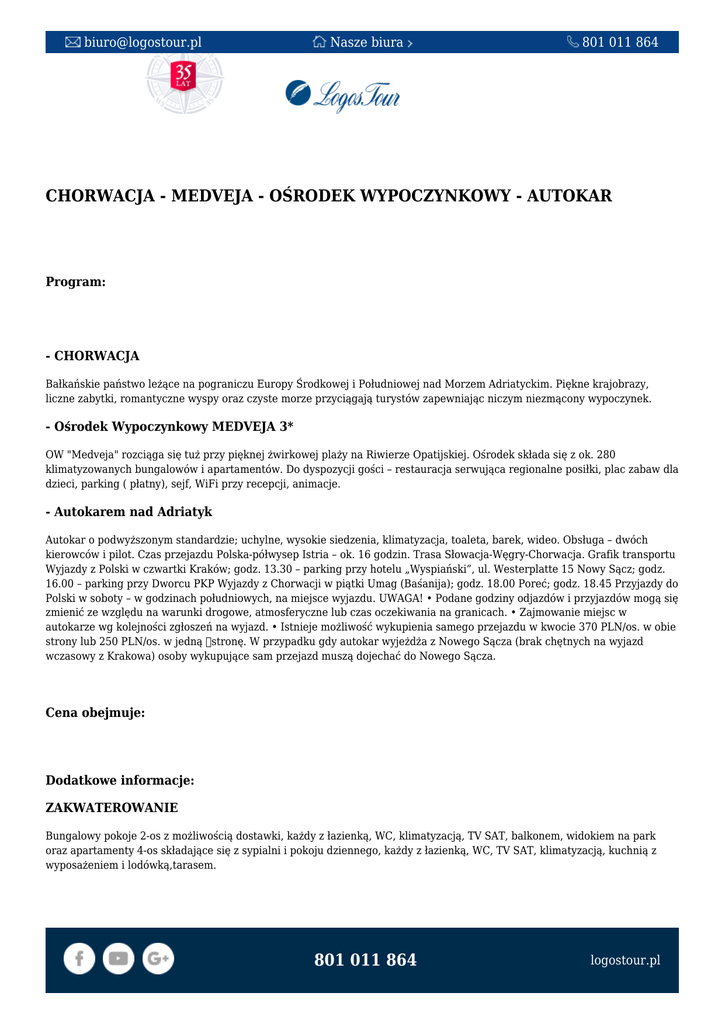 [email protected] Nasze biura 801 011 864 CHORWACJA - MEDVEJA - OŚRODEK WYPOCZYNKOWY - AUTOKAR Program: - CHORWACJA Bałkańskie państwo leżące na pograniczu Europy Środkowej i Południowej nad Morzem Adriatyckim. Piękne krajobrazy, liczne zabytki, romantyczne wyspy oraz czyste morze przyciągają turystów zapewniając niczym niezmącony wypoczynek. - Ośrodek Wypoczynkowy MEDVEJA 3* OW "Medveja" rozciąga się tuż przy pięknej żwirkowej plaży na Riwierze Opatijskiej. Ośrodek składa się z ok. 280 klimatyzowanych bungalowów i apartamentów. Do dyspozycji gości – restauracja serwująca regionalne posiłki, plac zabaw dla dzieci, parking ( płatny), sejf, WiFi przy recepcji, animacje. - Autokarem nad Adriatyk Autokar o podwyższonym standardzie; uchylne, wysokie siedzenia, klimatyzacja, toaleta, barek, wideo. Obsługa – dwóch kierowców i pilot. Czas przejazdu Polska-półwysep Istria – ok. 16 godzin. Trasa Słowacja-Węgry-Chorwacja. Grafik transportu Wyjazdy z Polski w czwartki Kraków; godz. 13.30 – parking przy hotelu „Wyspiański”, ul. Westerplatte 15 Nowy Sącz; godz. 16.00 – parking przy Dworcu PKP Wyjazdy z Chorwacji w piątki Umag (Baśanija); godz. 18.00 Poreć; godz. 18.45 Przyjazdy do Polski w soboty – w godzinach południowych, na miejsce wyjazdu. UWAGA! • Podane godziny odjazdów i przyjazdów mogą się zmienić ze względu na warunki drogowe, atmosferyczne lub czas oczekiwania na granicach. • Zajmowanie miejsc w autokarze wg kolejności zgłoszeń na wyjazd. • Istnieje możliwość wykupienia samego przejazdu w kwocie 370 PLN/os. w obie strony lub 250 PLN/os. w jedną stronę. W przypadku gdy autokar wyjeżdża z Nowego Sącza (brak chętnych na wyjazd wczasowy z Krakowa) osoby wykupujące sam przejazd muszą dojechać do Nowego Sącza. Cena obejmuje: Dodatkowe informacje: ZAKWATEROWANIE Bungalowy pokoje 2-os z możliwością dostawki, każdy z łazienką, WC, klimatyzacją, TV SAT, balkonem, widokiem na park oraz apartamenty 4-os składające się z sypialni i pokoju dziennego, każdy z łazienką, WC, TV SAT, klimatyzacją, kuchnią z wyposażeniem i lodówką,tarasem. 801 011 864 logostour.pl [email protected] Nasze biura 801 011 864 WYŻYWIENIE W bungalowach – śniadania (bufet) i kolacje (wybór menu), w apartamentach we własnym zakresie, napoje do kolacji płatne dodatkowo TRANSPORT Dojazd własny lub autokarem za dopłatą 370 PLN (wyjazdy w czwartki). TERMINY Turnusy tygodniowe od soboty do soboty, w okresie od czerwca do września lub od piątku do piątku w przypadku dojazdu autokarem. ZNIŻKI Dziecko do 12 lat (na dostawce z 2 os. dor.) – gratis, dziecko 0-12 lat (na łóżku) – 30% zniżki, dorosły na dostawce – 15% zniżki CENY W PLN - w bungalowach za osobę z HB i za apartament bez wyżywienia, za turnus tygodniowy. WARUNKI PLATNOŚCI 30% zaliczki przy podpisaniu umowy, dopłata do 100% na 21 dni przed wyjazdem. UBIEZPIECZENIE Obowiązkowe Signal Iduna NW (7000 PLN), KL (15 000 EUR); dodatkowo płatne 25 PLN/osoba. INNE Opłata klimatyczna, udział w imprezach sportowych (animacje) i konkursach w cenie. Terminy: 801 011 864 logostour.pl