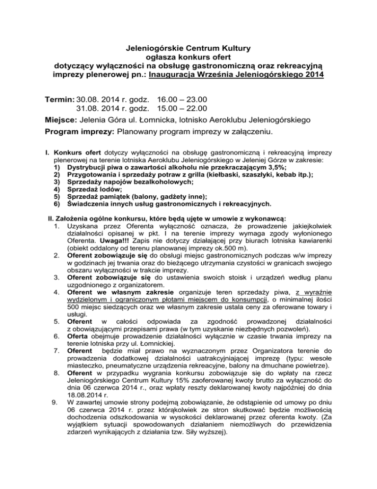 Jeleniogórskie Centrum Kultury ogłasza konkurs ofert dotyczący wyłączności na obsługę gastronomiczną oraz rekreacyjną imprezy plenerowej pn.: Inauguracja Września Jeleniogórskiego 2014 Termin: 30.08. 2014 r. godz. 16.00 – 23.00 31.08. 2014 r. godz. 15.00 – 22.00 Miejsce: Jelenia Góra ul. Łomnicka, lotnisko Aeroklubu Jeleniogórskiego Program imprezy: Planowany program imprezy w załączeniu. I. Konkurs ofert dotyczy wyłączności na obsługę gastronomiczną i rekreacyjną imprezy plenerowej na terenie lotniska Aeroklubu Jeleniogórskiego w Jeleniej Górze w zakresie: 1) Dystrybucji piwa o zawartości alkoholu nie przekraczającym 3,5%; 2) Przygotowania i sprzedaży potraw z grilla (kiełbaski, szaszłyki, kebab itp.); 3) Sprzedaży napojów bezalkoholowych; 4) Sprzedaż lodów; 5) Sprzedaż pamiątek (balony, gadżety inne); 6) Świadczenia innych usług gastronomicznych i rekreacyjnych. II. Założenia ogólne konkursu, które będą ujęte w umowie z wykonawcą: 1. Uzyskana przez Oferenta wyłączność oznacza, że prowadzenie jakiejkolwiek działalności opisanej w pkt. I na terenie imprezy wymaga zgody wyłonionego Oferenta. Uwaga!!! Zapis nie dotyczy działającej przy biurach lotniska kawiarenki (obiekt oddalony od terenu planowanej imprezy ok.500 m). 2. Oferent zobowiązuje się do obsługi miejsc gastronomicznych podczas w/w imprezy w godzinach jej trwania oraz do bieżącego utrzymania czystości w granicach swojego obszaru wyłączności w trakcie imprezy. 3. Oferent zobowiązuje się do ustawienia swoich stoisk i urządzeń według planu uzgodnionego z organizatorem. 4. Oferent we własnym zakresie organizuje teren sprzedaży piwa, z wyraźnie wydzielonym i ograniczonym płotami miejscem do konsumpcji, o minimalnej ilości 500 miejsc siedzących oraz we własnym zakresie ustala ceny za oferowane towary i usługi. 5. Oferent w całości odpowiada za zgodność prowadzonej działalności z obowiązującymi przepisami prawa (w tym uzyskanie niezbędnych pozwoleń). 6. Oferta obejmuje prowadzenie działalności wyłącznie w czasie trwania imprezy na terenie lotniska przy ul. Łomnickiej. 7. Oferent będzie miał prawo na wyznaczonym przez Organizatora terenie do prowadzenia dodatkowej działalności uatrakcyjniającej imprezę (typu: wesołe miasteczko, pneumatyczne urządzenia rekreacyjne, balony na dmuchane powietrze). 8. Oferent w przypadku wygrania konkursu zobowiązuje się do wpłaty na rzecz Jeleniogórskiego Centrum Kultury 15% zaoferowanej kwoty brutto za wyłączność do dnia 06 czerwca 2014 r., oraz wpłaty reszty deklarowanej kwoty najpóźniej do dnia 18.08.2014 r. 9. W zawartej umowie strony podejmą zobowiązanie, że odstąpienie od umowy po dniu 06 czerwca 2014 r. przez którąkolwiek ze stron skutkować będzie możliwością dochodzenia odszkodowania w wysokości deklarowanej przez oferenta kwoty. (Za wyjątkiem sytuacji spowodowanych działaniem niemożliwych do przewidzenia zdarzeń wynikających z działania tzw. Siły wyższej). 10. Organizator zobowiązuje się udzielić oferentowi na zasadzie wyłączności rekomendacji w Wydziale Gospodarczym UM w Jeleniej Górze w celu uzyskania czasowego zezwolenia na sprzedaż piwa po przedłożeniu wymaganych dokumentów (obok wpisu do ewidencji działalności gospodarczej, zezwolenie stałe na sprzedaż alkoholu). Po stronie oferenta leży uzyskanie czasowego zezwolenia na sprzedaż piwa oraz zgody Stacji Sanitarno- Epidemiologicznej na sprzedaż piwa i działalność gastronomiczną. 11. Organizator zobowiązuje się do utrzymania czystości we wszystkich miejscach nie objętych wyłącznością Oferenta w trakcie imprezy. 12. Organizator zapewnia: ustawienie toalet przenośnych typu TOI- TOI w ilości co najmniej 25 sztuk, dostarczenie wody pitnej w cysternie w ilości ok. 4 m3, udostępnienie przyłącza prądu dla potrzeb Oferenta w postaci agregatu prądotwórczego (ustawionego w odległości ok. 30m od wydzielonego terenu) o parametrach: 100 kVA o zabezpieczeniu 2 x 64 A (pracującego w trybie ciągłym w trakcie imprezy oraz godzinę przed i godzinę po zakończeniu imprezy) oraz przyłącza stałego 2x16A dla podtrzymania pracy chłodziarek i światła roboczego poza czasem pracy agregatów. Wszelkie przewody, przedłużacze, przełączniki, skrzynki rozdzielcze i inne niezbędne urządzenia do podłączenia całej gastronomii, Oferent zapewnia we własnym zakresie. 13. Organizator udostępnia Oferentowi teren na prowadzenie działalności zgodnie z potrzebami i możliwościami terenowymi ustalonymi w umowie. 14. Zakres dodatkowej działalności musi zostać zaakceptowany przez Organizatora po czym zostanie ustalony w zawartej z wybranym oferentem umowie. 15. W przypadku odstąpienia od wykonania umowy z winy Oferenta wpłacone zaliczki przechodzą na rzecz Organizatora. III.Oferta powinna zawierać: 1. Aktualny wypis z właściwego rejestru albo zaświadczenie o wpisie do ewidencji działalności gospodarczej potwierdzający dopuszczenie do obrotu prawnego w zakresie objętym ofertą. 2. Określenie wysokości deklarowanej kwoty wpłaty (w PLN brutto) na rzecz JCK za uzyskanie wyłączności ( wg wzoru w załączniku nr 1). 3. Podpisane oświadczenie, że oferent zna i akceptuje wszystkie warunki współpracy ustalone w ogłoszeniu o konkursie. (wg wzoru załączniku nr 1). IV.Procedury związane z wyborem oferty i podpisania umowy. 1. Oferty należy składać do dnia 7 maja 2014 r. do godz. 9.00 w sekretariacie Jeleniogórskiego Centrum Kultury, ul.1 Maja 60, 58-500 Jelenia Góra, w zamkniętych kopertach, z dopiskiem: „Obsługa imprezy plenerowej – Inauguracja września 2014”. 2. Do współpracy zaproszony zostanie oferent deklarujący najwyższą zryczałtowaną kwotę. 3. Wybrany oferent zostanie poinformowany o podjęciu współpracy najpóźniej w dniu 08.05.2014r. 4. Przewidywany termin podpisania umowy do dnia 15.05.2014 r. 5. Oferent zobowiązuje się do wpłaty zaoferow