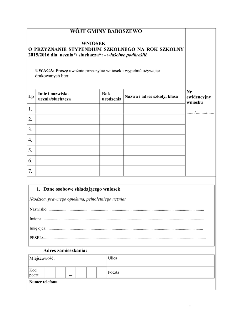 WÓJT GMINY BABOSZEWO WNIOSEK O PRZYZNANIE STYPENDIUM SZKOLNEGO NA ROK SZKOLNY 2015/2016 dla ucznia*/ słuchacza*: - właściwe podkreślić UWAGA: Proszę uważnie przeczytać wniosek i wypełnić używając drukowanych liter. Lp Imię i nazwisko ucznia/słuchacza Rok Nazwa i adres szkoły, klasa urodzenia 1. Nr ewidencyjny wniosku ......./........./...... 2. 3. 4. 5. 6. 7. 1. Dane osobowe składającego wniosek /Rodzica, prawnego opiekuna, pełnoletniego ucznia/ Nazwisko:..................................................................................................................................................... Imiona:.......................................................................................................................................................... Imię ojca:..................................................................................................................................................... PESEL:........................................................................................................................................................... Adres zamieszkania: Ulica Miejscowość: Kod poczt. _ Poczta Numer telefonu 1 2. Wykaz osób pozostających we wspólnym gospodarstwie domowym (w tym dzieci do 24 lat) Stopień pokrewieństwa Imię i nazwisko w stosunku do Wnioskodawcy Źródło dochodu (wstawić np. Rok praca zarobkowa z podaniem nazwy urodzenia zakładu, emerytura, renta, zasiłek rodzinny, alimenty, praca dorywcza itp.) 1. Wnioskodawca 2. 3. 4. 5. 6. 7. 8. 9. 10. 3. W rodzinie występuje (proszę zaznaczyć w kratce po lewej stronie znakiem X): niepełnosprawność ciężka lub długotrwała choroba wielodzietność rodzina jest niepełna bezrobocie alkoholizm wystąpiło zdarzenie losowe narkomania brak umiejętności wypełniania funkcji opiekuńczo-wychowawczych 2 4. Wnioskowane formy pomocy (należy zaznaczyć w kratce znakiem X jedną lub kilka form): całkowite lub częściowe pokrycie kosztów udziału w zajęciach edukacyjnych wykraczających poza zajęcia realizowane w szkole w ramach planu nauczania, całkowite lub częściowe pokrycie kosztów udziału w zajęciach edukacyjnych realizowanych poza szkołą pomoc rzeczowa o charakterze edukacyjnym, w tym w szczególności zakupu podręczników, zakupu pomocy całkowite lub częściowe pokrycie kosztów związanych z pobieraniem nauki poza miejscem zamieszkania świadczenie finansowe 5. Oświadczam, że nie otrzymuję innego stypendium o charakterze socjalnym ze środków publicznych / kryterium to spełniają stypendia unijne i Agencji Własności Rolnej Skarbu Państwa / 6. Oświadczam, że otrzymuję stypendium o charakterze socjalnym ze środków w wysokości ............. zł rocznie publicznych / wysokość miesięcznego stypendium unijnego, Agencji Nieruchomości Rolnych Skarbu Państwa razy ilość miesięcy otrzymywania w 2015 roku / 7. Wyrażam zgodę na przetwarzanie danych osobowych wyłącznie dla potrzeb programu pomocy materialnej. ………………………… miejscowość, data …………………………................................................................................ Podpis Wnioskodawcy ( rodzica lub opiekuna prawnego ucznia niepełnoletniego, ucznia/słuchacza pełnoletniego) 8. Oświadczenie o sytuacji rodzinnej i materialnej ucznia Oświadczam, że moja rodzina składa się z .......... osób, pozostających we wspólnym gospodarstwie domowym. Łączny dochód gospodarstwa domowego wynosi ................................... zł Średni dochód na 1 osobę miesięcznie wynosi ………......zł (słownie: ………................……………….............................................................................……..zł) UWAGA Wniosek można złożyć bez wyliczonego dochodu. W takim przypadku obliczeń dokona pracownik Urzędu Gminy Baboszewo. 3 Do niniejszego oświadczenia załączam dokumenty o dochodach dla każdej osoby pozostającej we wspólnym gospodarstwie domowym: - opodatkowanych na zasadach ogólnych - dochód netto za miesiąc: luty 2016 r. ( np odcinek renty, odcinek emerytury, zaświadczenie o wynagrodzeniu za pracę, zaświadczenie z Powiatowego Urzędu Pracy itp). ................................................................................................................................................................................ ................................................................................................................................................................................ ............................................................................................................................................................................... - inne nie podlegające opodatkowaniu (alimenty - potwierdzone przekazem pocztowym, wyciągiem bankowym itp., średniomiesięczny dochód z pracy dorywczej, dochód z pracy w gospodarstwie rolnym lub zakładzie usługowym, handlowym należącym do członka rodziny, np dochód z pracy w gospodarstwie rolnym należącym do rodziców, a użytkowanych przez dzieci, dochody z pracy wykonywanej za granicą, inne dochody) ................................................................................................................................................................ ................................................................................................................................................................................ ................................................................................................................................................................................ ................................................................................................................................................................................ - informacje o zasiłkach rodzinnych i innej pomocy opieki społecznej (potwierdzenie wydane przez Gminny Ośrodek Pomocy Spo