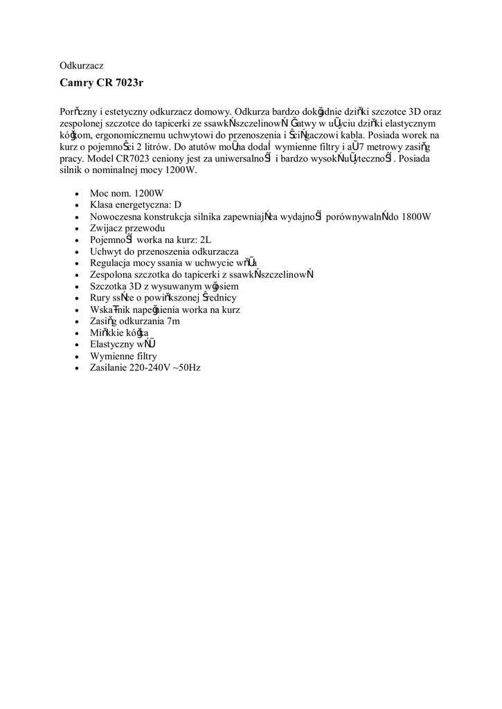 Odkurzacz Camry CR 7023r Poręczny i estetyczny odkurzacz domowy. Odkurza bardzo dokładnie dzięki szczotce 3D oraz zespolonej szczotce do tapicerki ze ssawką szczelinową. Łatwy w użyciu dzięki elastycznym kółkom, ergonomicznemu uchwytowi do przenoszenia i ściągaczowi kabla. Posiada worek na kurz o pojemności 2 litrów. Do atutów można dodać wymienne filtry i aż 7 metrowy zasięg pracy. Model CR7023 ceniony jest za uniwersalność i bardzo wysoką użyteczność. Posiada silnik o nominalnej mocy 1200W. · · · · · · · · · · · · · · · · Moc nom. 1200W Klasa energetyczna: D Nowoczesna konstrukcja silnika zapewniająca wydajność porównywalną do 1800W Zwijacz przewodu Pojemność worka na kurz: 2L Uchwyt do przenoszenia odkurzacza Regulacja mocy ssania w uchwycie węża Zespolona szczotka do tapicerki z ssawką szczelinową Szczotka 3D z wysuwanym włosiem Rury ssące o powiększonej średnicy Wskaźnik napełnienia worka na kurz Zasięg odkurzania 7m Miękkie kółka Elastyczny wąż Wymienne filtry Zasilanie 220-240V ~50Hz