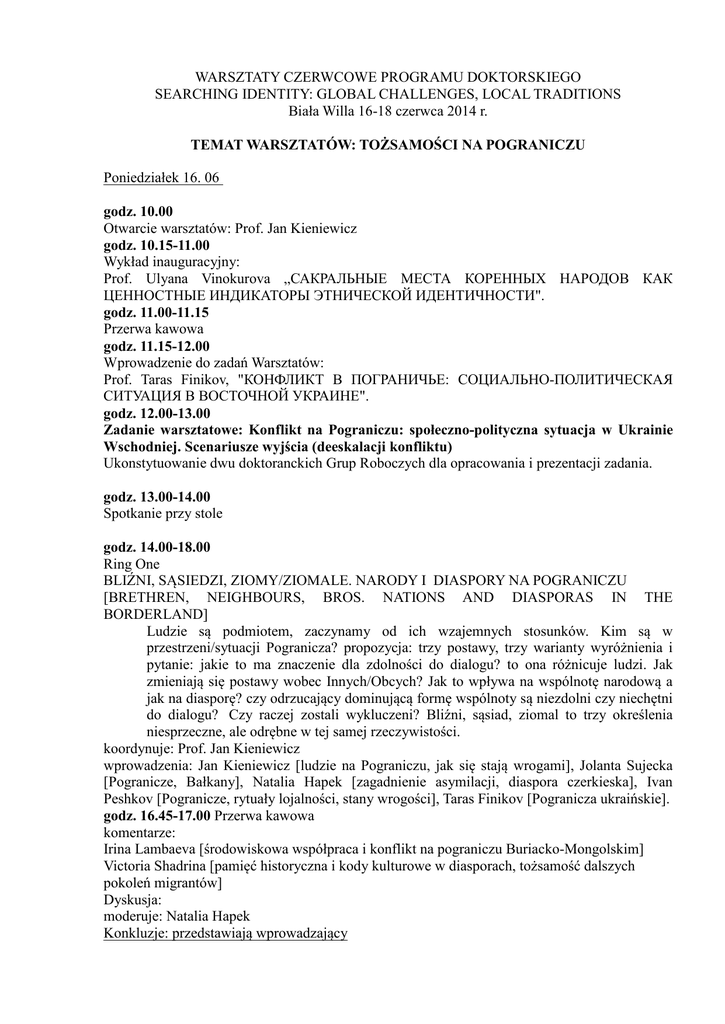 WARSZTATY CZERWCOWE PROGRAMU DOKTORSKIEGO SEARCHING IDENTITY: GLOBAL CHALLENGES, LOCAL TRADITIONS Biała Willa 16-18 czerwca 2014 r. TEMAT WARSZTATÓW: TOŻSAMOŚCI NA POGRANICZU Poniedziałek 16. 06 godz. 10.00 Otwarcie warsztatów: Prof. Jan Kieniewicz godz. 10.15-11.00 Wykład inauguracyjny: Prof. Ulyana Vinokurova „САКРАЛЬНЫЕ МЕСТА КОРЕННЫХ НАРОДОВ КАК ЦЕННОСТНЫЕ ИНДИКАТОРЫ ЭТНИЧЕСКОЙ ИДЕНТИЧНОСТИ". godz. 11.00-11.15 Przerwa kawowa godz. 11.15-12.00 Wprowadzenie do zadań Warsztatów: Prof. Taras Finikov, "КОНФЛИКТ В ПОГРАНИЧЬЕ: СОЦИАЛЬНО-ПОЛИТИЧЕСКАЯ СИТУАЦИЯ В ВОСТОЧНОЙ УКРАИНЕ". godz. 12.00-13.00 Zadanie warsztatowe: Konflikt na Pograniczu: społeczno-polityczna sytuacja w Ukrainie Wschodniej. Scenariusze wyjścia (deeskalacji konfliktu) Ukonstytuowanie dwu doktoranckich Grup Roboczych dla opracowania i prezentacji zadania. godz. 13.00-14.00 Spotkanie przy stole godz. 14.00-18.00 Ring One BLIŹNI, SĄSIEDZI, ZIOMY/ZIOMALE. NARODY I DIASPORY NA POGRANICZU [BRETHREN, NEIGHBOURS, BROS. NATIONS AND DIASPORAS IN THE BORDERLAND] Ludzie są podmiotem, zaczynamy od ich wzajemnych stosunków. Kim są w przestrzeni/sytuacji Pogranicza? propozycja: trzy postawy, trzy warianty wyróżnienia i pytanie: jakie to ma znaczenie dla zdolności do dialogu? to ona różnicuje ludzi. Jak zmieniają się postawy wobec Innych/Obcych? Jak to wpływa na wspólnotę narodową a jak na diasporę? czy odrzucający dominującą formę wspólnoty są niezdolni czy niechętni do dialogu? Czy raczej zostali wykluczeni? Bliźni, sąsiad, ziomal to trzy określenia niesprzeczne, ale odrębne w tej samej rzeczywistości. koordynuje: Prof. Jan Kieniewicz wprowadzenia: Jan Kieniewicz [ludzie na Pograniczu, jak się stają wrogami], Jolanta Sujecka [Pogranicze, Bałkany], Natalia Hapek [zagadnienie asymilacji, diaspora czerkieska], Ivan Peshkov [Pogranicze, rytuały lojalności, stany wrogości], Taras Finikov [Pogranicza ukraińskie]. godz. 16.45-17.00 Przerwa kawowa komentarze: Irina Lambaeva [środowiskowa współpraca i konflikt na pograniczu Buriacko-Mongolskim] Victoria Shadrina [pamięć historyczna i kody kulturowe w diasporach, tożsamość dalszych pokoleń migrantów] Dyskusja: moderuje: Natalia Hapek Konkluzje: przedstawiają wprowadzający Wtorek 17.06 godz. 9.00-13.00 Ring Two ZGLOBALIZOWANY PORZĄDEK KULTUROWY: OD DETERYTORIALIZACJI DO PRZEMIESZCZENIA GLOBALIZED CULTURAL ORDER: FROM DETERRITORIALIZATION TO DISPLACEMENT Co podlega deterytorializacji? Co migruje / wędruje? Renegocjacji podlegają tożsamości ludzi, ale także tożsamości pojęć. Wirtualna przestrzeń już na wstępie jest przestrzenią zdeterytorializowaną, w której wszystko graniczy ze wszystkim i wszyscy ze wszystkimi. Co z tego wynika? Mówi się o kulturowo mobilnych pisarzach, ale też o kulturowo mobilnych tekstach i gatunkach literackich. Mieke Bal pisze o wędrujących pojęciach w humanistyce. Wychodząc od myśli Deleuze'a, Appaduraia i innych teoretyków podejmiemy próbę budowy własnego aparatu pojęciowego do opisu świata w stanie płynności. koordynuje: Prof. Ewa Łukaszyk wprowadzenia: Ewa Łukaszyk godz. 10.45-11.00 przerwa kawowa komentarze: Ewa Łukaszyk [haiku jako wędrująca forma poetycka], Katarzyna Jarzyñska [migranci w poszukiwaniu tożsamości w obcym mieście] Galina Dondukova [deterytorializacja tanki i własnej tożsamości], Bato Dondukov [internet jako nie-geograficzna przestrzeń pograniczna], Dyskusja moderuje: Bato Dondukov Konkluzje: przedstawiają wprowadzający godz. 13.00-14.00 Spotkanie przy stole godz. 14.00-18.00 Ring Three WIDOCZNE – NIEWIDOCZNE: INSTYTUCJE I TOŻSAMOŚCI WSPÓŁCZESNEGO POGRANICZA [VISIBLE-INVISIBLE: INSTITUTIONS AND IDENTITIES OF THE CONTEMPORARY BORDERLAND] Uczestnicy kręgu, analizując transformacje instytucji i tożsamości w postsocjalistycznych i postkolonialnych realiach, skupią się na dwóch wymiarach: „widocznym” (oficjalnym, państwowym, rządowym, instytucjonalnym etc.) oraz „niewidocznym” (lokalnym, oddolnym, nieinstytucjonalnym). Opierając się na różnych case studies, zastanowią się nad tym, jaką rolę owe dwa wymiary odgrywają w konstruowaniu tożsamości na pograniczu. Dyskusji będą towarzyszyły pytania: który z wymiarów ma większą moc sprawczą i większą siłę oddziaływania? Jak instytucje – polityczne, medialne, ekonomiczne i inne – wpływają na tworzenie się społecznych tożsamości? Czy udział w dominującej kulturze wpływa na zanik lokalnych tożsamości? Jak na kulturowym pograniczu formuje się pole negocjacji między tym, co instytucjonalne i oficjalne, a tym, co nieformalne i prywatne? koordynuje: mgr Karolina Szmigielska Wprowadzenia: Maria Yashina [Język i pamięć: jak zmiany społeczne odbijają się w dyskursie publicznym], Karolina Szmigielska [Czy Tybetańczyków, którzy w barach karaoke śpiewają chińskie piosenki w stylu pop, można uznać za ‘prawdziwych Tybetańczyków’?] godz. 15.45-16.00 przerwa kawowa Komentarze: Kamil Wielecki [Czy kiełbasa znaczy? Konsumpcja i tożsamość na pograniczu], Daria Burnashewa [Instytucje i formowanie arktycznej tożsamości], Piotr Wójcik [Czego młodzież chce, a czego nie chce uczyć się w szkole? Jak szkoła wpływa na konstruowanie tożsamości na pograniczu] Dyskusja Moderuje: Kamil Wielecki Konkluzje: przedstawiają wprowadzający godz. 19.00-21.00 Kolacja w ogrodach Środa 18.06 godz. 9.00-13.00 Ring Four TOŻSAMOŚĆ KULTUROWA – MIĘDZY RZECZYWISTOŚCIĄ A KONSTRUKTEM [КУЛЬТУРНАЯ ИДЕНТИЧНОСТЬ: МЕЖДУ РЕАЛЬНОСТЬЮ И КОНСТРУКТОМ] Badanie tożsamości obejmuje dwa ważne kierunki – określenie tożsamości jako podstawy ontologicznej życia ludzkiego oraz traktowanie tożsamości jako narzędzia adaptacji człowieka w zmieniającym się świecie. Czy mo