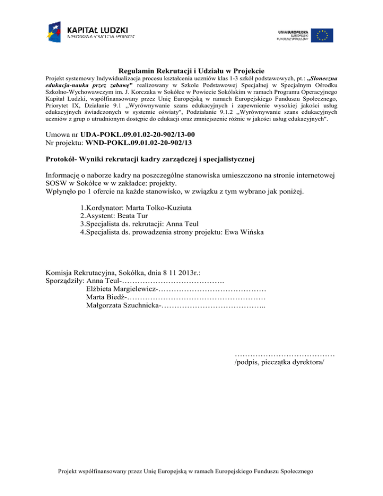 Regulamin Rekrutacji i Udziału w Projekcie Projekt systemowy Indywidualizacja procesu kształcenia uczniów klas 1-3 szkół podstawowych, pt.: ,,Słoneczna edukacja-nauka przez zabawę" realizowany w Szkole Podstawowej Specjalnej w Specjalnym Ośrodku Szkolno-Wychowawczym im. J. Korczaka w Sokółce w Powiecie Sokólskim w ramach Programu Operacyjnego Kapitał Ludzki, współfinansowany przez Unię Europejską w ramach Europejskiego Funduszu Społecznego, Priorytet IX, Działanie 9.1 ,,Wyrównywanie szans edukacyjnych i zapewnienie wysokiej jakości usług edukacyjnych świadczonych w systemie oświaty", Podziałanie 9.1.2 ,,Wyrównywanie szans edukacyjnych uczniów z grup o utrudnionym dostępie do edukacji oraz zmniejszenie różnic w jakości usług edukacyjnych". Umowa nr UDA-POKL.09.01.02-20-902/13-00 Nr projektu: WND-POKL.09.01.02-20-902/13 Protokół- Wyniki rekrutacji kadry zarządczej i specjalistycznej Informację o naborze kadry na poszczególne stanowiska umieszczono na stronie internetowej SOSW w Sokółce w w zakładce: projekty. Wpłynęło po 1 ofercie na każde stanowisko, w związku z tym wybrano jak poniżej. 1.Kordynator: Marta Tolko-Kuziuta 2.Asystent: Beata Tur 3.Specjalista ds. rekrutacji: Anna Teul 4.Specjalista ds. prowadzenia strony projektu: Ewa Wińska Komisja Rekrutacyjna, Sokółka, dnia 8 11 2013r.: Sporządziły: Anna Teul-…………………………………. Elżbieta Margielewicz-…………………………………… Marta Biedź-……………………………………………… Małgorzata Szuchnicka-………………………………….. ………………………………… /podpis, pieczątka dyrektora/ Projekt współfinansowany przez Unię Europejską w ramach Europejskiego Funduszu Społecznego Regulamin Rekrutacji i Udziału w Projekcie Projekt systemowy Indywidualizacja procesu kształcenia uczniów klas 1-3 szkół podstawowych, pt.: ,,Słoneczna edukacja-nauka przez zabawę" realizowany w Szkole Podstawowej Specjalnej w Specjalnym Ośrodku Szkolno-Wychowawczym im. J. Korczaka w Sokółce w Powiecie Sokólskim w ramach Programu Operacyjnego Kapitał Ludzki, współfinansowany przez Unię Europejską w ramach Europejskiego Funduszu Społecznego, Priorytet IX, Działanie 9.1 ,,Wyrównywanie szans edukacyjnych i zapewnienie wysokiej jakości usług edukacyjnych świadczonych w systemie oświaty", Podziałanie 9.1.2 ,,Wyrównywanie szans edukacyjnych uczniów z grup o utrudnionym dostępie do edukacji oraz zmniejszenie różnic w jakości usług edukacyjnych". Umowa nr UDA-POKL.09.01.02-20-902/13-00 Nr projektu: WND-POKL.09.01.02-20-902/13 Protokół- Wyniki rekrutacji kadry specjalistycznej: Informację o naborze kadry na poszczególne stanowiska umieszczono na stronie internetowej SOSW w Sokółce w zakładce: projekty. Dodatkowo skierowano zapytania o złożenie ofert do specjalistów w zakresie: hipoterapii: 1) Stadnina koni na Tatarskim Szlaku, Janusz Cukerman, Drahle 45 16-100 Sokółka, tel:48 503 016 223, e'mail:[email protected] 2) Horse Haeven, ul. Wypoczynkowa 22,15-523 Grabówka-Białystok 3) Jerzy Maliszewski- instruktor hipoterapii, Stadnina koni w Geniuszach koło Sokółki dogoterapii: 1) Fundacja Psi Uśmiech, ul.Pietkiewicza 4d/51,15-689 Białystok, mail: [email protected] 2) VECO- Anna Dojlida-Jurczak-ul.Mieszka Ic, Białystok, pedagog, instruktor dogoterapii 3) Małgorzata Matejczyk-SOSW w Białymstoku, nauczycieldogoterapeuta Wpłynęło po 1 ofercie na każde stanowisko, w związku z tym wybrano jak poniżej. 1. Zajęcia korekcji wad wymowy: Marta Kawrygo-Leonowicz 2. Zajęcia integracji sensorycznej: Bożena Rećko 3. Zajęcia muzykoterapeutyczne: Zyta Biernacka Zajęcia usprawniania manualnego: Marta Tolko-Kuziuta Zajęcia usprawniania technik szkolnych: Beata Tur 6. Hipoterapia- Jerzy Maliszewski 7. Dogoterapia-Anna Dojlida-Jurczak Komisja Rekrutacyjna, Sokółka, dnia 8 11 2013r.: Sporządziły: Anna Teul-…………………………………. Elżbieta Margielewicz-…………………………………… Marta Biedź-……………………………………………… Małgorzata Szuchnicka-………………………………….. ………………………………….. /pieczątka, podpis dyrektora/ Projekt współfinansowany przez Unię Europejską w ramach Europejskiego Funduszu Społecznego