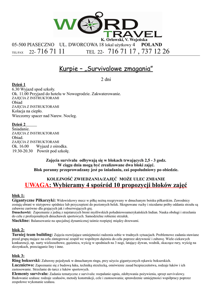 K. Orłowski, V. Wojeńska 05-500 PIASECZNO UL. DWORCOWA 18 lokal użytkowy 4 TEL/FAX 22- 716 71 11 TEL 22- 716 71 17 POLAND , 737 12 26 Kurpie – „Survivalowe zmagania” 2 dni Dzień 1 6.30 Wyjazd spod szkoły. Ok. 11.00 Przyjazd do hotelu w Nowogrodzie. Zakwaterowanie. ZAJĘCIA Z INSTRUKTORAMI Obiad ZAJĘCIA Z INSTRUKTORAMI Kolacja na ciepło. Wieczorny spacer nad Narew. Nocleg. Dzień 2 Śniadanie. ZAJĘCIA Z INSTRUKTORAMI Obiad. ZAJĘCIA Z INSTRUKTORAMI Ok. 16.00 Wyjazd z ośrodka. 19.30-20.30 Powrót pod szkołę. Zajęcia survivalu odbywają się w blokach trwających 2,5 - 3 godz. W ciągu dnia mogą być zrealizowane dwa bloki zajęć. Blok poranny przeprowadzany jest po śniadaniu, zaś popołudniowy po obiedzie. KOLEJNOŚĆ ZWIEDZANIA/ZAJĘĆ MOŻE ULEC ZMIANIE UWAGA: Wybieramy 4 spośród 10 propozycji bloków zajęć blok 1: Gigantyczne Piłkarzyki: Widowiskowy mecz w piłkę nożną rozgrywany w dmuchanym boisku piłkarskim. Zawodnicy zostają ubrani w nietypowe spódnice lub przyczepieni do poziomych belek. Skrępowane ruchy i niezdarne próby oddania strzału są zabawne zarówno dla grających jak i obserwujących grę. Dmuchawki: Zapoznanie z jedną z najstarszych broni myśliwskich południowoamerykańskich Indian. Nauka obsługi i strzelania do celu z profesjonalnych dmuchawek sportowych. Samodzielne robienie strzałek. Slackline: Balansowanie na specjalnej dynamicznej taśmie rozpiętej między drzewami. blok 2: Turniej team building: Zajęcia rozwijające umiejętności radzenia sobie w trudnych sytuacjach. Problemowe zadania stawiane przed grupą mające na celu zintegrować zespół we wspólnym dążeniu do celu poprzez aktywność i zabawę. Wiele ciekawych konkurencji, np. narty wieloosobowe, gąsienica, wyścig w spodniach na 3 nogi, latający dywan, wodnik, skaczące rury, wyścig na skrzynkach, przeciąganie liny i inne. blok 3: Ring bokserski: Zabawny pojedynek w dmuchanym ringu, przy użyciu gigantycznych rękawic bokserskich. Lucznictwo: Zapoznanie się z budową łuku, techniką strzelecką, omówienie zasad bezpieczeństwa, rodzaje łuków i ich zastosowanie. Strzelanie do tarcz z łuków sportowych. Elementy survivalu: Zadania tematyczne z survivalu: rozpalanie ognia, zdobywania pożywienia, sprzęt survivalowy. Budowanie szałasu: rodzaje szałasów, metody konstrukcji, cele i zastosowania; sprawdzenie umiejętności współpracy poprzez zespołowe wykonanie szałasu. blok 4: Przemarsze: Integracja na wojskowo. Piosenka marszowa powiązana z musztrą, nauką podstawowych komend wojskowych oraz zabawna prezentacja defilad przygotowanych przez uczestników. blok 5: Gladiatorzy: Zawodnicy stoją na podwyższeniu, próbują zepchnąć siebie piankowymi pałkami. Wyprawa po lodowe złoto: Zadanie terenowe na orientację, sprawdzające umiejętności poruszania się w terenie, z wykorzystaniem map oraz wskazówek instruktora. Symulator strzelecki: Wirtualne polowanie z wykorzystaniem multimedialnego sprzętu. Pasjonujący trening myśliwski oraz doskonała rozrywka dla każdego blok 6: Survivalowy tor przeszkód Integracyjna zabawa terenowa, podczas której uczestnicy podzieleni na drużyny zmierzają się z różnorodnymi zadaniami związanymi z tematyką survivalu. Wyzwaniem jest np. jak najszybsze rozpalenie ognia, uzyskanie określonej liczby punktów na tarczy strzeleckiej, odnalezienie ukrytego skarbu za pomocą wykrywacza metali. blok 7: Bumperball Superbezpieczna zabawa polegająca na zapasach uczniów ubranych w dmuchane kule. Strzelnica paintballowa Strzelanie do celu z broni paintballowej za pomocą gumowych kulek. Podstawy pierwszej pomocy Zachowanie w przypadku zranień, złamań, omdleń, oparzeń, odmrożeń itp., pozycja właściwa bezpieczna, budowa prowizorycznych noszy, ratownictwo wodne, ćwiczenia z rzutki ratowniczej. blok 8: Gry terenowe: Strażnik totemu – zabawa leśna angażująca uczestników do współpracy i pozwalająca wykazać się umiejętnościami poruszania się po terenie. Zdobywanie flagi – zabawa leśna, angażująca cały zespół do odebrania flagi przeciwnikowi bądź też skutecznej jej ochrony. blok 9: Bramka radarowo – celnościowa: Oddawanie strzałów w dmuchaną bramkę badającą szybkość oddanego strzału oraz w celu rozgrywania zawodów na najcelniejszy strzał zajęć. Terenoznawstwo: Wyznaczanie kierunku, zadania terenowe na orientację sprawdzające umiejętność poruszania się w terenie. Strzelectwo Zajęcia strzeleckie z wykorzystaniem broni pneumatycznej. Zadania sprawdzające pewność ręki oraz celność oka, gdzie czasem zwyczajna tarcza strzelecka okazuje się wielkim wyzwaniem. blok 10 Misja exploris : Uczestnicy podzieleni na zespoły, biorą udział w pieszym rajdzie terenowym. Grupy wyposażone w specjalnie przygotowane mapy, pokonują wyznaczoną trasę, na której zmierzają się z konkurencjami technicznymi, militarnymi i survivalowymi. Stawiane przed nimi zadania wymagają zaangażowania i współpracy. Przykładowe konkurencje na trasie przemarszu: zagadka logiczna, pole minowe, ukryte punkty, kratownica. Jest to program orientacyjny, który może ulec zmianom w zależności od predyspozycji oraz zaangażowania uczestników lub warunków atmosferycznych. W przypadku wystąpienia czynników niesprzyjających proponujemy zamianę zajęć na inne. Czynnikiem niesprzyjającym może być: brak technicznej możliwości realizacji zajęć w danym miejscu, brak dostępności sprzętu w danym terminie, niekorzystne warunki atmosferyczne. W przypadku niekorzystnych warunków atmosferycznych przedstawiamy program alternatywny, po konsultacji oraz za zgodą organizatora (np. gry i zabawy integracyjne, test survivalowy, projekcja filmu szkoleniowego). Liczba instruktorów dostosowana jest do liczby uczestników (1 instruktor / 10-15 osób). Zajęcia prowadzone są równolegle dla wszystkich grup, na które podzielimy uczestników. Firma zapewnia prowadzenie zajęć przez wykwalifikowanych