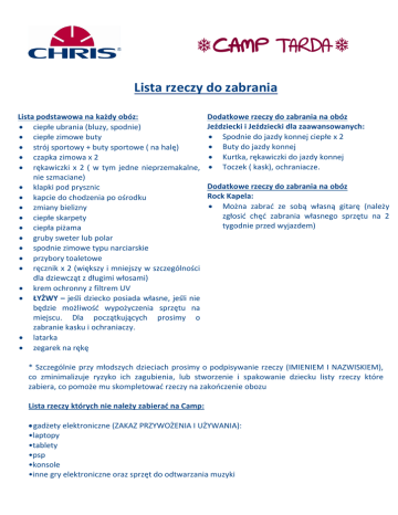 Lista rzeczy do zabrania Lista podstawowa na każdy obóz: ciepłe ubrania (bluzy, spodnie) ciepłe zimowe buty strój sportowy + buty sportowe ( na halę) czapka zimowa x 2 rękawiczki x 2 ( w tym jedne nieprzemakalne, nie szmaciane) klapki pod prysznic kapcie do chodzenia po ośrodku zmiany bielizny ciepłe skarpety ciepła piżama gruby sweter lub polar spodnie zimowe typu narciarskie przybory toaletowe ręcznik x 2 (większy i mniejszy w szczególności dla dziewcząt z długimi włosami) krem ochronny z filtrem UV ŁYŻWY – jeśli dziecko posiada własne, jeśli nie będzie możliwość wypożyczenia sprzętu na miejscu. Dla początkujących prosimy o zabranie kasku i ochraniaczy. latarka zegarek na rękę Dodatkowe rzeczy do zabrania na obóz Jeździecki i Jeździecki dla zaawansowanych: Spodnie do jazdy konnej ciepłe x 2 Buty do jazdy konnej Kurtka, rękawiczki do jazdy konnej Toczek ( kask), ochraniacze. Dodatkowe rzeczy do zabrania na obóz Rock Kapela: Można zabrać ze sobą własną gitarę (należy zgłosić chęć zabrania własnego sprzętu na 2 tygodnie przed wyjazdem) * Szczególnie przy młodszych dzieciach prosimy o podpisywanie rzeczy (IMIENIEM I NAZWISKIEM), co zminimalizuje ryzyko ich zagubienia, lub stworzenie i spakowanie dziecku listy rzeczy które zabiera, co pomoże mu skompletować rzeczy na zakończenie obozu Lista rzeczy których nie należy zabierać na Camp: gadżety elektroniczne (ZAKAZ PRZYWOŻENIA I UŻYWANIA): •laptopy •tablety •psp •konsole •inne gry elektroniczne oraz sprzęt do odtwarzania muzyki •zbędne sprzęty elektryczne (wszystkie rzeczy z tej grupy wchodzą w zakres przedmiotów zakazanych z powodu przepisów PPOŻ) np. prostownice, lokówki, grzałki, z wyjątkiem grzałek do butów, czajniki, przedłużacze ( przeciążenie linii elektrycznych, zagrożenie pożarowe) inne zbędne przedmioty wartościowe np. duże kwoty gotówki, karty do bankomatów. inne: •scyzoryki, noże inne ostre narzędzia •chipsy, napoje gazowane Przypominamy o wprowadzonym ograniczeniu w korzystaniu z telefonów komórkowych przez dzieci i młodzież na terenie Campu/Ośrodka. Z telefonów komórkowych uczestnicy będą mogli korzystać w każdą środę i sobotę w trakcie przerwy obiadowej. Poza tym czasem telefony będą zdeponowane w campowym sejfie. UWAGA! Na obóz przyjmowane są dzieci zdrowe. Jeśli dziecko w dniu wyjazdu jest chore ( ma gorączkę, przyjmuje leki) prosimy o dowóz dziecka kilka dni później. Prosimy również o sprawdzenie głowy dziecka pod kątem wszawicy. To pozwoli na uniknięcie rozprzestrzeniania się chorób zakaźnych i wszy wśród innych uczestników. Z racji ograniczonego miejsca w lukach bagażowy bardzo prosimy o zabieranie bagażu o wadze około 20 kg i walizek o rozmiarze M (średnia) o maksymalnych wymiarach 45x25x65. Adres: Camp Tarda, 11 - 140 Miłomłyn, Tarda 21; tel: (89) 647 32 00 Zakwaterowanie: prosimy o podanie nazwisk dzieci do wspólnego zakwaterowania na karcie kwalifikacyjnej lub poprzez kontakt mailowy lub telefoniczny z BOK, nie później niż na dwa tygodnie przed rozpoczęciem obozu. Przy realizacji zakwaterowania bierzemy pod uwagę datę przyjęcia zgłoszenia. Informujemy również, że w miarę możliwości staramy się zrealizować w tym zakresie wszystkie Państwa prośby.