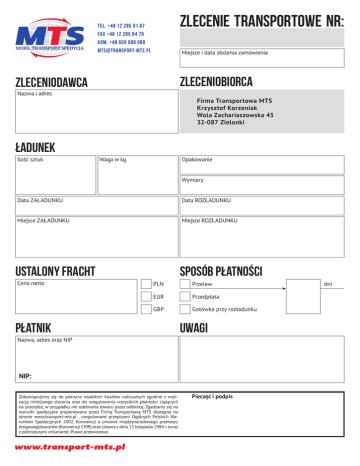 ZLECENIE transportowe nr: tel. +48 12 285 91 87 fax +48 12 285 84 76 kom. +48 609 088 088 [email protected] Miejsce i data złożenia zamówienia Zleceniobiorca Zleceniodawca Nazwa i adres Firma Transportowa MTS Krzysztof Korzeniak Wola Zachariaszowska 43 32-087 Zielonki Ładunek Ilość sztuk Waga w kg Opakowanie Wymiary Data ZAŁADUNKU Data ROZŁADUNKU Miejsce ZAŁADUNKU Miejsce ROZŁADUNKU Ustalony fracht Cena netto Sposób płatności PLN Przelew EUR Przedpłata GBP Gotówka przy rozładunku Płatnik Uwagi Nazwa, adres oraz NIP NIP: Zobowiązujemy się do pokrycia wszelkich kosztów naliczanych zgodnie z realizacją niniejszego zlecenia oraz do uregulowania wszystkich płatności ciążących na przesyłce, w przypadku nie odebrania towaru przez odbiorcę. Zgadzamy się na warunki spedycyjne proponowane przez Firmę Transportową MTS dostępne na stronie www.transport-mts.pl , uregulowane przepisami Ogólnych Polskich Warunków Spedycyjnych 2002, Konwencji o umowie międzynarodowego przewozu drogowegotowarów (Konwencji CMR) oraz Ustawy z dnia 15 listopada 1984 r. (wraz z późniejszymi zmianami): Prawo przewozowe. Pieczęć i podpis dni