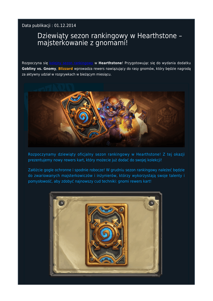 Data publikacji : 01.12.2014 Dziewiąty sezon rankingowy w Hearthstone – majsterkowanie z gnomami! Rozpoczyna się kolejny sezon rankingowy w Hearthstone! Przygotowując się do wydania dodatku Gobliny vs. Gnomy, Blizzard wprowadza rewers nawiązujący do rasy gnomów, który będzie nagrodą za aktywny udział w rozgrywkach w bieżącym miesiącu. Rozpoczynamy dziewiąty oficjalny sezon rankingowy w Hearthstone! Z tej okazji prezentujemy nowy rewers kart, który możecie już dodać do swojej kolekcji! Załóżcie gogle ochronne i spodnie robocze! W grudniu sezon rankingowy należeć będzie do zwariowanych majsterkowiczów i inżynierów, którzy wykorzystają swoje talenty i pomysłowość, aby zdobyć najnowszy cud techniki: gnomi rewers kart! Nowy rewers zastąpi domyślną grafikę na odwrocie kart w waszych taliach. To wspaniały sposób na pochwalenie się swoimi wyczynami w Hearthstone! Aby otrzymać gobliński rewers kart, należy zdobyć rangę 20 w trybie gry rankingowej. Rewers zostanie przyznany na koniec listopadowego sezonu rankingowego. Nie zapominajcie również, że im dalej zajdziecie w danym sezonie rankingowym, tym więcej dodatkowych gwiazdek otrzymacie w kolejnym sezonie. W przypadku trybu rankingowego otrzymacie gwiazdki na podstawie waszych osiągnięć w ubiegłym sezonie – jedną za każdą zdobytą rangę. Miejcie na uwadze, że nawet jeśli bonusowe gwiazdki z poprzedniego sezonu zapewniają wam rozpoczęcie rozgrywki z rangą 20 lub wyższą w nowym sezonie, to i tak musicie przynajmniej raz zalogować się do gry, aby zdobyć nowy rewers kart. Jeżeli nie zamieniliście jeszcze siebie i wszystkich swoich znajomych w kurczaki przy pomocy gnomiego rekombobulatora, najwyższy czas wskoczyć do gry, pomajsterkować co nieco przy taliach i wspiąć się na sam szczyt klasyfikacji rankingowej! Przy okazji życzymy wam wszystkim wesołych Świąt Bożego Narodzenia! Źródło: Battle.net Autor: Sigmar Liczba wyświetleń strony: 2088 Data publikacji : 01.12.2014 Tagi: rewers, sezon rankingowy Komentarz (0) dodaj komentarz Brak komentarzy dodaj komentarz Pozostałe nowości DreamHack Open: Valencia 2016 - Nerchio w półfinale - live! DreamHack Valencia to jedno z największych e-sportowych wydarzeń w Europie - dlatego nie mogło zabraknąć na nim StarCrafta II! W czasie rozgrywek 96 graczy będzie konkurować o 50 000 USD oraz 5 000 punktów WCS.Data publikacji: 16.07.20161 Aktualizacja 3.4 – Duże zmiany w rankingu StarCrafta II Na oficjalnym blogu Blizzarda pojawił się nowy wpis dotyczący tym razem zmian w rankingach: Ranking StarCrafta II jest areną dla niezwykle zaciętej rywalizacji. Do walki rusza wielu uczestników, ale tylko nieliczni awansują do ścisłej czołówki.Data publikacji: 03.07.20160 Rozpoczęcie trzeciego sezonu rankingowego 2016 Trzeci sezon tegorocznych rozgrywek ligowych w StarCrafta II uważamy za otwarty! Zresetowano pulę punktów premiowych oraz rankingi i przyznano nagrody za sezon drugi roku 2016.Data publikacji: 26.06.20160 Filmowy „Warcraft” już wkrótce w księgarniach! Powieść „Warcraft”, której wydanie zbiega się z polską premierą filmu „Warcraft. Początek” w reżyserii Duncana Jonesa, do księgarń trafi już 15 czerwca. Na kartach książki czytelnicy wkroczą w nowy wymiar emocji towarzyszących bohaterom fikcyjnych światów Azeroth i Draenor. Za sprawą Christie Golden, pisarki od lat cenionej przez fanów świata Warcraft, konflikt ludzi i orków nabierze jeszcze większej intensywności.Data publikacji: 13.06.20160 Blokada obecnego sezonu i darmowa zmiana nazwy postaci Jak czytamy na oficjalnym blogu Blizzarda: Obecny sezon rankingowy zbliża się ku końcowi i wkrótce zamknięte zostaną wszystkie ligi i dywizje. Kilka dni przed rozpoczęciem nowego sezonu, darmowa zmiana nazwy postaci w StarCraft II zostanie ponownie dodana do wszystkich kont, dla których funkcja ta nie jest obecnie dostępna.Data publikacji: 12.06.20160 Wszystkie nowości