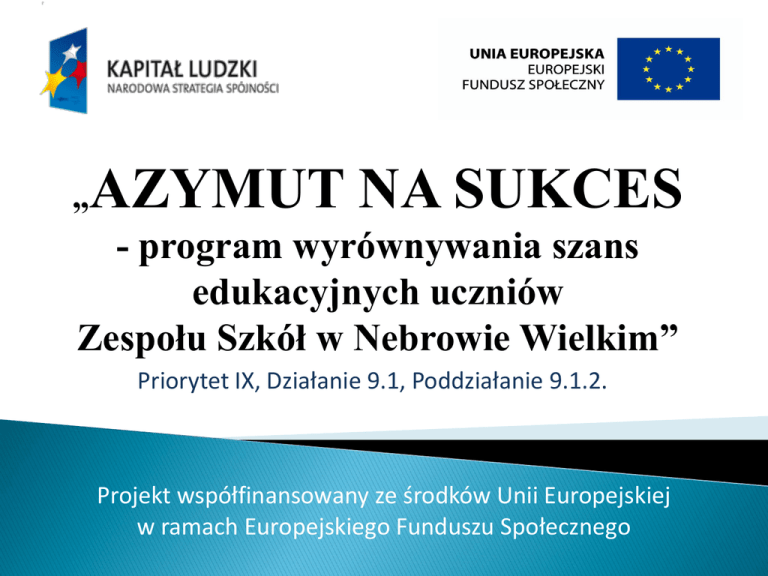 „ AZYMUT NA SUKCES - program wyrównywania szans edukacyjnych uczniów Zespołu Szkół w Nebrowie Wielkim” Priorytet IX, Działanie 9.1, Poddziałanie 9.1.2. Projekt współfinansowany ze środków Unii Europejskiej w ramach Europejskiego Funduszu Społecznego Projekt współfinansowany ze środków Unii Europejskiej w ramach Europejskiego Funduszu Społecznego CELE PROJEKTU: Celem ogólnym projektu jest wyrównywanie szans edukacyjnych uczniów Zespołu Szkół w Nebrowie Wielkim. Celami szczegółowymi projektu są: podniesienie poziomu kompetencji w zakresie nauk matematycznoprzyrodniczych, poprawa znajomości języków obcych, podniesienie umiejętności informatycznych, zwiększenie dostępu do kultury i sztuki, zmiana motywacji i aktywności uczniów z nastawieniem na sukces i dowartościowanie, podniesienie jakości nauczania poprzez zastosowanie aktywizujących metod, badań odkryć, zajęć w terenie, podniesienie jakości procesu dydaktycznego poprzez zastosowanie nowoczesnych środków medialnych. Projekt współfinansowany ze środków Unii Europejskiej w ramach Europejskiego Funduszu Społecznego Cele ogólne: Celem ogólnym projektu jest : wyrównywanie szans edukacyjnych 240 uczniów Zespołu Szkół w Nebrowie Wielkim. Poprzez udział w: 11 kołach zainteresowań, 2 kursach przygotowawczych, 4 zespołach wyrównawczych, 5 wyjazdach edukacyjnych - uczniowie będą wyrównywać szanse, szczególnie w zakresie kompetencji kluczowych: matematyczno – przyrodniczych, technologii informacyjnej oraz języków obcych. Projekt współfinansowany ze środków Unii Europejskiej w ramach Europejskiego Funduszu Społecznego Cele szczegółowe: Celami szczegółowymi projektu są: - podniesienie poziomu kompetencji kluczowych u uczniów w zakresie nauk matematyczno-przyrodniczych głównie matematyki, fizyki, chemii czy geografii, - poprawa znajomości języków obcych, - podniesienie umiejętności informatycznych, - zwiększenie dostępu do kultury i sztuki, - zmiana motywacji i aktywności uczniów z nastawieniem na sukces i dowartościowanie, - podniesienie jakości nauczania poprzez zastosowanie aktywizujących metod, badań, odkryć, zajęć w terenie, -podniesienie jakości procesu dydaktycznego poprzez zastosowanie nowoczesnych środków medialnych. Projekt współfinansowany ze środków Unii Europejskiej w ramach Europejskiego Funduszu Społecznego Zajęcia w projekcie: Klasy I - III Szkoły Podstawowej Koło języka angielskiego, Koło twórczości plastycznej, Zajęcia wyrównawcze z matematyki, Koło historyczne-Śladami historii, Koło teatralne. Klasy IV-VI Szkoły Podstawowej Koło Matematyczne Asy, Zajęcia wyrównawcze z matematyki, Koło historyczne-Śladami historii, Klub szkolnych literatów, Koło informatyczne, Sprawny umysł, sprawne ciało - zajęcia sportowe, Koło języka angielskiego, Koło teatralne, Co w trawie piszczy - koło badawcze - przyrodniczo-ekologiczne, Koło twórczości plastycznej, Sprawny umysł, sprawne ciało - zajęcia taneczne Projekt współfinansowany ze środków Unii Europejskiej w ramach Europejskiego Funduszu Społecznego Klasy I-III gimnazjum Koło Matematyczne Asy, Klub Przyjaciół Einsteina - koło eksperymentów fizyczno-chemicznych, Młodzi odkrywcy - koło geograficzne, Koło języka angielskiego, Zajęcia wyrównawcze z matematyki, Koło teatralne, Koło informatyczne, Koło twórczości plastycznej, Koło historyczne-Śladami historii, Klub szkolnych literatów, Sprawny umysł, sprawne ciało - zajęcia sportowe, Sprawny umysł, sprawne ciało - zajęcia taneczne. Poprzez udział w: 11 kołach zainteresowań, 2 kursach przygotowawczych, 4 zespołach wyrównawczych, 5 wyjazdach edukacyjnych - uczniowie mogą wyrównywać szanse, szczególnie w zakresie kompetencji kluczowych: matematyczno – przyrodniczych, technologii informacyjnej oraz języków obcych. Projekt współfinansowany ze środków Unii Europejskiej w ramach Europejskiego Funduszu Społecznego Zarząd projektu: Lidera projektu – koordynator – Mariola Strzelczyk Ekspert do spraw monitoringu, ewaluacji i promocji – Dorota Laskowska Obsługa księgowa – Alicja Nakonieczna Obsługa finansowa – Beata Tesmer Pomocy biurowa – Lucyna Sochacka Czas realizacji: 01.07.2009 r. – 31.11.2011r. Projekt współfinansowany ze środków Unii Europejskiej w ramach Europejskiego Funduszu Społecznego Działania: Cykl działań obejmuje 11 kół zainteresowań ukierunkowanych głównie na rozwój kompetencji kluczowych. Innowacyjne zajęcia nastawione będą na kształcenie umiejętności logicznego myślenia, poznawanie świata przez badania i doświadczenia. Udział każdego ucznia w wyjazdach wzbogaci ich osobowość i aktywność poznawczą. Udział w wycieczkach do muzeum archeologicznego czy planetarium – namacalnie przybliży tajniki nauki. Elementem wspierającym zajęcia jest cykl 5 warsztatów wzmacniających osobowość i postawy społeczne. Warsztaty ,,Gimnastyka mózgu i języka” pozwolą nauczyć się umiejętności koncentracji i efektywniejszego zapamiętywania. Całość tworzy zamknięty cykl, który jest kluczem do sukcesu. Każdy uczeń będzie miał szanse na wzbogacenie własnej osobowości i wyrównanie szans. Publikacja współfinansowana ze środków Unii Europejskiej w ramach Europejskiego Funduszu Społecznego Dodatkowe zajęcia dla uczniów: Koła zainteresowań: - Koło ,,Matematyczne Asy” – dla kl. IV – VI szkoły podstawowej - 1 godz. i I- III gimnazjum – 2 godz./tydz.(2 grupy po 15 osób). - Klub Przyjaciół Einsteina – koło eksperymentów fizyczno – chemicznych dla kl.I – III gimnazjum – 2 godz/tydz. (1 grupa – 20 osób). - Koło informatyczne dla klas IV – VI szkoły podstawowej 2 godz. i I- III gimnazjum – 2 godz./tydzień ( 2 grupy po 15 osób). - Młodzi odkrywcy – koło geograficzne dla kl.I- III gimnazjum 2 godz/tydz. ( 1 grupa 20 osób). - Śladami historii – koło historyczne - dla klas IV 