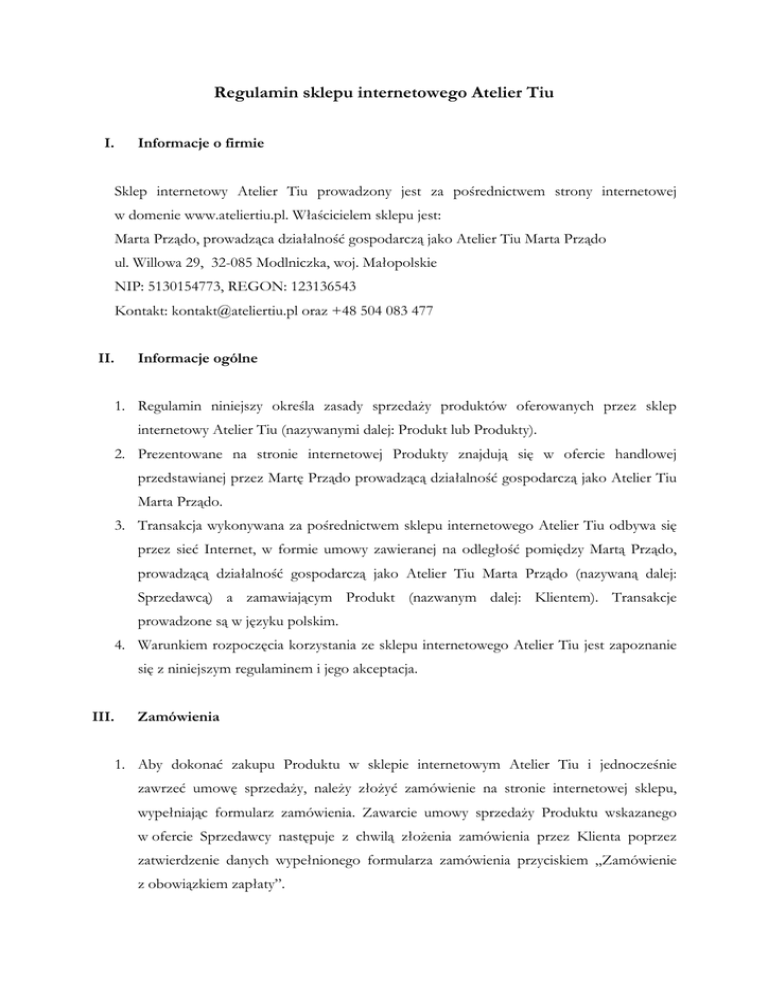 Regulamin sklepu internetowego Atelier Tiu I. Informacje o firmie Sklep internetowy Atelier Tiu prowadzony jest za pośrednictwem strony internetowej w domenie www.ateliertiu.pl. Właścicielem sklepu jest: Marta Prządo, prowadząca działalność gospodarczą jako Atelier Tiu Marta Prządo ul. Willowa 29, 32-085 Modlniczka, woj. Małopolskie NIP: 5130154773, REGON: 123136543 Kontakt: [email protected] oraz +48 504 083 477 II. Informacje ogólne 1. Regulamin niniejszy określa zasady sprzedaży produktów oferowanych przez sklep internetowy Atelier Tiu (nazywanymi dalej: Produkt lub Produkty). 2. Prezentowane na stronie internetowej Produkty znajdują się w ofercie handlowej przedstawianej przez Martę Prządo prowadzącą działalność gospodarczą jako Atelier Tiu Marta Prządo. 3. Transakcja wykonywana za pośrednictwem sklepu internetowego Atelier Tiu odbywa się przez sieć Internet, w formie umowy zawieranej na odległość pomiędzy Martą Prządo, prowadzącą działalność gospodarczą jako Atelier Tiu Marta Prządo (nazywaną dalej: Sprzedawcą) a zamawiającym Produkt (nazwanym dalej: Klientem). Transakcje prowadzone są w języku polskim. 4. Warunkiem rozpoczęcia korzystania ze sklepu internetowego Atelier Tiu jest zapoznanie się z niniejszym regulaminem i jego akceptacja. III. Zamówienia 1. Aby dokonać zakupu Produktu w sklepie internetowym Atelier Tiu i jednocześnie zawrzeć umowę sprzedaży, należy złożyć zamówienie na stronie internetowej sklepu, wypełniając formularz zamówienia. Zawarcie umowy sprzedaży Produktu wskazanego w ofercie Sprzedawcy następuje z chwilą złożenia zamówienia przez Klienta poprzez zatwierdzenie danych wypełnionego formularza zamówienia przyciskiem „Zamówienie z obowiązkiem zapłaty”. 2. Obowiązek zapłaty wskazany, o którym mowa w ust. 1 powyżej, oznacza przyjęcie przez Klienta oferty Sprzedawcy i obowiązek dokonania przez Klienta zapłaty należności na rzecz Sprzedawcy. 3. Do realizacji zamówienia wymagane jest podanie: imienia i nazwiska, pełnego adresu do realizacji dostawy oraz danych kontaktowych (numer telefonu i/lub e-mail). 4. Zastrzega się prawo odmowy zamówień budzących uzasadnioną wątpliwość, tzn. bez podania adresu e-mail i/lub numeru telefonu, pod którymi można dokonać potwierdzenia przyjęcia zamówienia. 5. Klient może wprowadzić zmiany w zamówieniu lub wycofać zamówienie do momentu jego wysłania. Wprowadzanie zmian lub wycofanie jest możliwe poprzez kontakt telefoniczny pod numerem telefonu: +48 504 083 477 (naliczana jest opłata jak za standardowe połączenie telefoniczne, którą ponosi Klient za każdą rozpoczętą minutę połączenia według operatora sieci Klienta). 6. W terminie 3 dni od dnia zawarcia umowy sprzedaży Sprzedawca dostarcza Klientowi potwierdzenie zawarcia umowy na odległość utrwalonej na trwałym nośniku. Klient akceptując niniejszy regulamin wyraża zgodę na otrzymanie potwierdzenia zawarcia umowy utrwalonego w postaci dokumentu elektronicznego w formacie *.PDF dostarczonego poprzez przesłanie wiadomości elektronicznej e-mail na adres poczty elektronicznej Klienta. Klient może cofnąć zgodę na przekazanie potwierdzenia zawarcia umowy utrwalonego w postaci dokumentu elektronicznego poprzez złożenie stosownego oświadczenia w „Uwagach do zamówienia” podczas składania zamówienia. W przypadku cofnięcia zgody na przekazanie potwierdzenia zawarcia umowy utrwalonego w postaci dokumentu elektronicznego lub nie wskazania adresu e-mail Klienta, Sprzedawca dostarczy potwierdzenie zawarcia umowy wraz z Produktem. 7. Każdorazowo wraz z dostarczonym Produktem Sprzedawca przekazuje Klientowi dowód zakupu Produktu. IV. Ceny Produktów i płatność 1. Wszystkie ceny w sklepie internetowym Atelier Tiu są cenami brutto, a wyrażone są w złotych polskich i nie zawierają kosztów przesyłki, które określone są niniejszym regulaminem, a potwierdzane każdorazowo w podsumowaniu zamówienia według szczegółowej specyfikacji określonej przez Klienta. 2. Cena podana przy każdym Produkcie jest wiążąca w chwili złożenia przez Klienta zamówienia. 3. Zastrzega się prawo do zmiany cen Produktów znajdujących się w ofercie sklepu internetowego, wprowadzania nowych Produktów do oferty, przeprowadzania i odwoływania akcji promocyjnych na stronach sklepu, bądź wprowadzania w nich zmian. 4. Klient może wybrać następujące formy płatności za zamówione produkty: • przelew pieniężny na rachunek bankowy właściciela sklepu: ING Bank Śląski S.A. PL 77 1050 1445 1000 0091 4788 1255 BIC (SWIFT): INGBPLPW • zapłata przy odbiorze – za pobraniem 5. W przypadku konieczności wystawienia faktury VAT, należy w chwili złożenia zamówienia w rubryce „Uwagi do zamówienia” przesłać stosowną informację oraz dokładne dane niezbędne do poprawnego wystawienia faktury VAT. V. Koszty i termin dostawy 1. Czas wysłania Produktu to 3 dni robocze liczone od dnia otrzymania płatności za zamówienie (w przypadku wyboru płatności na rachunek bankowy) lub 3 dni robocze liczone od dnia otrzymania zamówienia (w przypadku wyboru płatności przy odbiorze – za pobraniem). 2. Wysyłka paczek odbywa się za pośrednictwem: • Paczkomatów InPost (w tym wypadku płatność wyłącznie przelewem) • Usługi kurierskiej DPD Polska Sp. z o.o. • Usługi Poczty Polskiej – paczka pocztowa 3. Do każdego zamówienia realizowanego na terenie Polski doliczany jest koszt dostawy: Dostawca Koszt (płatność przelewem) Koszt (płatność za pobraniem) Paczkomaty InPost bezpłatnie brak możliwości Kurier DPD Polska 16,99 złotych 21,99 złotych Poczta Polska bezpłatnie Bezpłatnie 4. Koszt przesyłki realizowanej poza granicami Polski uzgadniany będzie każdorazowo po złożeniu przez Klienta stosownej informacji podczas składania zamówienia. VI. Wymiana, reklamacja i odstąpienie od umowy 1. Produkty oferowane w sklepie internetowym 