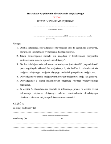 Instrukcja wypełnienia oświadczenia majątkowego /WZÓR/ OŚWIADCZENIE MAJĄTKOWE ……………………………………………………. (wypełnić kogo dotyczy) ………………………….............., dnia ……………………….. r. (miejscowość) Uwaga: 1. Osoba składająca oświadczenie obowiązana jest do zgodnego z prawdą, starannego i zupełnego wypełnienia kaŜdej z rubryk. 2. JeŜeli poszczególne rubryki nie znajdują w konkretnym przypadku zastosowania, naleŜy wpisać „nie dotyczy”. 3. Osoba składająca oświadczenie zobowiązana jest określić przynaleŜność poszczególnych składników majątkowych, dochodów i zobowiązań do majątku odrębnego i majątku objętego małŜeńską wspólnotą majątkową. 4. Oświadczenie o stanie majątkowym dotyczy majątku w kraju i za granicą. 5. Oświadczenie o stanie majątkowym obejmuje równieŜ wierzytelności pienięŜne. 6. W części A oświadczenia zawarte są informacje jawne, w części B zaś informacje niejawne dotyczące adresu zamieszkania składającego oświadczenia oraz miejsca połoŜenia nieruchomości. CZĘŚĆ A Ja niŜej podpisany (a) , ……………………………………………………………………………………. (imiona i nazwisko oraz nazwisko rodowe) urodzony (a) ……………….…………..…… w ………..……………………….. …………………………………………………………………………………… ……………………………………………………………………………………. (miejsce zatrudnienia, stanowisko lub funkcja) Po zapoznaniu się z przepisami ustawy z dnia 8 marca 1990 r. o samorządzie gminnym (Dz. U. z 2001 r. Nr 142, poz. 1591 oraz z 2002 r. Nr 23, poz. 220, Nr 62, poz. 558, Nr 113, poz. 984, Nr 153, poz. 1271 i Nr 214, poz. 1806), zgodnie z art. 24h tej ustawy oświadczam, Ŝe posiadam wchodzące w skład małŜeńskiej wspólności majątkowej lub stanowiące mój majątek odrębny: I. Zasoby pienięŜne: - środki pienięŜne zgromadzone w walucie polskiej: 5.000 zł – podać stan na koniec roku, którego dotyczy oświadczenie, np. (podać zarówno gotówkę posiadaną w domu, jak i środki znajdujące się na rachunkach bankowych, a takŜe będące w dyspozycji osób trzecich np. udzielone poŜyczki)* - środki pienięŜne zgromadzone w walucie obcej: 1.000 USD* 500 EUR* (podać zarówno gotówkę posiadaną w domu, jak i środki znajdujące się na rachunkach bankowych, a takŜe będące w dyspozycji osób trzecich np. udzielone poŜyczki) - papiery wartościowe: obligacje Skarbu Państwa szt. 22 zakupione w roku 2000 za kwotę: kwotę 12.000 zł, akcje spółek giełdowych (podać ilość, wartość nabycia, rok nabycia i emitenta akcji)* - zaznaczyć czy stanowi to wspólność małŜeńską czy teŜ majątek odrębny składającego oświadczenie II. 1. Dom o powierzchni: 120 m2, o wartości: 250.000 zł, nabyty w roku 1997 (kwota nabycia i rok nabycia, a takŜe forma nabycia) – np. zakup, spadek, darowizna, zamiana; w przypadku otrzymania w drodze spadku lub darowizny wartość rynkowa z dnia nabycia, w przypadku zamiany kwota stanowiąca zapłaconą róŜnicę wartości, w przypadku budowy indywidualnej wysokość poniesionych faktycznie wydatków do końca roku dot. oświadczenia tytuł prawny: (nr aktu notarialnego bądź decyzji zezwolenia na budowę)* 2. Mieszkanie o powierzchni: 60 m2, o wartości: 120000 zł, , nabyte w roku 1997 (kwota nabycia i rok nabycia, a takŜe forma nabycia) – np. zakup, spadek, darowizna, zamiana; w przypadku otrzymania w drodze spadku lub darowizny wartość rynkowa z dnia nabycia, w przypadku zamiany kwota stanowiąca zapłaconą róŜnicę wartości, w przypadku budowy indywidualnej wysokość poniesionych faktycznie wydatków do końca roku dot. oświadczenia tytuł prawny: spółdzielcze własnościowe prawo do lokalu, (nr. aktu notarialnego bądź decyzji zezwolenia na budowę …)* 3. Gospodarstwo rolne: rodzaj gospodarstwa: rolne, ogrodnicze, hodowla, inne powierzchnia: 2 ha o wartości: kwota nabycia i rok nabycia, oraz forma nabycia, np. zakup, spadek, darowizna itp. rodzaj zabudowy: podać budynki gospodarczo-produkcyjne tytuł prawny: nr aktu notarialnego* Z tego tytułu osiągnąłem (ęłam) w roku ubiegłym przychód i dochód w wysokości: kwota przychodu to kwota osiągnięta ze sprzedaŜy produkcji osiągniętej z tego gospodarstwa; (naleŜy tu równieŜ uwzględnić dotacje otrzymane ze środków Unii Europejskiej) 4. Inne nieruchomości: powierzchnia: działki budowlane, rekreacyjne, domy mieszkalne, letniskowe, obiekty produkcyjno handlowe i ich powierzchnia o wartości: kwota nabycia i rok nabycia, oraz forma nabycia, np. zakup, spadek, darowizna itp. tytuł prawny: nr aktu notarialnego* * zaznaczyć czy stanowi to wspólność małŜeńską czy teŜ majątek odrębny składającego oświadczenie III. 1. Posiadam udziały w spółkach handlowych z udziałem gminnych osób prawnych lub przedsiębiorców, w których uczestniczą takie osoby – naleŜy podać liczbę i emitenta udziałów: np. 20 udziałów w XYZ spółka z o.o. (podać siedzibę spółki) nabyte w roku 2001, w przypadku przedsiębiorcy (osoby fizycznej) gdzie siedzibą firmy jest adres zamieszkania podać ten adres, ewentualnie NIP ……………………………………………………………………………... udziały te stanowią pakiet większy niŜ 10 % udziałów w spółce: ……………………………… nie ………………………………………… ……………………………………………………………………………... Z tego tytułu osiągnąłem(ęłam) w roku ubiegłym dochód w wysokości: dochodu nie osiągnąłem …………………………………………………... ……………………………………………………………………………... 2. Posiadam udziały w innych spó