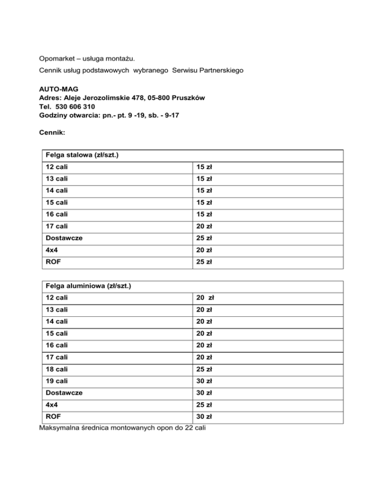Opomarket – usługa montażu. Cennik usług podstawowych wybranego Serwisu Partnerskiego AUTO-MAG Adres: Aleje Jerozolimskie 478, 05-800 Pruszków Tel. 530 606 310 Godziny otwarcia: pn.- pt. 9 -19, sb. - 9-17 Cennik: Felga stalowa (zł/szt.) 12 cali 15 zł 13 cali 15 zł 14 cali 15 zł 15 cali 15 zł 16 cali 15 zł 17 cali 20 zł Dostawcze 25 zł 4x4 20 zł ROF 25 zł Felga aluminiowa (zł/szt.) 12 cali 20 zł 13 cali 20 zł 14 cali 20 zł 15 cali 20 zł 16 cali 20 zł 17 cali 20 zł 18 cali 25 zł 19 cali 30 zł Dostawcze 30 zł 4x4 25 zł ROF 30 zł Maksymalna średnica montowanych opon do 22 cali Dodatkowe usługi: Przechowalnia opon 60-80 zł Serwis mechaniczny: TAK Lista usług serwisu mechanicznego: • Wymiana oleju – od 40 zł • Wymiana klocków – od 60 zł • Wymiana tarcz – od 100 zł • Serwis tarcz – od 100 zł • Serwis klimatyzacji - od 80 zł • Naprawa układów wydechowych • Myjnia samochodowa ręczna Do odebrania zamówienia w Serwisie Partnerskim konieczne będą: a) numer zamówienia Klienta, dane Klienta: imię, nazwisko, adres b) unikalny numer zamówienia - ma postać 17 cyfrowego ciągu znaków. Jest przekazywany Serwisowi i Klientowi drogą elektroniczną (via mail). c) podpisanie przez Klienta karty odbioru towaru O możliwości odbioru towaru w serwisie Klient zostaje poinformowany drogą mailową. Najczęściej możliwość taka istnieje po 48 godzinach licząc od daty złożenia i opłacenia zamówienia. Na odbiór z usługą montażu Klient ma maksymalnie 5 dni roboczych. Serwis ma obowiązek zagwarantować Klientowi termin montażu w okresie do dwóch dni roboczych od daty dostarczenia opon. Zakup opon wraz z ich montażem przebiega analogicznie jak w przypadku innych zamówień z tą różnicą, że podczas składania zamówienia w sekcji wybór metody dostawy i płatności wybrać należy opcję: [miejscowość] odbiór z montażem w serwisie (...) Po złożeniu zamówienia należy telefonicznie zarezerwować termin montażu. W przypadku dodatkowych pytań - zapraszamy do kontaktu.