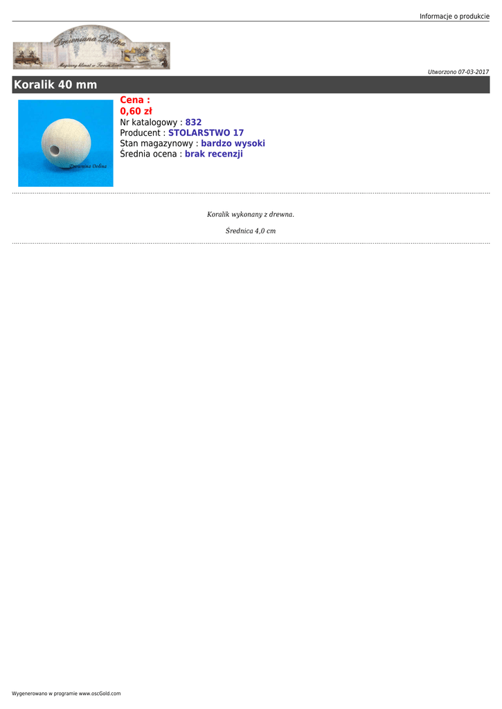 Informacje o produkcie Utworzono 07-03-2017 Koralik 40 mm Cena : 0,60 zł Nr katalogowy : 832 Producent : STOLARSTWO 17 Stan magazynowy : bardzo wysoki Średnia ocena : brak recenzji Koralik wykonany z drewna. Średnica 4,0 cm Wygenerowano w programie www.oscGold.com