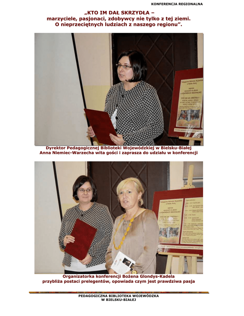 KONFERENCJA REGIONALNA „KTO IM DAŁ SKRZYDŁA – marzyciele, pasjonaci, zdobywcy nie tylko z tej ziemi. O nieprzeciętnych ludziach z naszego regionu”. Dyrektor Pedagogicznej Biblioteki Wojewódzkiej w Bielsku-Białej Anna Niemiec-Warzecha wita gości i zaprasza do udziału w konferencji Organizatorka konferencji Bożena Glondys-Kadela przybliża postaci prelegentów, opowiada czym jest prawdziwa pasja PEDAGOGICZNA BIBLIOTEKA WOJEWÓDZKA W BIELSKU-BIAŁEJ KONFERENCJA REGIONALNA Anna Bojanowicz-Pollak, polonistka, wieloletni doradca metodyczny RODN „WOM” w Bielsku-Białej, pasjonatka dziejów Bielska-Białej i regionu relacjonuje biografię i pasje Marii Wardas, pisarki i lotniczki Zbigniew Micherdziński, animator kultury w Regionalnym Ośrodku Kultury w Bielsku-Białej, promotor sztuki ludowej opowiada o spotkaniach z utalentowanymi twórcami ludowymi naszego regionu PEDAGOGICZNA BIBLIOTEKA WOJEWÓDZKA W BIELSKU-BIAŁEJ KONFERENCJA REGIONALNA Publiczność z zainteresowaniem słucha wykładów Tymoteusz Król, Wilamowianin, działacz na rzecz zachowania kultury i języka wilamowskiego zakreśla historię Wilamowic i ich mieszkańców, prezentuje język wilamowski PEDAGOGICZNA BIBLIOTEKA WOJEWÓDZKA W BIELSKU-BIAŁEJ KONFERENCJA REGIONALNA i stroje wilamowskie noszone na różne okazje, zawierające elementy szkockiej kraty, motywy tureckie oraz kwiatowe, wykonane starą metodą klockową PEDAGOGICZNA BIBLIOTEKA WOJEWÓDZKA W BIELSKU-BIAŁEJ