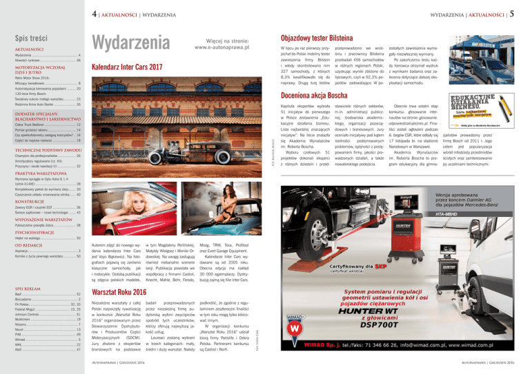 4 | AKTUALNOŚCI | WYDARZENIA Spis treści AKTUALNOŚCI Wydarzenia................................................ 4 Nowości rynkowe...................................... 46 MOTORYZACJA WCZORAJ, DZIŚ I JUTRO Wydarzenia WYDARZENIA | AKTUALNOŚCI | 5 Objazdowy tester Bilsteina Więcej na stronie: www.e-autonaprawa.pl W lipcu po raz pierwszy przyjechał do Polski mobilny tester zawieszenia firmy Bilstein i wtedy skontrolowano nim 327 samochody, z których 8,3% kwalifikowało się do naprawy. Drugą turę testów Kalendarz Inter Cars 2017 Retro Motor Show 2016: Milczący świadkowie................................... 8 Automatyzacja kierowania pojazdami.......... 20 przeprowadzono we wrześniu i pracownicy Bilsteina przebadali 456 samochodów w różnych regionach Polski, uzyskując wyniki zbliżone do lipcowych, czyli w 92,3% pojazdów zadowalające. W po- zostałych zawieszenia wymagały niezwłocznej wymiany. Po zakończeniu testu każdy kierowca otrzymał wydruk z wynikami badania oraz zalecenia dotyczące dalszej eksploatacji samochodu. Doceniona akcja Boscha 130-lecie firmy Bosch: Światowy sukces małego warsztatu............. 23 Rodzinna firma Auto-Starter....................... 35 DODATEK SPECJALNY: BLACHARSTWO I LAKIERNICTWO Cobra Truck Bedliner................................. 12 Pomiar grubości lakieru.............................. 14 Czy spektrofotometry zastąpią kolorystów?... 16 Fot. Bilstein, Bosch Części do napraw nadwozi......................... 18 TECHNICZNE PODSTAWY ZAWODU Champion dla profesjonalistów................... 26 Amortyzatory regulowane (cz. XII): Przyczyny i skutki kawitacji (I).................... 32 Kapituła ekspertów wybrała 51 inicjatyw do pierwszego w Polsce zestawienia „Edukacyjne działania biznesu. Lista najbardziej znaczących inicjatyw”. Na liście znalazła się Akademia Wynalazców. im. Roberta Boscha. Wyboru czołowych 51 projektów dokonali eksperci z różnych dziedzin i przed- stawiciele różnych sektorów, m.in. administracji publicznej, środowiska akademickiego, organizacji pozarządowych i biznesowych. Jury oceniało inicjatywy pod kątem istotności podejmowanych problemów, spójności z postępowaniem firmy, jakości prowadzonych działań, a także nowatorskiego podejścia. Obecnie trwa ostatni etap konkursu: głosowanie internautów na stronie: glosowanie. odpowiedzialnybiznes.pl. Finaliści zostali ogłoszeni podczas 6. targów CSR, które odbyły się 17 listopada br. na stadionie Narodowym w Warszawie. Akademia Wynalazców. im. Roberta Boscha to program edukacyjny dla gimna- zjalistów prowadzony przez firmę Bosch od 2011 r. Jego celem jest popularyzacja wśród młodzieży przedmiotów ścisłych oraz zainteresowanie jej uczelniami technicznymi. PRAKTYKA WARSZTATOWA Wymiana sprzęgła w Oplu Astra G 1.4 . (silnik X14XE).......................................... 28 Kompleksowy pakiet do wymiany oleju........ 30 Czyszczenie układu smarowania silnika....... 40 KONSTRUKCJE Zawory EGR i czujniki EGT......................... 36 Świece zapłonowe – nowe technologie........ 43 WYPOSAŻENIE WARSZTATÓW Pyłoszczelne pokrętła Zebra........................ 38 PSYCHOINSPIRACJE Hejter na wybiegu..................................... 50 Aspiracje.................................................... 3 Komiks z życia pewnego warsztatu.............. 50 SPIS REKLAM Basf........................................................ 52 Boccadamo................................................ 2 FA Polska........................................... 32, 33 Federal Mogul ................................... 15, 25 Johnson Controls...................................... 51 Multichem................................................ 19 Nissens..................................................... 7 Novol...................................................... 13 PIM......................................................... 49 Wimad....................................................... 5 WKŁ........................................................ 22 Wolf........................................................ 47 Autorem zdjęć do nowego wydania kalendarza Inter Cars jest Voyo Bąkiewicz. Na fotografiach pojawią się zarówno klasyczne samochody, jak i motocykle. Ozdobą publikacji są zdjęcia polskich modelek, w tym Magdaleny Perlińskiej, Matyldy Wielgosz i Moniki Ordowskiej. Na uwagę zasługują również niebanalne scenerie sesji. Publikacja powstała we współpracy z firmami Castrol, Knecht, Mahle, Behr, Ferodo, Moog, TRW, Texa, Profitool oraz Evert Garage Equipment. Kalendarze Inter Cars wydawane są od 2005 roku. Obecna edycja ma nakład. 30 000 egzemplarzy. Dystrybucją zajmą się filie Inter Cars. Warsztat Roku 2016 Niezależne warsztaty z całej Polski rozpoczęły rywalizację w konkursie „Warsztat Roku 2016” organizowanym przez Stowarzyszenie Dystrybutorów i Producentów Części Motoryzacyjnych (SDCM). Jury złożone z ekspertów branżowych na podstawie Autonaprawa | Grudzień 2016 badań przeprowadzonych przez niezależną firmę audytorską wyłoni zwycięzców spośród tych uczestników, którzy oferują najwyższą jakość usług. Laureaci zostaną wybrani w trzech kategoriach: mały, średni i duży warsztat. Należy podkreślić, że zgodnie z regulaminem zeszłoroczni finaliści w tym roku mogą tylko kibicować innym. W organizacji konkursu „Warsztat Roku 2016” udział biorą firmy Partslife i Dekra Polska. Partnerami konkursu są Castrol i Norfi. Fot. Inter Cars OD REDAKCJI Autonaprawa | Grudzień 2016