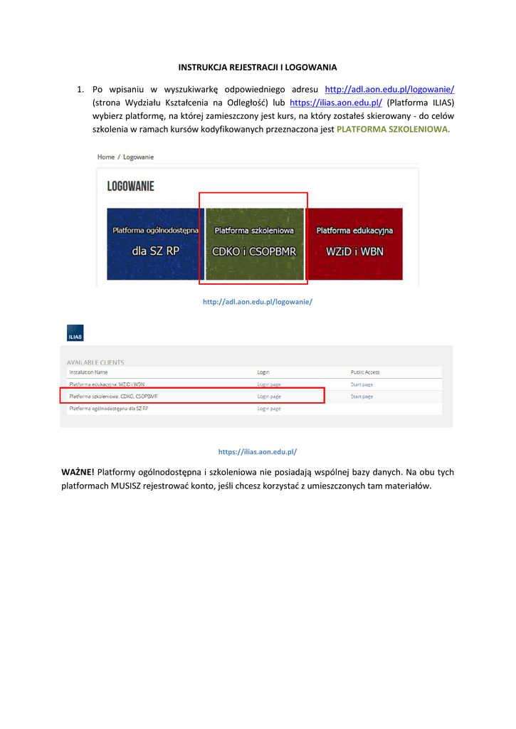 INSTRUKCJA REJESTRACJI I LOGOWANIA 1. Po wpisaniu w wyszukiwarkę odpowiedniego adresu http://adl.aon.edu.pl/logowanie/ (strona Wydziału Kształcenia na Odległość) lub https://ilias.aon.edu.pl/ (Platforma ILIAS) wybierz platformę, na której zamieszczony jest kurs, na który zostałeś skierowany - do celów szkolenia w ramach kursów kodyfikowanych przeznaczona jest PLATFORMA SZKOLENIOWA. http://adl.aon.edu.pl/logowanie/ https://ilias.aon.edu.pl/ WAŻNE! Platformy ogólnodostępna i szkoleniowa nie posiadają wspólnej bazy danych. Na obu tych platformach MUSISZ rejestrować konto, jeśli chcesz korzystać z umieszczonych tam materiałów. 2. Po wybraniu odpowiedniej platformy zostaniesz przeniesiony na ekran logowania i rejestracji. Jeśli posiadasz już swoje konto na platformie wpisz w okna loginu i hasła odpowiednie dane. 3. Jeśli masz już konto, lecz nie pamiętasz loginu lub hasła skorzystaj z opcji przypominania, zamieszczonych pod panelem logowania. 4. Jeśli nie posiadasz konta na platformie wybierz z opcji zawartych pod panelem logowania opcję „Rejestracja nowego konta”. 5. Po wybraniu opcji rejestracji nowego konta zostaniesz przeniesiony do formularza danych, niezbędnych do utworzenia konta. Aby założyć konto należy wypełnić pola oznaczone czerwoną gwiazdką. Sugerowaną formułą loginu jest pierwsza litera imienia.nazwisko (j.kowalski, a.nowak). Jeśli twój wybrany login został już wcześniej. wykorzystany, dodaj do niego cyfrę (j.kowalski1, a.nowak2). Hasło proszę wybrać i wpisać wg własnego uznania (wymagane jest min. 6 znaków, w tym min. 1 cyfra). Po wypełnieniu wszystkich danych zatwierdź formularz przyciskiem REJESTRUJ. 6. Po pozytywnym założeniu nowego konta zostaniesz skierowany na właściwą platformę. UWAGA! Jeśli w prawym górnym rogu platformy szkoleniowej widnieje hasło LOGIN, oznacza to, że NIE JESTES zalogowany. Kliknij na to hasło, aby się zalogować. 7. Z listy wyświetlających się kursów kodyfikowanych wybierz ten, na który jesteś skierowany. Zwróć uwagę na termin (niektóre kursy mają kilka edycji) oraz na dane kontaktowe – dzięki nim będziesz mógł uzyskać pomoc w razie występujących problemów technicznych. 8. Aby zapisać się do konkretnego kursu należy kliknąć na jego nazwę, po czym potwierdzić chęć udziału w kursie wysyłając informację do opiekuna oraz administratora kursu. Umożliwi to opiekunowi zweryfikowanie danych osób mających dostęp do materiałów kursowych. Po pozytywnym przejściu weryfikacji otrzymasz dostęp do kursu, o czym zostaniesz poinformowany drogą mailową. 9. Po pomyślnym przejściu weryfikacji i uzyskaniu dostępu będziesz mógł zapoznać się z materiałami zamieszczonymi w kursie. Dla ułatwienia zostały one posortowane w dwóch kategoriach. PANEL OGÓLNY to treści, które są wspólne dla wszystkich kursów na platformie szkoleniowej, a ich ukończenie jest obligatoryjne. PANEL SPECJALISTYCZNY to treści związane ściśle z tematyką kursu, a warunki ich wykonywania określane są przez opiekunów kursów. Informacje końcowe. Aby pomyślnie zakończyć część wstępną e-learningową kursu należy zaliczyć wszystkie moduły, co sygnalizowane jest zieloną kropką przy kursie. W razie występowania jakichkolwiek trudności należy skorzystać z danych kontaktowych zamieszczonych pod kodem i nazwą kursu. Życzymy powodzenia, Wydział Kształcenia na Odległość