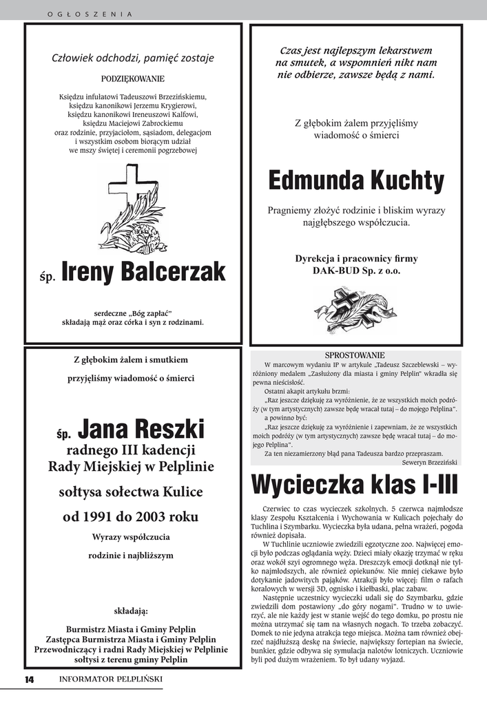 O G Ł O S Z E N I A Człowiek odchodzi, pamięć zostaje PODZIĘKOWANIE Księdzu infułatowi Tadeuszowi Brzezińskiemu, księdzu kanonikowi Jerzemu Krygierowi, księdzu kanonikowi Ireneuszowi Kalfowi, księdzu Maciejowi Zabrockiemu oraz rodzinie, przyjaciołom, sąsiadom, delegacjom i wszystkim osobom biorącym udział we mszy świętej i ceremonii pogrzebowej Czas jest najlepszym lekarstwem na smutek, a wspomnień nikt nam nie odbierze, zawsze będą z nami. Z głębokim żalem przyjęliśmy wiadomość o śmierci Edmunda Kuchty Pragniemy złożyć rodzinie i bliskim wyrazy najgłębszego współczucia. śp. Ireny Balcerzak Dyrekcja i pracownicy firmy DAK-BUD Sp. z o.o. serdeczne „Bóg zapłać” składają mąż oraz córka i syn z rodzinami. Z głębokim żalem i smutkiem przyjęliśmy wiadomość o śmierci śp. Jana Reszki radnego III kadencji Rady Miejskiej w Pelplinie sołtysa sołectwa Kulice od 1991 do 2003 roku Wyrazy współczucia rodzinie i najbliższym składają: Burmistrz Miasta i Gminy Pelplin Zastępca Burmistrza Miasta i Gminy Pelplin Przewodniczący i radni Rady Miejskiej w Pelplinie sołtysi z terenu gminy Pelplin 14 INFORMATOR PELPLIŃSKI SPROSTOWANIE W marcowym wydaniu IP w artykule „Tadeusz Szczeblewski – wyróżniony medalem „Zasłużony dla miasta i gminy Pelplin” wkradła się pewna nieścisłość. Ostatni akapit artykułu brzmi: „Raz jeszcze dziękuję za wyróżnienie, że ze wszystkich moich podróży (w tym artystycznych) zawsze będę wracał tutaj – do mojego Pelplina”. a powinno być: „Raz jeszcze dziękuję za wyróżnienie i zapewniam, że ze wszystkich moich podróży (w tym artystycznych) zawsze będę wracał tutaj – do mojego Pelplina”. Za ten niezamierzony błąd pana Tadeusza bardzo przepraszam. Seweryn Brzeziński Wycieczka klas I-III Czerwiec to czas wycieczek szkolnych. 5 czerwca najmłodsze klasy Zespołu Kształcenia i Wychowania w Kulicach pojechały do Tuchlina i Szymbarku. Wycieczka była udana, pełna wrażeń, pogoda również dopisała. W Tuchlinie uczniowie zwiedzili egzotyczne zoo. Najwięcej emocji było podczas oglądania węży. Dzieci miały okazję trzymać w ręku oraz wokół szyi ogromnego węża. Dreszczyk emocji dotknął nie tylko najmłodszych, ale również opiekunów. Nie mniej ciekawe było dotykanie jadowitych pająków. Atrakcji było więcej: film o rafach koralowych w wersji 3D, ognisko i kiełbaski, plac zabaw. Następnie uczestnicy wycieczki udali się do Szymbarku, gdzie zwiedzili dom postawiony „do góry nogami”. Trudno w to uwierzyć, ale nie każdy jest w stanie wejść do tego domku, po prostu nie można utrzymać się tam na własnych nogach. To trzeba zobaczyć. Domek to nie jedyna atrakcja tego miejsca. Można tam również obejrzeć najdłuższą deskę na świecie, największy fortepian na świecie, bunkier, gdzie odbywa się symulacja nalotów lotniczych. Uczniowie byli pod dużym wrażeniem. To był udany wyjazd.