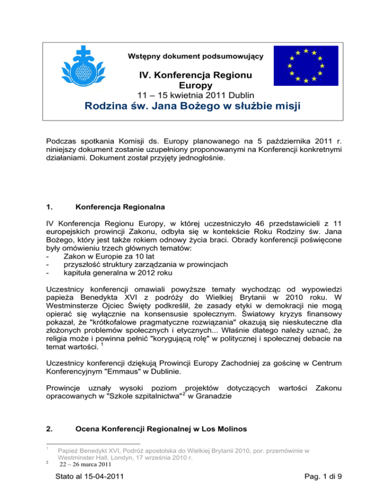 Wstępny dokument podsumowujący IV. Konferencja Regionu Europy 11 – 15 kwietnia 2011 Dublin Rodzina św. Jana Bożego w służbie misji Podczas spotkania Komisji ds. Europy planowanego na 5 października 2011 r. niniejszy dokument zostanie uzupełniony proponowanymi na Konferencji konkretnymi działaniami. Dokument został przyjęty jednogłośnie. 1. Konferencja Regionalna IV Konferencja Regionu Europy, w której uczestniczyło 46 przedstawicieli z 11 europejskich prowincji Zakonu, odbyła się w kontekście Roku Rodziny św. Jana Bożego, który jest także rokiem odnowy życia braci. Obrady konferencji poświęcone były omówieniu trzech głównych tematów: Zakon w Europie za 10 lat przyszłość struktury zarządzania w prowincjach kapituła generalna w 2012 roku Uczestnicy konferencji omawiali powyższe tematy wychodząc od wypowiedzi papieża Benedykta XVI z podróży do Wielkiej Brytanii w 2010 roku. W Westminsterze Ojciec Święty podkreślił, że zasady etyki w demokracji nie mogą opierać się wyłącznie na konsensusie społecznym. Światowy kryzys finansowy pokazał, że "krótkofalowe pragmatyczne rozwiązania" okazują się nieskuteczne dla złożonych problemów społecznych i etycznych... Właśnie dlatego należy uznać, że religia może i powinna pełnić "korygującą rolę" w politycznej i społecznej debacie na temat wartości. 1 Uczestnicy konferencji dziękują Prowincji Europy Zachodniej za gościnę w Centrum Konferencyjnym "Emmaus" w Dublinie. Prowincje uznały wysoki poziom projektów dotyczących opracowanych w "Szkole szpitalnictwa" 2 w Granadzie 2. 1 2 wartości Zakonu Ocena Konferencji Regionalnej w Los Molinos Papież Benedykt XVI, Podróż apostolska do Wielkiej Brytanii 2010, por. przemówinie w Westminster Hall, Londyn, 17 września 2010 r. 22 – 26 marca 2011 Stato al 15-04-2011 Pag. 1 di 9 Z przeprowadzonej oceny wynika, ze główne punkty dokumentu końcowego zostały wprowadzone w życie, choć pewne projekty są jeszcze na etapie realizacji. Są też tematy, które należą do nieustających wyzwań i wymagają stałej uwagi. Należy wśród nich podkreślić: dalszy rozwój i zacieśnianie współpracy między prowincjami; odnosi się to ogólnie także do współpracy międzyprowincjalnej w Europie (2.3.3.) pogłębiona analiza ról pełnionych przez braci i współpracowników (4.2.) reorganizacja metod finansowania, jak również organizacji i realizacji projektów na rzecz naszych dzieł misyjnych (9.) Jakie działania należy zrealizować Generalnej/Komisji ds. Europy: - w tym zakresie na poziomie Kurii Jakie działania należy zrealizować w tym zakresie na poziomie prowincji: - 3. Zakon w Europie za 10 lat Myśląc o tym, jak będzie wyglądał nasz Zakon za 10 lat uznaliśmy za szczególnie ważne cztery obszary tematyczne wymagające pogłębionej analizy i działań na szczeblu całego Zakonu, prowincji oraz komisji międzyprowincjalnych: Bracia i współpracownicy powinni być jednym ciałem w realizacji misji Zakonu - rodziną św. Jana Bożego w służbie misji. Dlatego trzeba przezwyciężyć istniejące opory i niepotrzebne rozróżnienia. Do priorytetowych zadań należą inicjatywy formacyjne i nawiązywanie dialogu wokół zasad i wartości szpitalniczych. W tym kontekście wspólne programy szkoleniowe dla braci i współpracowników są szczególnie ważne. Konieczna jest lepsza i bardziej intensywna współpraca między placówkami tej samej prowincji oraz między prowincjami na szczeblu europejskim Zaleca się wymianę doświadczeń w zakresie struktury zarządzania i administracji w prowincjach europejskich, aby zoptymalizować odpowiednie strategie w prowincjach. Jakie działania należy zrealizować Generalnej/Komisji ds. Europy: - w tym zakresie na poziomie Kurii Jakie działania należy zrealizować w tym zakresie na poziomie prowincji: - Stato al 15-04-2011 Pag. 2 di 9 4. Utworzenie biura w Brukseli Przyjęto jednogłośnie decyzję o utworzeniu biura w Brukseli działającego przy Unii Europejskiej. Kosztami prowadzenia biura będą obciążone wszystkie prowincje europejskie. Projekt pomyślany jest wstępnie na pięć lat. W chwili obecnej roczny koszt działalności biura szacuje się na 250.000 euro. 5. Przyszła struktura zarządzania w Prowincjach W zakresie przyszłych struktur zarządzania wyodrębiono pięć ważnych obszarów tematycznych: Potrzebujemy elastycznych form zarządzania, dostosowanych do konkretnych warunków, które będą służyły misji i umożliwiały jej rozwijanie. Trzeba zapewnić takie formy zarządzania, które pozwolą słuchać głosu pacjentów i podopiecznych. Należy rozwijać formację kadr kierowniczych niższego i wyższego szczebla (współudział i współodpowiedzialność w realizacji charyzmatu szpitalnego stanowi główny priorytet formacji). W tym zakresie należałoby pomyśleć o współpracy i wymianie doświadczeń na szczeblu europejskim. Wskazane byłoby rozwijanie wymiany doświadczeń między prowincjami na wszystkich poziomach. Selekcja i zatrudnianie kadr kierowniczych jest zadaniem najwyższej wagi. Należałoby przyjąć w tym zakresie jednolite kryteria, które będą stosowane we wszystkich prowincjach. Jakie działania należy zrealizować w tym zakresie na poziomie Kurii Generalnej/Komisji ds. Europy: - Komisja ds. Europy opracuje wytyczne w zakresie kryteriów selekcji członków zarządu Jakie działania należy zrealizować w tym zakresie na poziomie prowincji: - 6. Uwagi na temat organizacji przyszłych wizytacji kanonicznych Komisja ds. Europy i rozszerzona rada generalna zbadają i przeanalizują wysunięte na konferencji pomysły i propozycje dotyczące wizytacji kanonicznych (patrz załącznik 1). Wskazano potrzebę opracowania wytycznych prowadzenia wizytacji kanonicznych. Stato al 15-04-2011 Pag. 3 di 9 7. Kapituła Generalna 2012 Komisja przygotowawcza Kapituły Generalnej zbada i przeanalizuje wysunięte na konferencji pomysły i propo