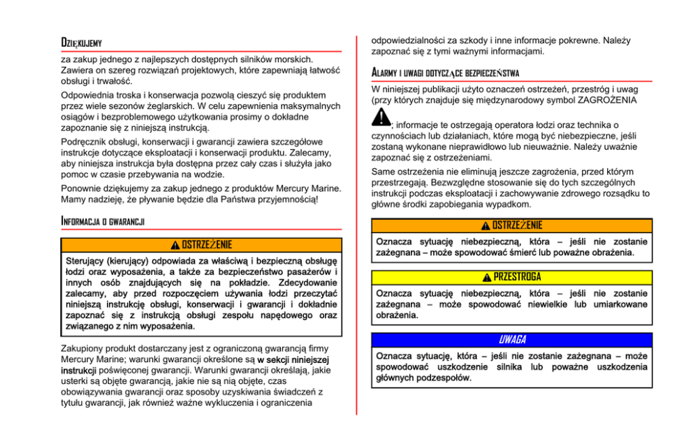 DZIĘKUJEMY za zakup jednego z najlepszych dostępnych silników morskich. Zawiera on szereg rozwiązań projektowych, które zapewniają łatwość obsługi i trwałość. Odpowiednia troska i konserwacja pozwolą cieszyć się produktem przez wiele sezonów żeglarskich. W celu zapewnienia maksymalnych osiągów i bezproblemowego użytkowania prosimy o dokładne zapoznanie się z niniejszą instrukcją. Podręcznik obsługi, konserwacji i gwarancji zawiera szczegółowe instrukcje dotyczące eksploatacji i konserwacji produktu. Zalecamy, aby niniejsza instrukcja była dostępna przez cały czas i służyła jako pomoc w czasie przebywania na wodzie. Ponownie dziękujemy za zakup jednego z produktów Mercury Marine. Mamy nadzieję, że pływanie będzie dla Państwa przyjemnością! INFORMACJA O GWARANCJI odpowiedzialności za szkody i inne informacje pokrewne. Należy zapoznać się z tymi ważnymi informacjami. ALARMY I UWAGI DOTYCZĄCE BEZPIECZEŃSTWA W niniejszej publikacji użyto oznaczeń ostrzeżeń, przestróg i uwag (przy których znajduje się międzynarodowy symbol ZAGROŻENIA ! ; informacje te ostrzegają operatora łodzi oraz technika o czynnościach lub działaniach, które mogą być niebezpieczne, jeśli zostaną wykonane nieprawidłowo lub nieuważnie. Należy uważnie zapoznać się z ostrzeżeniami. Same ostrzeżenia nie eliminują jeszcze zagrożenia, przed którym przestrzegają. Bezwzględne stosowanie się do tych szczególnych instrukcji podczas eksploatacji i zachowywanie zdrowego rozsądku to główne środki zapobiegania wypadkom. ! ! OSTRZEŻENIE Sterujący (kierujący) odpowiada za właściwą i bezpieczną obsługę łodzi oraz wyposażenia, a także za bezpieczeństwo pasażerów i innych osób znajdujących się na pokładzie. Zdecydowanie zalecamy, aby przed rozpoczęciem używania łodzi przeczytać niniejszą instrukcję obsługi, konserwacji i gwarancji i dokładnie zapoznać się z instrukcją obsługi zespołu napędowego oraz związanego z nim wyposażenia. Zakupiony produkt dostarczany jest z ograniczoną gwarancją firmy Mercury Marine; warunki gwarancji określone są w sekcji niniejszej instrukcji poświęconej gwarancji. Warunki gwarancji określają, jakie usterki są objęte gwarancją, jakie nie są nią objęte, czas obowiązywania gwarancji oraz sposoby uzyskiwania świadczeń z tytułu gwarancji, jak również ważne wykluczenia i ograniczenia OSTRZEŻENIE Oznacza sytuację niebezpieczną, która – jeśli nie zostanie zażegnana – może spowodować śmierć lub poważne obrażenia. ! PRZESTROGA Oznacza sytuację niebezpieczną, która – jeśli nie zostanie zażegnana – może spowodować niewielkie lub umiarkowane obrażenia. UWAGA Oznacza sytuację, która – jeśli nie zostanie zażegnana – może spowodować uszkodzenie silnika lub poważne uszkodzenia głównych podzespołów. WAŻNE: Oznacza informacje o znaczeniu krytycznym dla pomyślnego zakończenia zadania. UWAGA: Oznacza informacje, które pomogą zrozumieć dany krok lub czynność. ! OSTRZEŻENIE Spaliny tego silnika zawierają związki chemiczne, które w stanie Kalifornia uznawane są za substancje powodujące raka, wady wrodzone oraz w inny sposób szkodliwe dla rozrodu. SECTIONS INFORMACJE GWARANCY INFORMACJE OGÓ DANE TECHNIC PODRĘC CZYNNIKI WPŁYWAJĄCE NA EKSPLOATAC PRZECHOWYWANIE W NISKIEJ TEMPERATURZE LUB PRZEZ DŁUŻSZY C POMOC SERWISO DZIENNIK KONSERWA 90-8M0120050 STYCZEŃ 2016 i ii 90-8M0120050 STYCZEŃ 2016 1 - INFORMACJE GWARANCYJNE 1 - Informacje gwarancyjne Spis treści Rejestracja gwarancji w USA i Kanadzie . . . . . . . . . . . . . . . . . . . . . . . . 2 Przekazanie gwarancji . . . . . . . . . . . . . . . . . . . . . . . . . . . . . . . . 2 Ograniczona gwarancja roczna Mercury Racing . . . . . . . . . . . . . . . . . . . . 3 ZAKRES GWARANCJI . . . . . . . . . . . . . . . . . . . . . . . . . . . . . . . 3 OKRES OBOWIĄZYWANIA GWARANCJI . . . . . . . . . . . . . . . . . . . . . . . 3 WARUNKI JAKIE NALEŻY SPEŁNIĆ, ABY OTRZYMAĆ GWARANCJĘ . . . . . . . . . . 3 OBOWIĄZKI FIRMY MERCURY . . . . . . . . . . . . . . . . . . . . . . . . . . . 3 JAK OTRZYMAĆ GWARANCJĘ . . . . . . . . . . . . . . . . . . . . . . . . . . 4 GWARANCJA NIE OBEJMUJE . . . . . . . . . . . . . . . . . . . . . . . . . . . 4 Produkty sprzedawane agencjom rządowym . . . . . . . . . . . . . . . . . . . . . . 5 Gwarancja ograniczona na uszkodzenia spowodowane korozją (ogólnoświatowa) . . . . . 5 Zakres gwarancji i wyjątki dotyczące napędów rufowych Mercury Racing . . . . . . . . . 5 OGÓLNE WYŁĄCZENIA GWARANCJI . . . . . . . . . . . . . . . . . . . . . . . . 6 Oświadczenie gwarancyjne wynikające z przepisów o ochronie środowiska Stanu Kalifornia . . . . . . . . . . . . . . . . . . . . . . . . . . . . . . . . . . . . . . . . . .7 Wprowadzenie . . . . . . . . . . . . . . . . . . . . . . . . . . . . . . . . . 7 Zakres gwarancji . . . . . . . . . . . . . . . . . . . . . . . . . . . . . . . . 7 Czas obowiązywania gwarancji . . . . . . . . . . . . . . . . . . . . . . . . . . 8 Jak uzyskać świadczenie gwarancyjne . . . . . . . . . . . . . . . . . . . . . . 8 Obowiązki firmy Mercury Racing . . . . . . . . . . . . . . . . . . . . . . . . . 8 Czego nie obejmuje gwarancja . . . . . . . . . . . . . . . . . . . . . . . . . . 9 Wykluczenie odpowiedzialności i ograniczenia . . . . . . . . . . . . . . . . . . . 9 Oświadczenie gwarancyjne wynikające z przepisów o ochronie środowiska Stanu Kalifornia . . . . . . . . . . . . . . . . . . . . . . . . . . . . . . . . . . . . . . . . . 10 Prawa i obowiązki wynikające z gwarancji . . . . . . . . . . . . . . . . . . . . . 10 Gwarancja producenta . . . . . . . . . . . . . . . . . . . . . . . . . . . . . 10 Odpowiedzialność gwarancyjna właściciela . . . . . . . . . . . . . . . . . . . . 10 E.P.A. Kontrola emisji . . . . . . . . . . . . . . . . . . . . . . . . . . . . . . . . 11 Wprowadzenie . . . . . . . . . . . . . . . . . . 