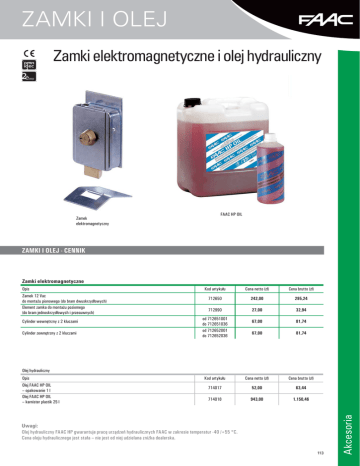 ZAMKI I OLEJ Zamki elektromagnetyczne i olej hydrauliczny Zamek elektromagnetyczny FAAC HP OIL ZAMKI I OLEJ - CENNIK Zamki elektromagnetyczne Opis Zamek 12 Vac do montażu pionowego (do bram dwuskrzydłowych) Element zamka do montażu poziomego (do bram jednoskrzydłowych i przesuwnych) Cylinder wewnętrzny z 2 kluczami Cylinder zewnętrzny z 2 kluczami Kod artykułu Cena netto (zł) Cena brutto (zł) 712650 242,00 295,24 712990 27,00 32,94 67,00 81,74 67,00 81,74 Kod artykułu Cena netto (zł) Cena brutto (zł) 714017 52,00 63,44 714018 943,00 1.150,46 od 712651001 do 712651036 od 712652001 do 712652036 Opis Olej FAAC HP OIL – opakowanie 1 l Olej FAAC HP OIL – karnister plastik 25 l Uwagi: Olej hydrauliczny FAAC HP gwarantuje pracę urządzeń hydraulicznych FAAC w zakresie temperatur -40 /+55 °C. Cena oleju hydraulicznego jest stała – nie jest od niej udzielana zniżka dealerska. 113 Akcesoria Olej hydrauliczny