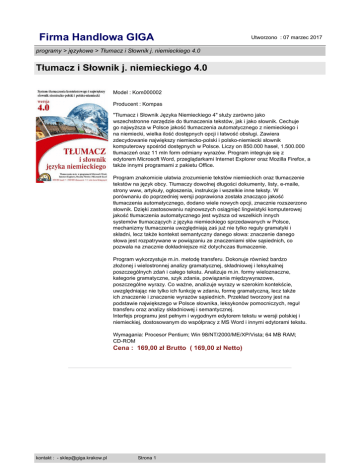 Firma Handlowa GIGA Utworzono : 07 marzec 2017 programy > językowe > Tłumacz i Słownik j. niemieckiego 4.0 Tłumacz i Słownik j. niemieckiego 4.0 Model : Kom000002 Producent : Kompas "Tłumacz i Słownik Języka Niemieckiego 4" służy zarówno jako wszechstronne narzędzie do tłumaczenia tekstów, jak i jako słownik. Cechuje go najwyższa w Polsce jakość tłumaczenia automatycznego z niemieckiego i na niemiecki, wielka ilość dostępnych opcji i łatwość obsługi. Zawiera zdecydowanie największy niemiecko-polski i polsko-niemiecki słownik komputerowy spośród dostępnych w Polsce. Liczy on 850.000 haseł, 1.500.000 tłumaczeń oraz 11 mln form odmiany wyrazów. Program integruje się z edytorem Microsoft Word, przeglądarkami Internet Explorer oraz Mozilla Firefox, a także innymi programami z pakietu Office. Program znakomicie ułatwia zrozumienie tekstów niemieckich oraz tłumaczenie tekstów na język obcy. Tłumaczy dowolnej długości dokumenty, listy, e-maile, strony www, artykuły, ogłoszenia, instrukcje i wszelkie inne teksty. W porównaniu do poprzedniej wersji poprawiona została znacząco jakość tłumaczenia automatycznego, dodano wiele nowych opcji, znacznie rozszerzono słownik. Dzięki zastosowaniu najnowszych osiągnięć lingwistyki komputerowej jakość tłumaczenia automatycznego jest wyższa od wszelkich innych systemów tłumaczących z języka niemieckiego sprzedawanych w Polsce, mechanizmy tłumaczenia uwzględniają zaś już nie tylko reguły gramatyki i składni, lecz także kontekst semantyczny danego słowa: znaczenie danego słowa jest rozpatrywane w powiązaniu ze znaczeniami słów sąsiednich, co pozwala na znacznie dokładniejsze niż dotychczas tłumaczenie. Program wykorzystuje m.in. metodę transferu. Dokonuje również bardzo złożonej i wielostronnej analizy gramatycznej, składniowej i leksykalnej poszczególnych zdań i całego tekstu. Analizuje m.in. formy wieloznaczne, kategorie gramatyczne, szyk zdania, powiązania międzywyrazowe, poszczególne wyrazy. Co ważne, analizuje wyrazy w szerokim kontekście, uwzględniając nie tylko ich funkcję w zdaniu, formę gramatyczną, lecz także ich znaczenie i znaczenie wyrazów sąsiednich. Przekład tworzony jest na podstawie największego w Polsce słownika, leksykonów pomocniczych, reguł transferu oraz analizy składniowej i semantycznej. Interfejs programu jest pełnym i wygodnym edytorem tekstu w wersji polskiej i niemieckiej, dostosowanym do współpracy z MS Word i innymi edytorami tekstu. Wymagania: Procesor Pentium; Win 98/NT/2000/ME/XP/Vista; 64 MB RAM; CD-ROM Cena : 169,00 zł Brutto ( 169,00 zł Netto) kontakt : - [email protected] Strona 1