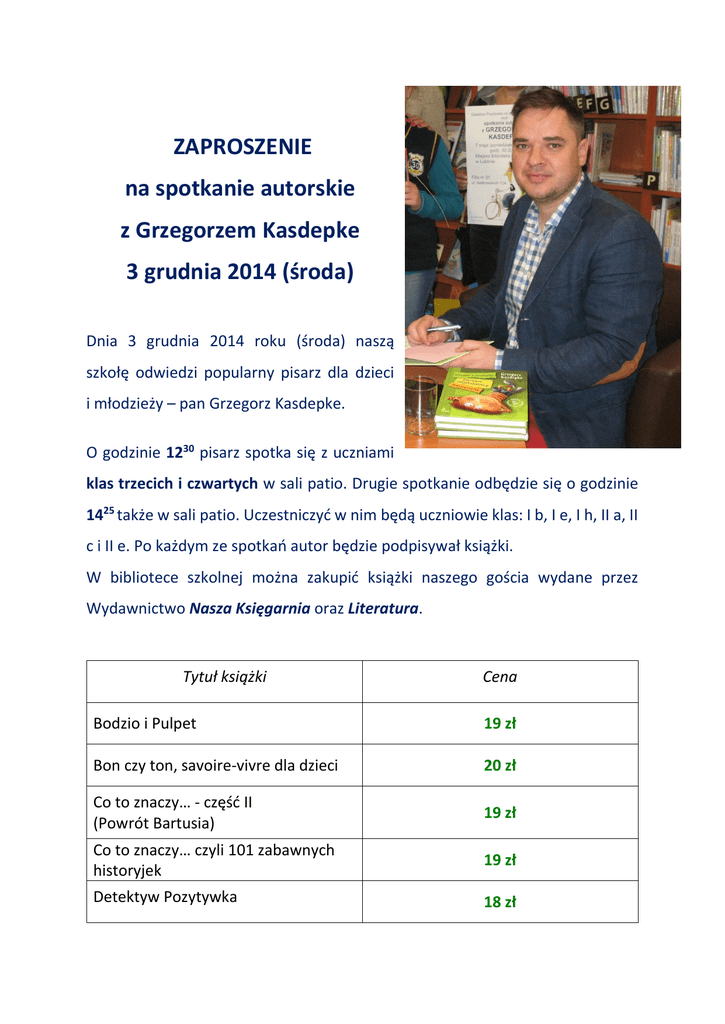 ZAPROSZENIE na spotkanie autorskie z Grzegorzem Kasdepke 3 grudnia 2014 (środa) Dnia 3 grudnia 2014 roku (środa) naszą szkołę odwiedzi popularny pisarz dla dzieci i młodzieży – pan Grzegorz Kasdepke. O godzinie 1230 pisarz spotka się z uczniami klas trzecich i czwartych w sali patio. Drugie spotkanie odbędzie się o godzinie 1425 także w sali patio. Uczestniczyć w nim będą uczniowie klas: I b, I e, I h, II a, II c i II e. Po każdym ze spotkań autor będzie podpisywał książki. W bibliotece szkolnej można zakupić książki naszego gościa wydane przez Wydawnictwo Nasza Księgarnia oraz Literatura. Tytuł książki Cena Bodzio i Pulpet 19 zł Bon czy ton, savoire-vivre dla dzieci 20 zł Co to znaczy… - część II (Powrót Bartusia) 19 zł Co to znaczy… czyli 101 zabawnych historyjek 19 zł Detektyw Pozytywka 18 zł Do trzech odlicz! 17 zł Drużyna pani Miłki, czyli o szacunku, odwadze i innych wartościach 18 zł Fochy fortuny 19 zł Grzegorz Kasdepke dzieciom 35 zł Horror! czyli skąd się biorą dzieci 15 zł Inżynier Ciućma, czyli śrubka, młotek i przemądrzałe roboty 19 zł Mity dla dzieci 26 zł Nowe kłopoty detektywa Pozytywki 18 zł Opowieści biblijne 35 zł Pamiątki detektywa Pozytywki 18 zł Potworak i inne ko(s)miczne opowieści Tylko bez całowania! Czyli jak sobie radzić z niektórymi emocjami 19 zł 19 zł Wakacje detektywa Pozytywki 18 zł Wielka księga detektywa Pozytywki 35 zł Wielka księga uczuć (cz. I – IV) 33 zł Zestaw jubileuszowy (Co to znaczy cz. I i cz. II) Zestaw urodzinowy (Kacperiada… oraz Kacper z szuflady) 30 zł 26 zł AUDIOBOOKI Drużyna pani Miłki, czyli o szacunku, odwadze i innych wartościach 14 zł Horror! czyli skąd się biorą dzieci 14 zł Kocha, lubi, szanuje, czyli jeszcze o uczuciach 14 zł Mity greckie dla dzieci 18 zł Niezwykłe przygody detektywa Pozytywki Tylko bez całowania! Czyli jak sobie radzić z niektórymi emocjami Serdecznie zapraszamy! 21 zł 14 zł
