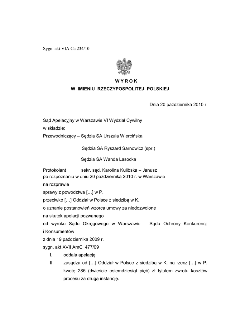 Sygn. akt VIA Ca 234/10 WYROK W IMIENIU RZECZYPOSPOLITEJ POLSKIEJ Dnia 20 października 2010 r. Sąd Apelacyjny w Warszawie VI Wydział Cywilny w składzie: Przewodniczący – Sędzia SA Urszula Wiercińska Sędzia SA Ryszard Sarnowicz (spr.) Sędzia SA Wanda Lasocka Protokolant sekr. sąd. Karolina Kulibska – Janusz po rozpoznaniu w dniu 20 października 2010 r. w Warszawie na rozprawie sprawy z powództwa […] w P. przeciwko […] Oddział w Polsce z siedzibą w K. o uznanie postanowień wzorca umowy za niedozwolone na skutek apelacji pozwanego od wyroku Sądu Okręgowego w Warszawie – Sądu Ochrony Konkurencji i Konsumentów z dnia 19 października 2009 r. sygn. akt XVII AmC 477/09 I. oddala apelację; II. zasądza od […] Oddział w Polsce z siedzibą w K. na rzecz […] w P. kwotę 285 (dwieście osiemdziesiąt pięć) zł tytułem zwrotu kosztów procesu za drugą instancję. 2 Sygn. akt VI ACa 234/10 UZASADNIENIE Powód – […] w P. wniósł pozew przeciwko […] S.A. w K. o uznanie za niedozwolone postanowienia o treści: „Wszelkie zastrzeżenia co do ilości zgromadzonych punktów Uczestnik zobowiązany jest zgłosić, kontaktując się z Centrum Obsługi Klienta w ciągu 7 dni od dnia reklamowanego zapisu punktów. Po upływie terminu określonego powyżej reklamacje nie będą uwzględniane” zawartego we wzorcu umownym o nazwie Regulamin programu […]” pkt VI.6., albowiem w sposób sprzeczny z prawem nakłada na konsumentów uciążliwości związane ze składaniem reklamacji, w tym zwłaszcza przewiduje rażąco krótki (7 dni) termin na składanie reklamacji. Pozwana […] S.A. w K. (obecnie […] Oddział w Polsce z siedzibą w K.) w odpowiedzi na pozew wniosła o oddalenie powództwa i zarzuciła, że postanowienia „Regulaminu programu […]", to postanowienia stanowiące jednostronne oświadczenie woli - przyrzeczenie publiczne, do których nie mają zastosowania art. 384-385 kc. Pozwana podniosła także, zakwestionowane postanowienie nie narusza dobrych obyczajów, ani rażąco nie narusza interesów konsumentów, albowiem ustalenie przez pozwaną terminu do zgłoszenia reklamacji jest jej zwykłym uprawnieniem wynikającym z istoty jednostronnego zobowiązania. Dopuszczenie zaś kwestionowania ilości naliczanych punktów niemal w nieskończoność byłoby nieracjonalne i w istocie zniweczyłoby cały projekt. W ocenie pozwanej pozostawienie niepewności w tym zakresie nie jest ani ekonomicznie ani prawnie uzasadnione. Zakwestionowane postanowienie nie godzi w konsumenta również dlatego, bowiem zna on od momentu 3 przystąpienia do Programu zasady rządzące reklamacją zapisu punktów, które zostały jasno i przejrzyście sformułowane. Wyrokiem z dnia 19 października 2009 roku Sąd Okręgowy – Sąd Ochrony Konkurencji i Konsumentów, w sprawie o sygnaturze XVII AmC 477/09, uznał za niedozwolone i zakazał wykorzystywania […] S.A. w K. w obrocie z konsumentami postanowienia wzorca umowy o nazwie „Regulamin" pkt VI.6. o treści: „Wszelkie zastrzeżenia co do ilości zgromadzonych punktów Uczestnik zobowiązany jest zgłosić, kontaktując się z Centrum Obsługi Klienta w ciągu 7 dni od dnia reklamowanego zapisu punktów. Po upływie terminu określonego powyżej reklamacje nie będą uwzględniane", zasądził od pozwanego na rzecz powoda kwotę 360 złotych tytułem kosztów zastępstwa procesowego, nakazał pobranie od pozwanego na rzecz Skarbu Państwa (Kasy Sądu Okręgowego w Warszawie) kwoty 600 złotych tytułem opłaty od pozwu, od uiszczenia której powód był zwolniony oraz zarządził publikację prawomocnego wyroku w Monitorze Sądowym i Gospodarczym na koszt pozwanego. Podstawą rozstrzygnięcia Sądu Okręgowego były następujące ustalenia: Pozwana – […] SA w K. prowadzi działalność gospodarczą polegającą między innymi na sprzedaży detalicznej i hurtowej paliw oraz detalicznej sprzedaży towarów na stacjach paliw […]. Oferuje także kupującym paliwa i towary na stacjach paliw […] udział w Programie […]. Warunki uczestnictwa w w/w Programie zamieszczone zostały w Regulaminie Programu oraz Katalogu Internetowym i Katalogu dostępnym na stacjach paliw. Wskazany Regulamin Programu […] określa zaś warunki 4 przystąpienia do programu, ogólne zasady programu, rejestrację, utratę i wymianę karty, gromadzenie punktów i ich realizację oraz reklamacje, a także postanowienia przejściowe i końcowe. Regulamin Programu […] reguluje zatem ogólne zasady i warunki uczestnictwa w programie. Skierowany jest wyłącznie do klientów stacji paliw […] - wynika to bowiem wyraźnie z pkt II.1. Regulaminu, który stanowi, iż „Regulamin niniejszy określa zasady udziału w organizowanym przez […] programie, skierowanym do klientów stacji paliw […]" oraz z treści reklamy zamieszczonej na stronie internetowej pozwanej Programu […] o treści „zobacz jak zbierać punkty za zakupy na stacjach paliw". Przystąpienie do Programu następuje przez wypełnienie na stronie internetowej pozwanej lub na stacji paliw formularza, w którym określane są dane osobowe klienta. Centrum Obsługi klienta podejmuje zaś decyzję o uwzględnieniu lub nieuwzględnieniu zgłoszenia. Po uwzględnieniu zgłoszenia klient otrzymuje kartę, za pomocą której gromadzi punkty. Katalog internetowy i Katalog dostępny na stacjach paliw zawierają pisemne listy towarów i usług oferowanych do sprzedaży na stacjach paliw BP. W w/w katalogach zamieszczone zostały konkretne dane określające ile punktów można otrzymać za zakupiony konkretny towar lub wykonaną usługę na stacji paliw […], np. 2 litry paliwa - 3 punkty, za usługę mycia (program brązowy) - 30 punktów, itd. Katalog zawiera też listę nagród za zbierane punkty, oraz przelicznik, według którego uczestnik gromadzi punkty, a także przelicznik, według którego realizuje punkty w ramach Programu, np. lalka Barbie za zebranie 1950 punktów. Na podst