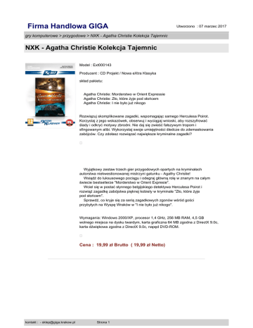 Firma Handlowa GIGA Utworzono : 07 marzec 2017 gry komputerowe > przygodowe > NXK - Agatha Christie Kolekcja Tajemnic NXK - Agatha Christie Kolekcja Tajemnic Model : Ext000143 Producent : CD Projekt / Nowa eXtra Klasyka skład pakietu: Agatha Christie: Morderstwo w Orient Expressie Agatha Christie: Zło, które żyje pod słońcem Agatha Christie: I nie było już nikogo Rozwiązuj skomplikowane zagadki, wspomagając samego Herculesa Poirot. Korzystaj z jego wskazówek, obserwuj i wyciągaj wnioski, aby rozszyfrować ślady i odkryć motywy zbrodni. Nie daj się zwieść fałszywym tropom i sfingowanym alibi. Wykorzystaj swoje umiejętności śledcze do zdemaskowania zabójców. Czy zdołasz rozwiązać największe kryminalne zagadki? � Wyjątkowy zestaw trzech gier przygodowych opartych na kryminałach autorstwa niekwestionowanej mistrzyni gatunku - Agathy Christie! Wsiądź do luksusowego pociągu i odegraj główną rolę w znanym na całym świecie bestsellerze "Morderstwo w Orient Expresie". Wciel się w postać słynnego belgijskiego detektywa Herculesa Poirot i rozwiąż zagadkę zabójstwa pięknej kobiety w kryminale "Zło, które żyje pod słońcem". Sprawdź, co kryje się za serią zagadkowych zgonów wśród gości przybyłych na Wyspę Wraków w "I nie było już nikogo". Wymagania: Windows 2000/XP, procesor 1,4 GHz, 256 MB RAM, 4,5 GB wolnego miejsca na dysku twardym, karta graficzna 64 MB zgodna z DirectX 9.0c, karta dźwiękowa zgodna z DirectX 9.0c, napęd DVD-ROM. � Cena : 19,99 zł Brutto ( 19,99 zł Netto) kontakt : - [email protected] Strona 1